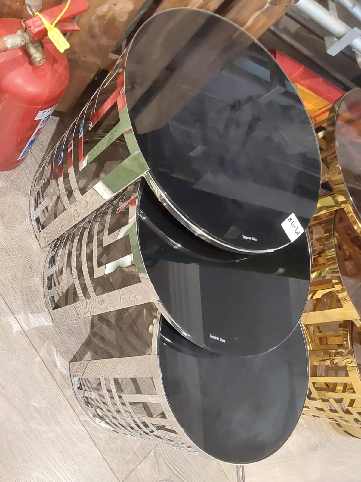The distinctive bases of these tables are crafted from polished metal, showcasing a bold geometric pattern that exudes contemporary style. The intricate design incorporates angular shapes that artfully intertwine, providing a sense of movement and visual interest. This dynamic base contrasts elegantly with the smoothness of the tabletop, making the tables not just functional pieces but also artistic statements that enhance the overall decor.