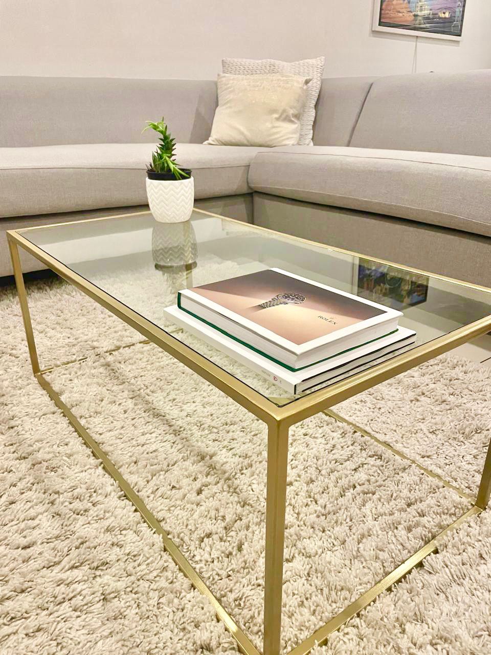 This elegant coffee table features a sleek glass top and a chic gold frame, making it a stunning centerpiece for any living room. Styled with curated books and a decorative plant, it adds a touch of sophistication and warmth to your space. Perfect for both functionality and aesthetic appeal, this table complements modern and minimalist interiors alike.