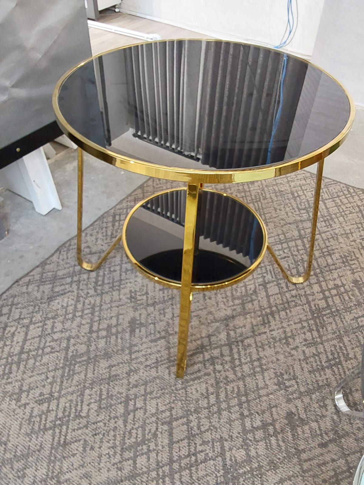 The table is supported by a sleek, gold-finished metal frame that offers both durability and a touch of luxury. The slender legs taper gracefully to the ground, enhancing the table’s airy feel while ensuring stability. The gold finish creates a warm and inviting contrast against the dark glass, making it an eye-catching addition to any living room, bedroom, or office space.