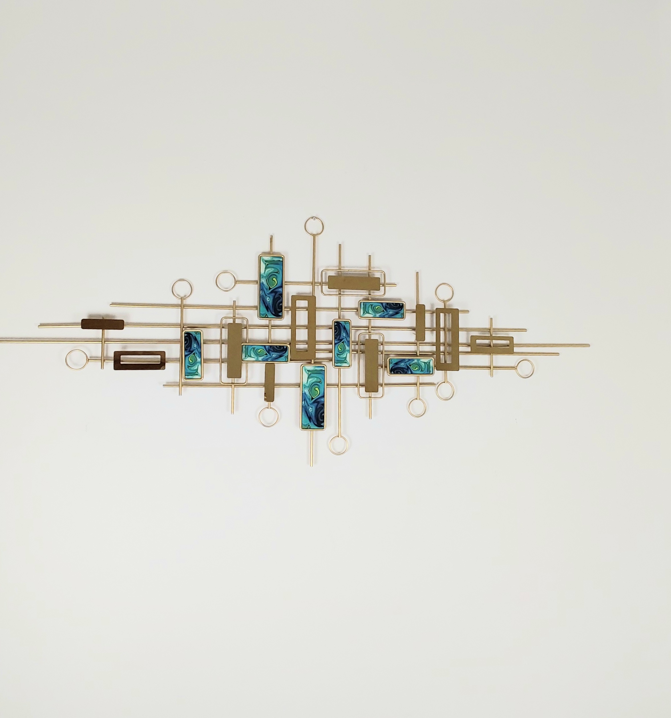 This is a decorative wall art piece featuring an abstract design. The structure is composed of a series of intersecting horizontal and vertical metallic rods arranged in a geometric pattern. Interspersed within this framework are rectangular elements that seem to be made of a turquoise and blue material, adding a splash of color to the piece. Circular metallic rings are also integrated into the design, creating an additional layer of visual interest. The overall theme of the artwork appears to emphasize a modern, contemporary aesthetic with a blend of geometrical shapes and bold accents, making it a distinctive focal point for any room.