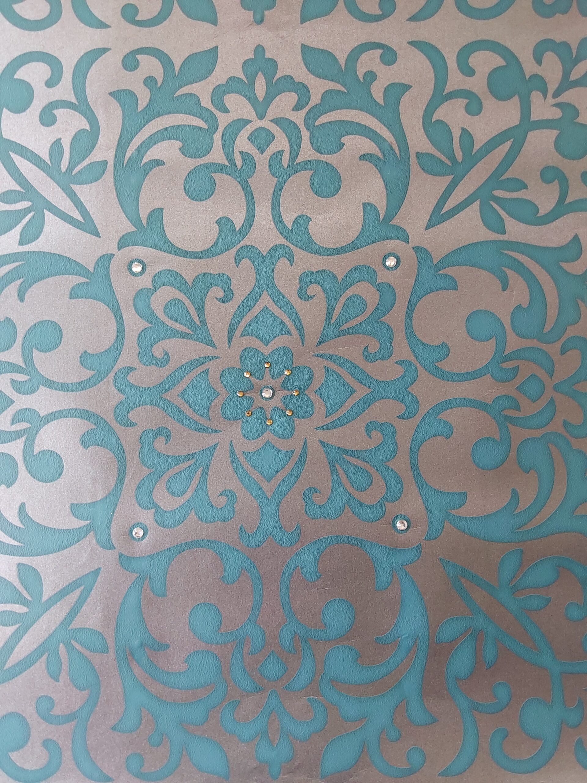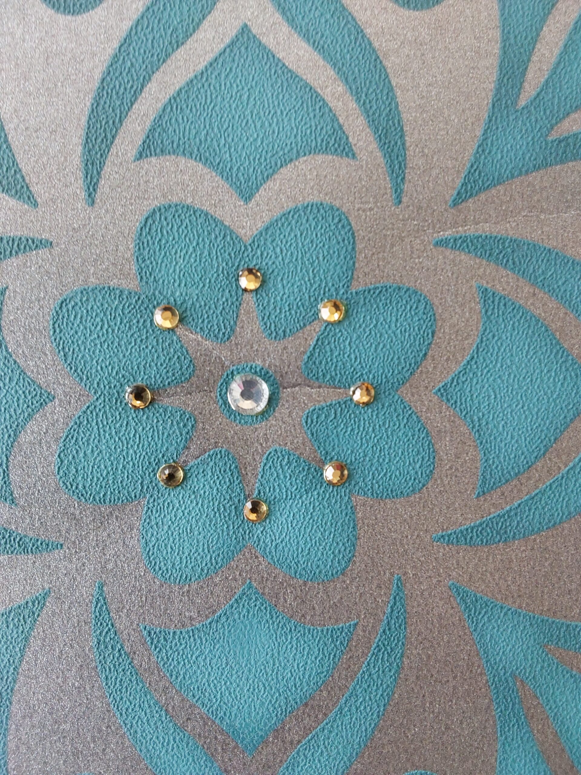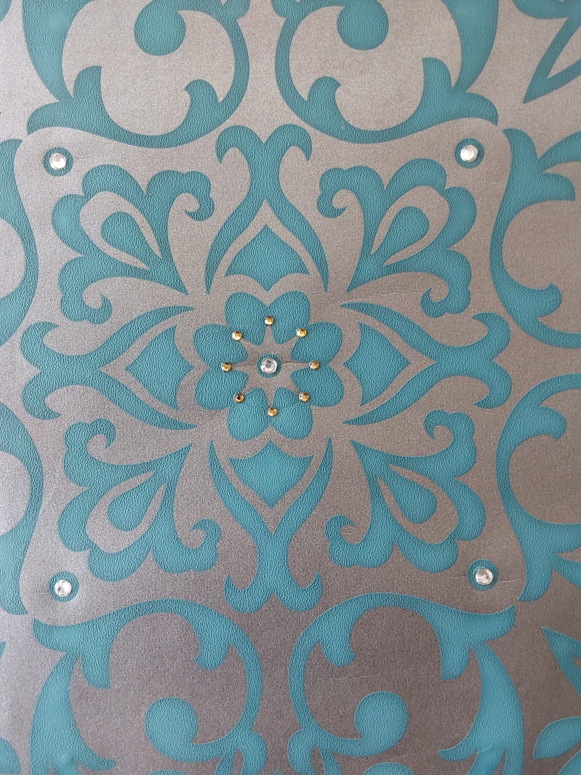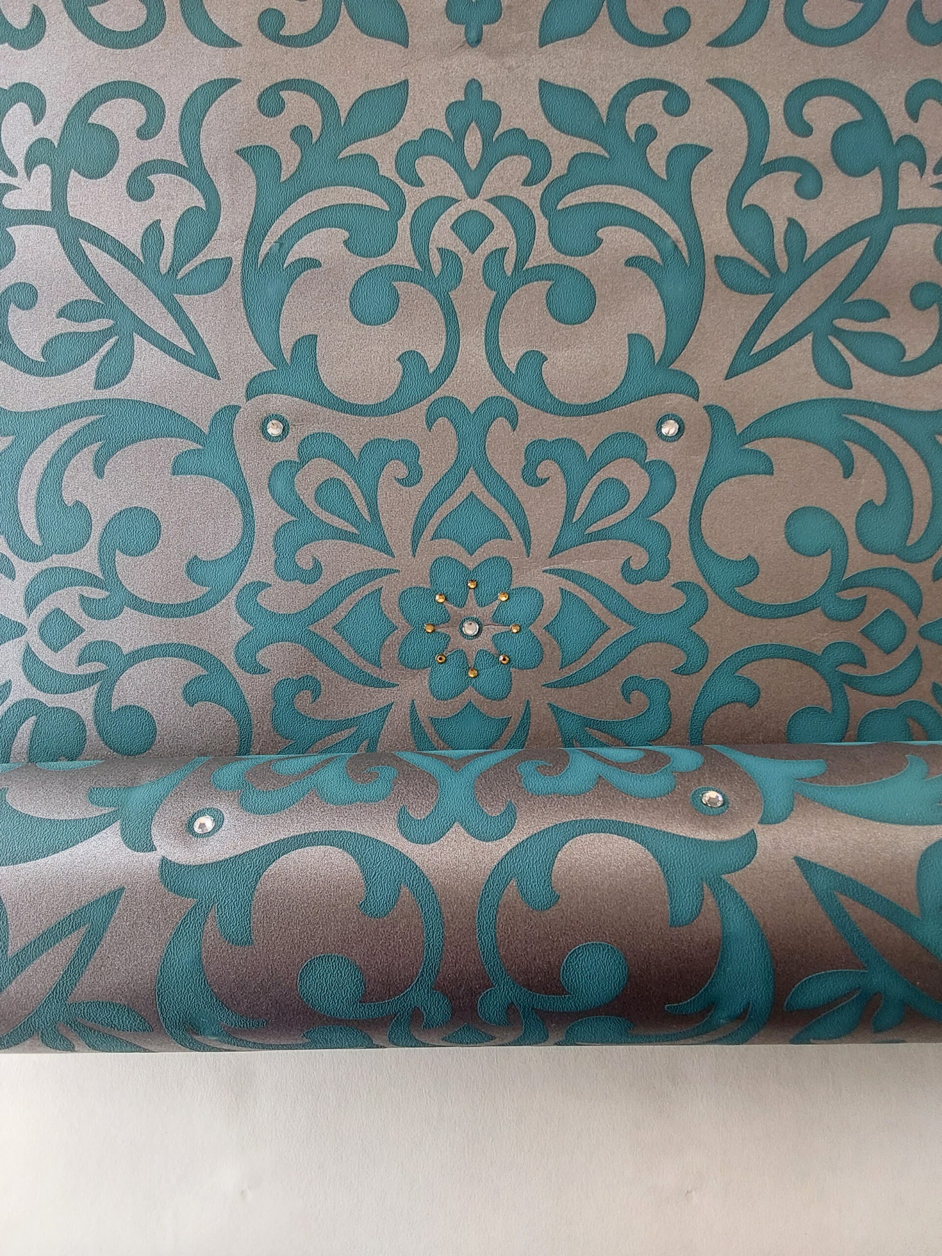 This wallpaper features an elegant floral design centered around a larger gem-like accent surrounded by smaller, shimmering gems. The base color is a vibrant turquoise, complemented by a metallic silver pattern that enhances the overall aesthetic. The interplay of textures and the sparkle of the embellishments give it a sophisticated and luxurious feel, making it suitable for chic interior spaces.