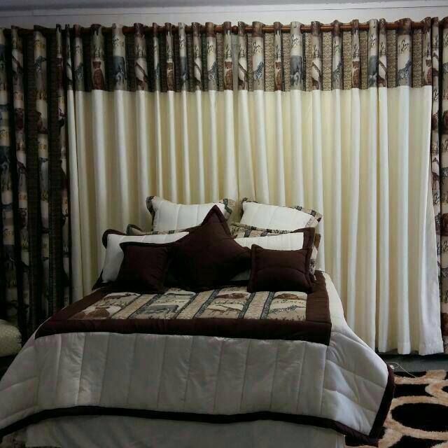 This eyelet curtain features a two-tone design with a patterned upper section in earthy tones and a solid light-colored lower section. Mounted on a wooden rod, its pleated top provides a neat, structured look, blending traditional motifs with a neutral palette for a versatile and classic appearance.