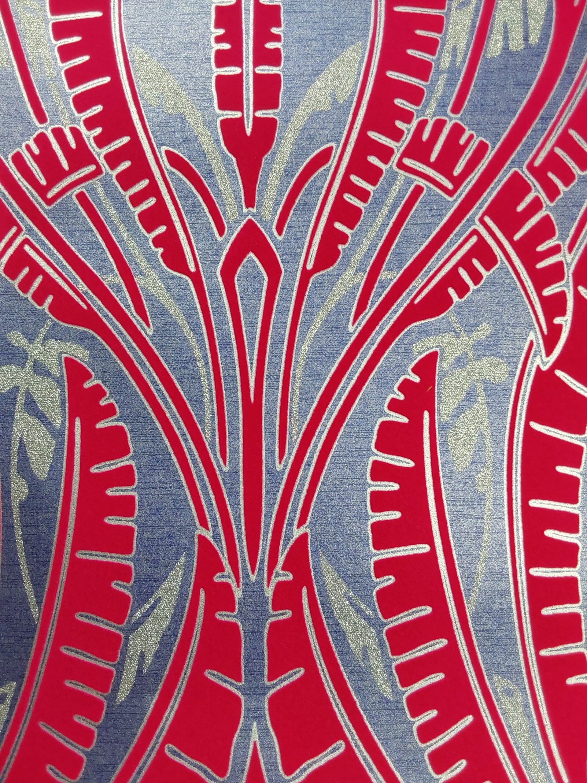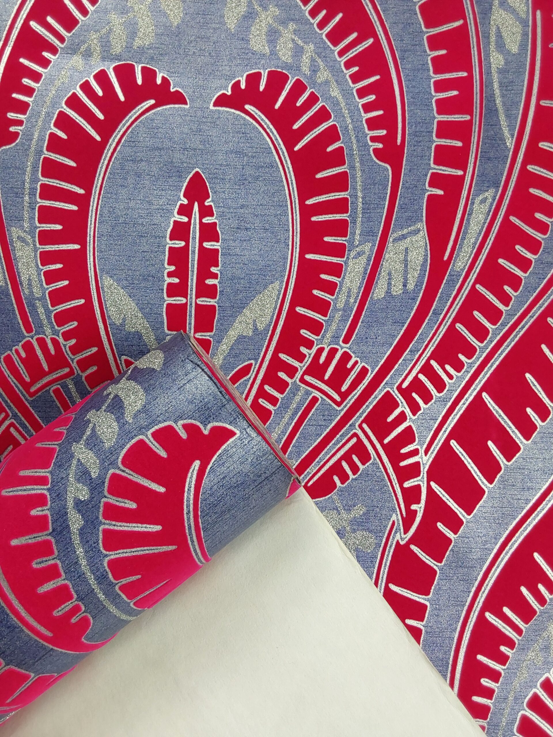 This wallpaper features a vibrant design with bold elements. The background is a soft blue that adds a calm touch, while the main motifs are in striking shades of red. The patterns resemble tropical leaves or floral shapes, enhanced by sparkly silver accents that add a sense of depth and elegance. The combination of colors and textures creates a lively and cheerful atmosphere, making it perfect for brightening up a space.