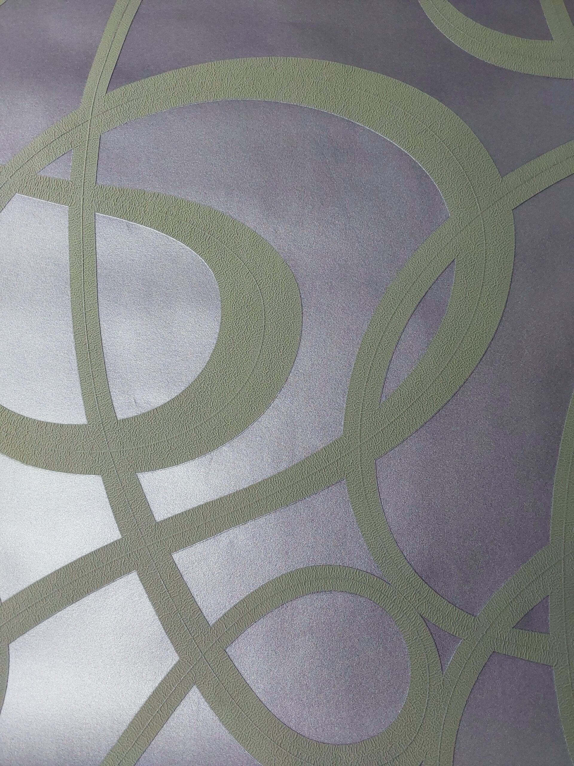 The wallpaper features a modern, geometric design with interwoven patterns. The background has a metallic or textured finish in a muted gray tone, while the lines forming the loops are in a soft olive green. This combination of colors creates a stylish and contemporary look, suitable for various interior spaces. The design adds depth and visual interest without overwhelming the decor.