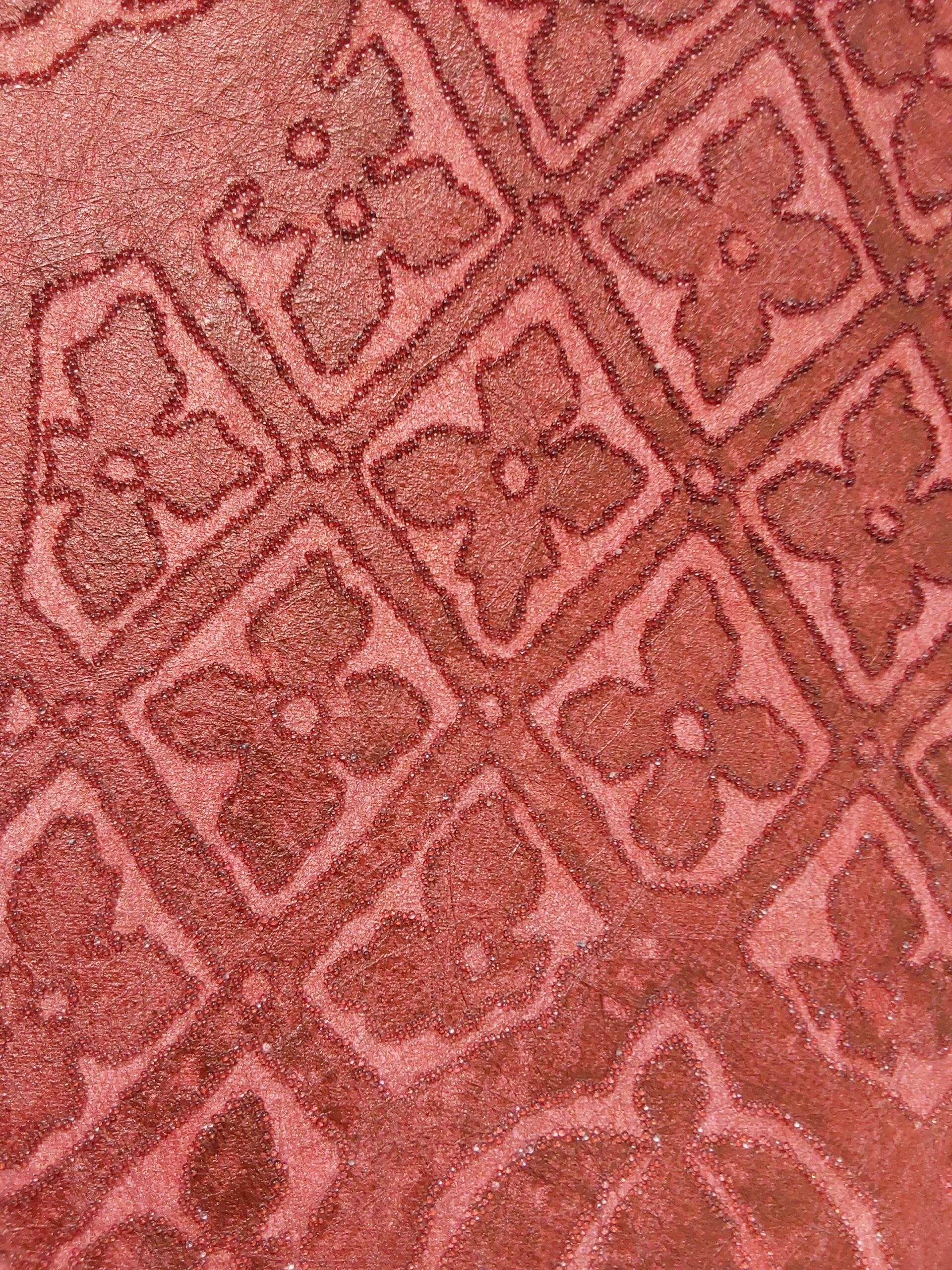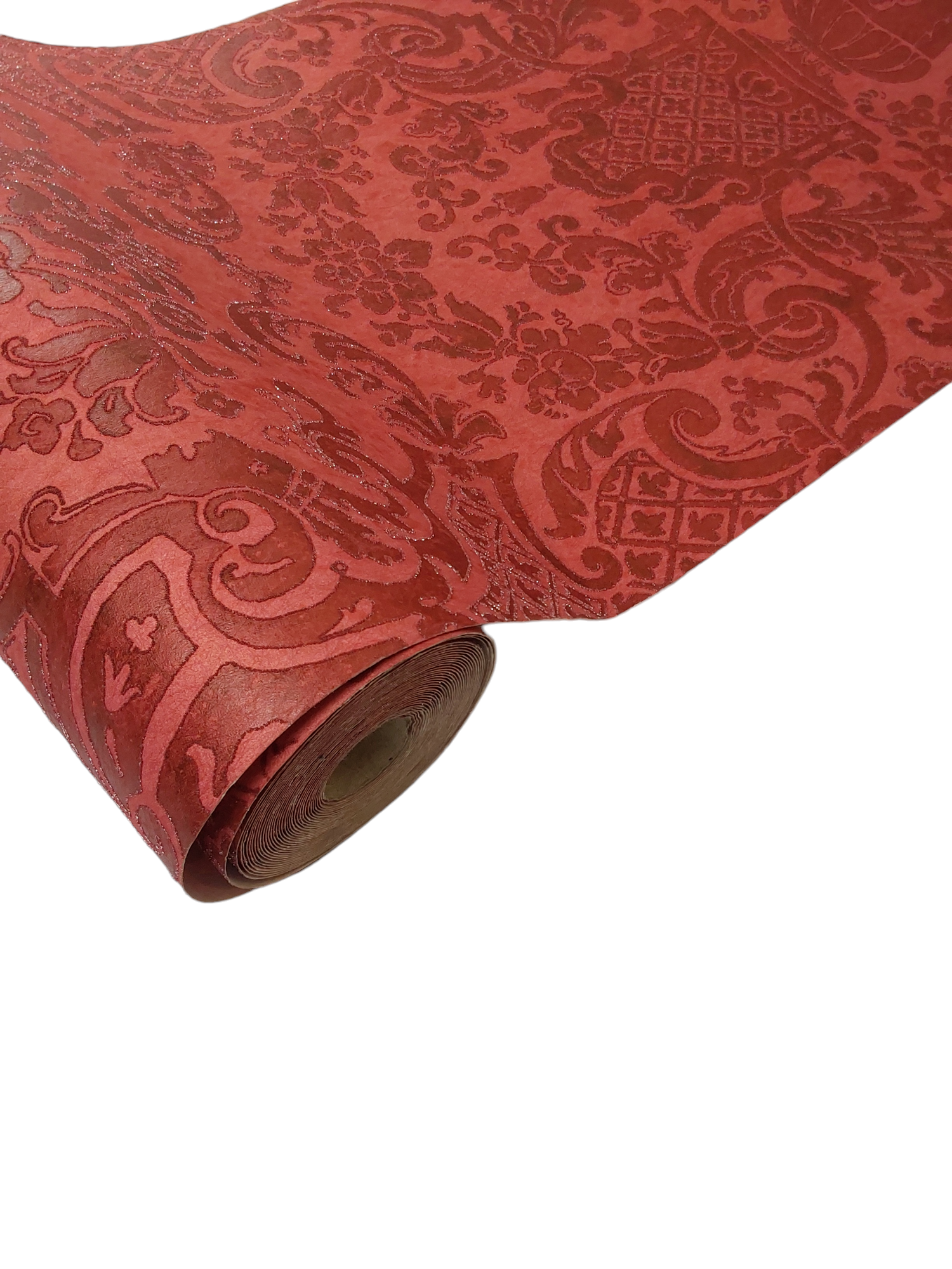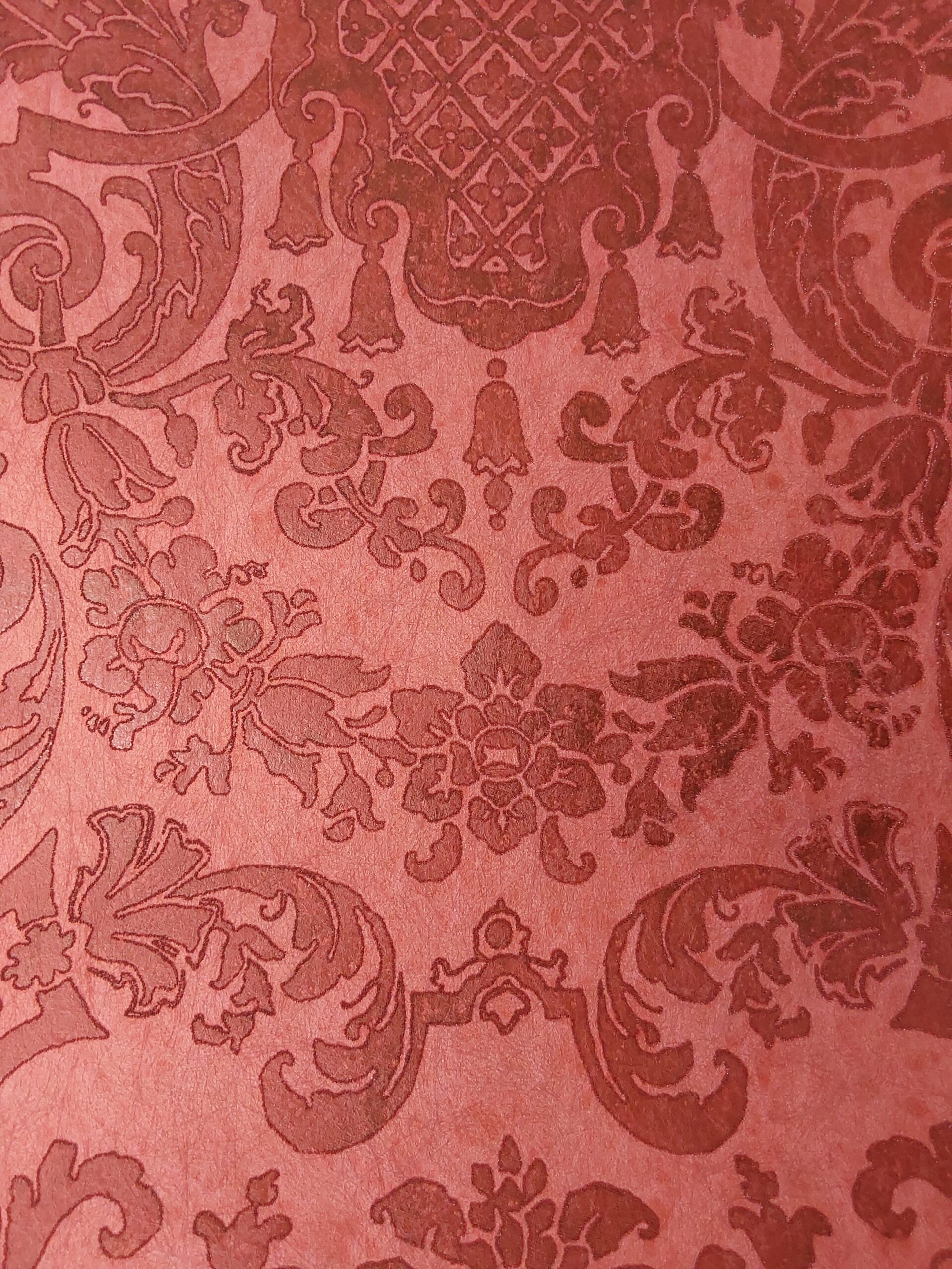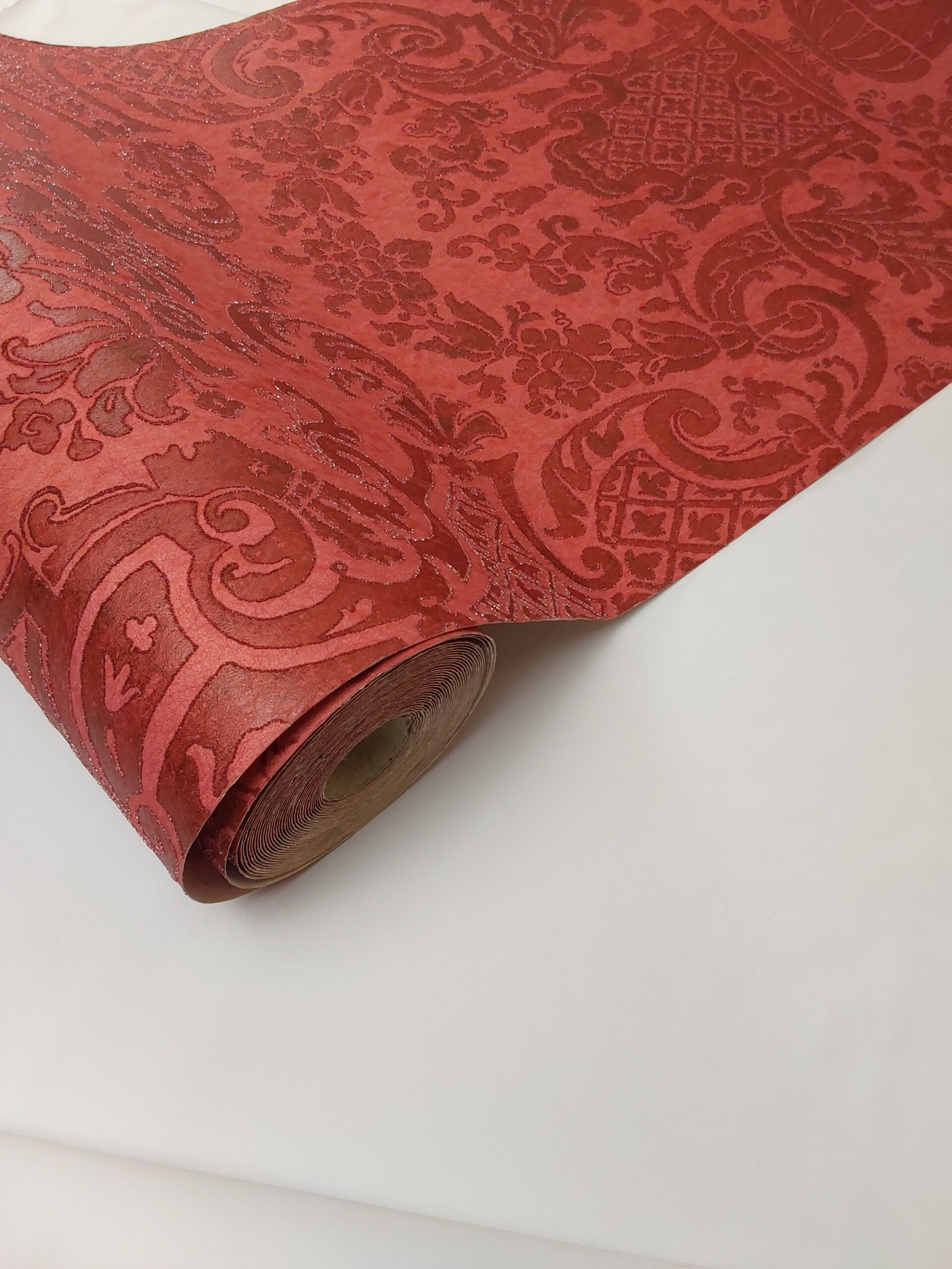 This wallpaper features an elegant, rich red design with intricate patterns, showcasing a classic damask style. The textured fabric adds depth, making it perfect for adding a touch of sophistication to interiors.