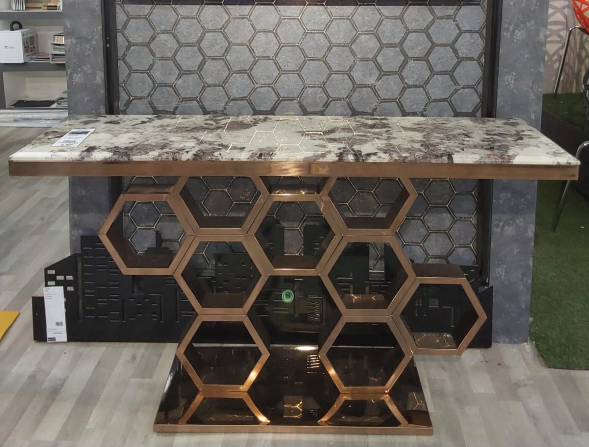 Beneath the marble top, the table’s base is a striking structure formed by interlocking hexagonal shapes in a polished rose gold finish. This contemporary design introduces a sense of depth and artistry, making it much more than a typical piece of furniture. The geometric pattern also contributes to a light and airy feel, allowing the eye to traverse the intricate design while lending a modern touch to the overall decor.