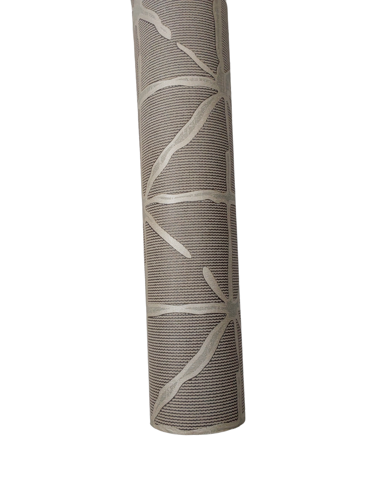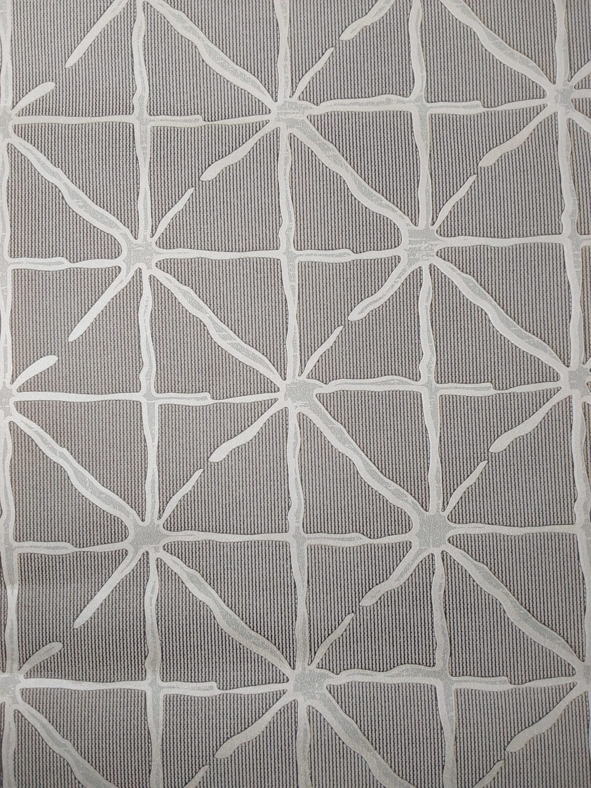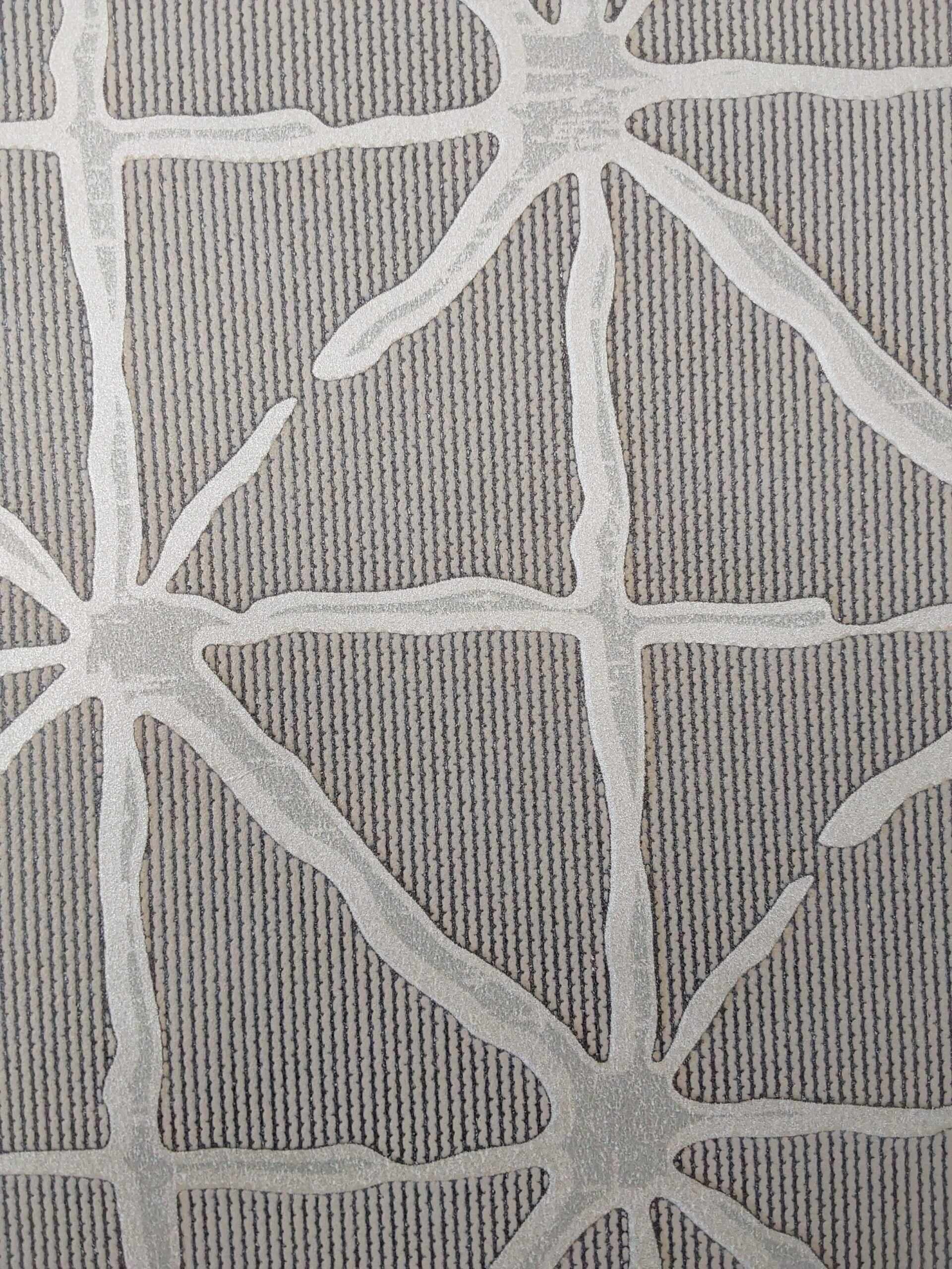 This wallpaper features a modern and contemporary design with a subtle yet striking pattern. The background is a neutral tone with fine vertical lines that add texture. Overlaying this are abstract, organic shapes reminiscent of branching or vines, rendered in a light, metallic hue. The overall effect is elegant and sophisticated, making it suitable for a variety of interior styles, from minimalist to eclectic. It could add a touch of modernity to a living space or accent wall.