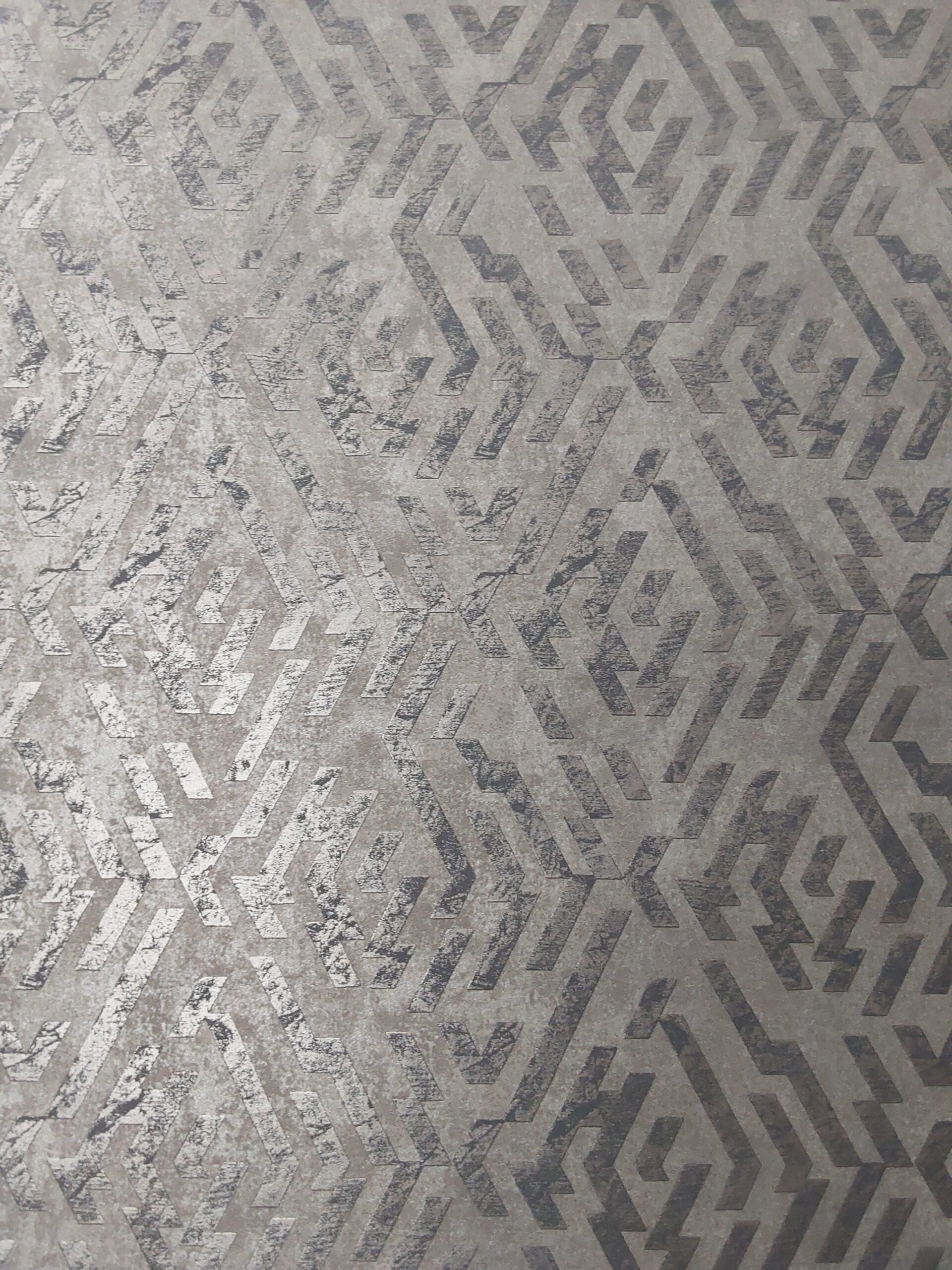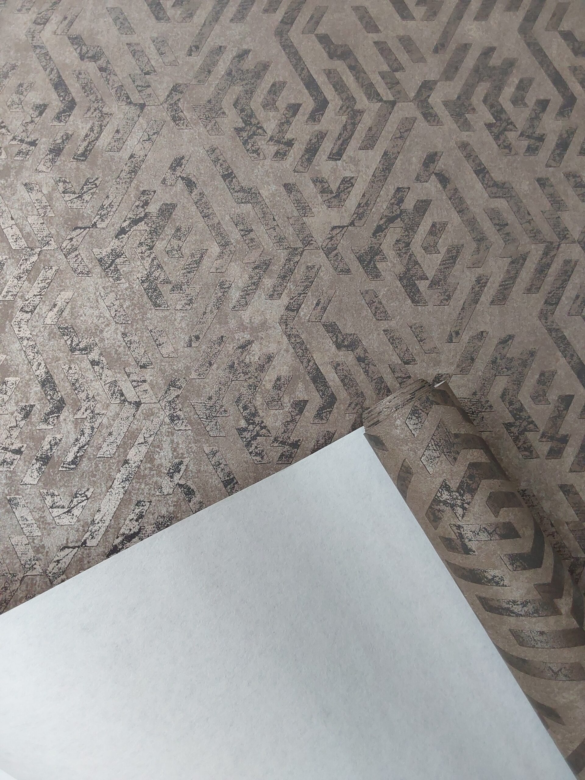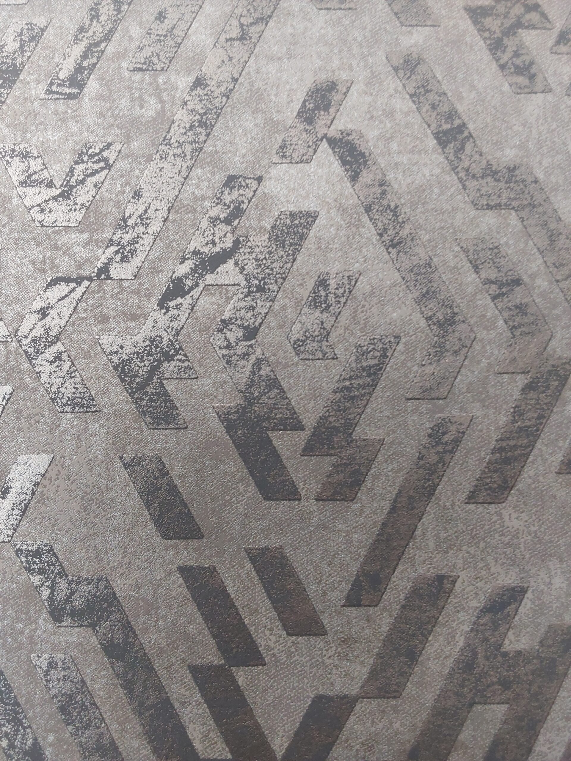 This wallpaper features a striking geometric pattern that combines bold lines and shapes to create a dynamic visual effect. The neutral color palette, characterized by muted browns and grays, adds a touch of sophistication and subtle elegance. The textured finish gives depth to the design, making it suitable for modern interiors. Ideal for accent walls or entire rooms, this wallpaper effortlessly elevates the ambiance of any space, offering a stylish backdrop that complements contemporary decor. Perfect for those seeking a balance between aesthetics and minimalism.