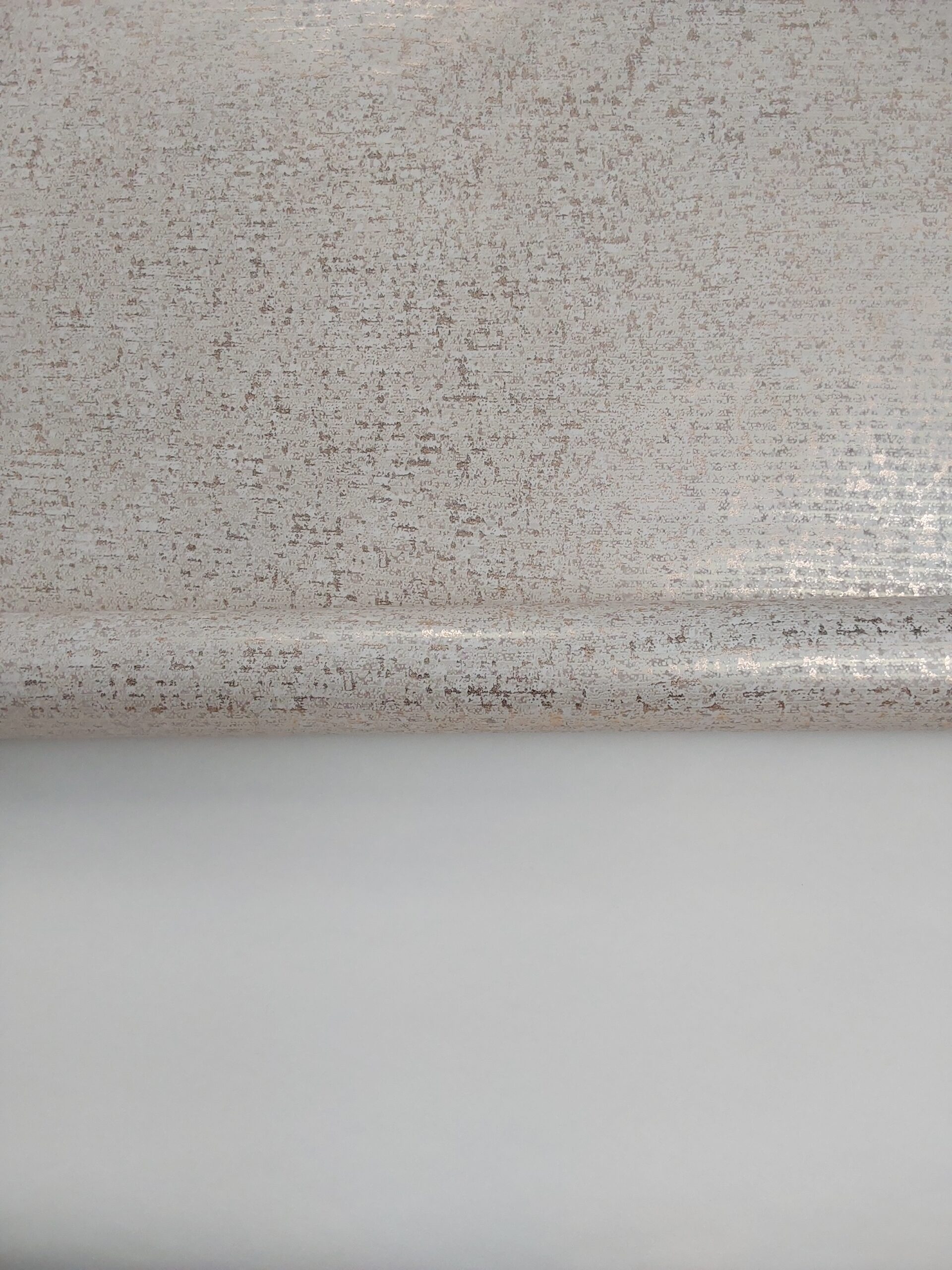 This wallpaper features a textured design with a subtle, uneven pattern in soft, neutral tones. The base color is a light shade, accented by hints of metallic sheen, likely in silver or gold, creating a warm and sophisticated ambiance. The patterns may resemble delicate brushstrokes or earthy textures, offering a modern look while remaining versatile enough to complement various interior styles. Overall, it adds a touch of elegance and warmth to a space.