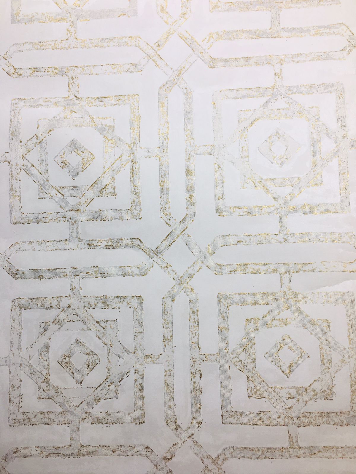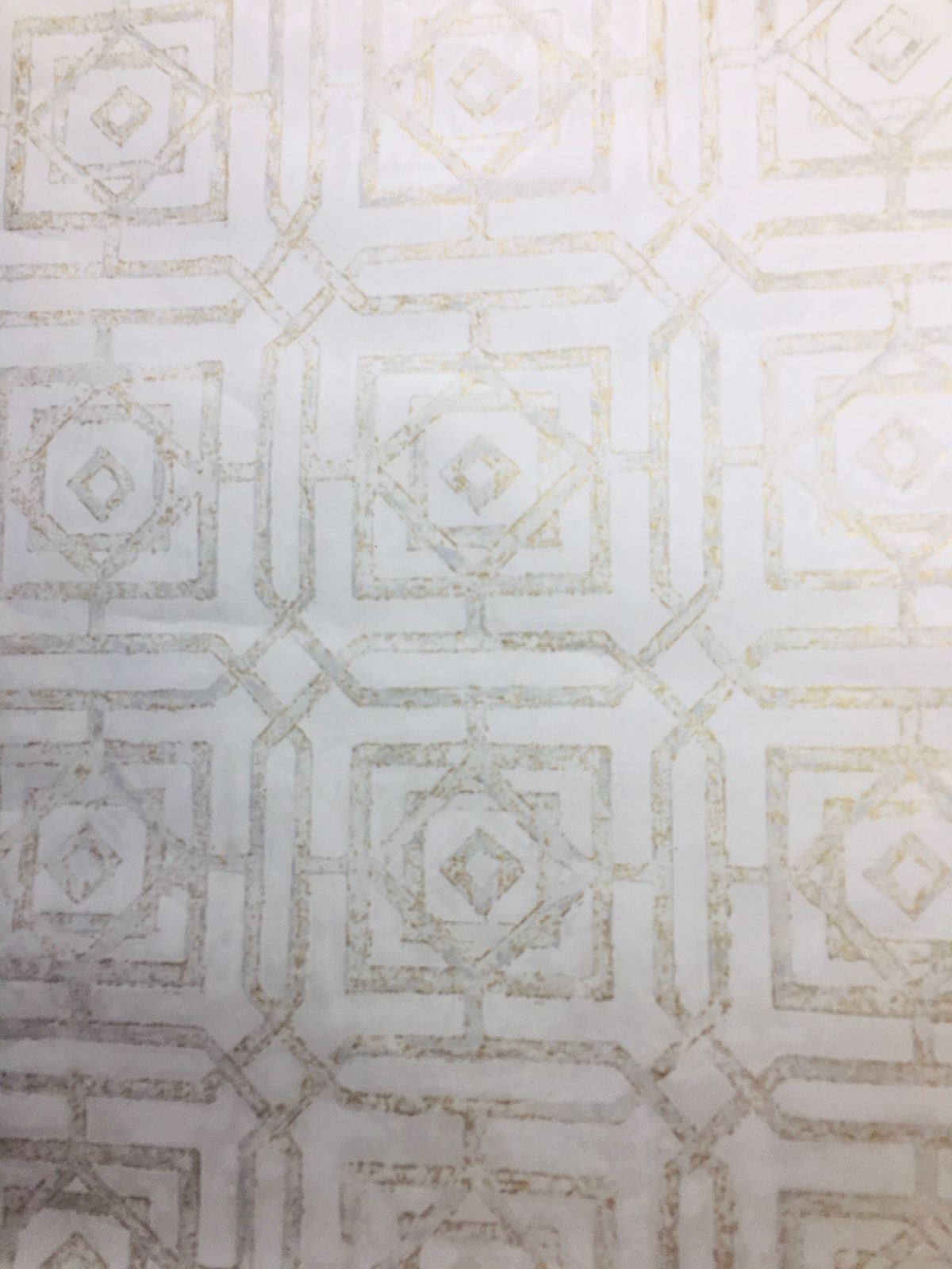 This wallpaper showcases a sophisticated geometric pattern featuring interlocking shapes that create a visually striking design. The color scheme highlights soft whites and muted metallics, giving it an elegant and modern feel. The subtle texture adds depth and sophistication, making it an ideal choice for both contemporary and classic interiors. This wallpaper can enhance the aesthetic of living rooms, dining areas, or bedrooms, offering a chic backdrop that complements various decor styles.