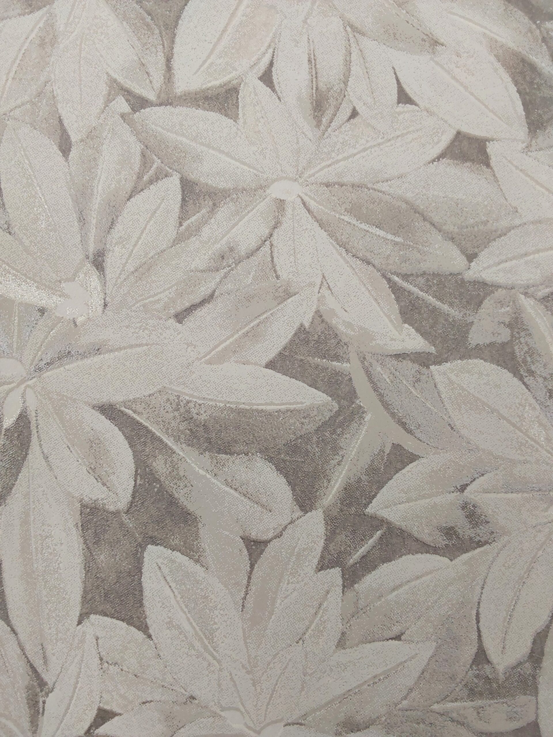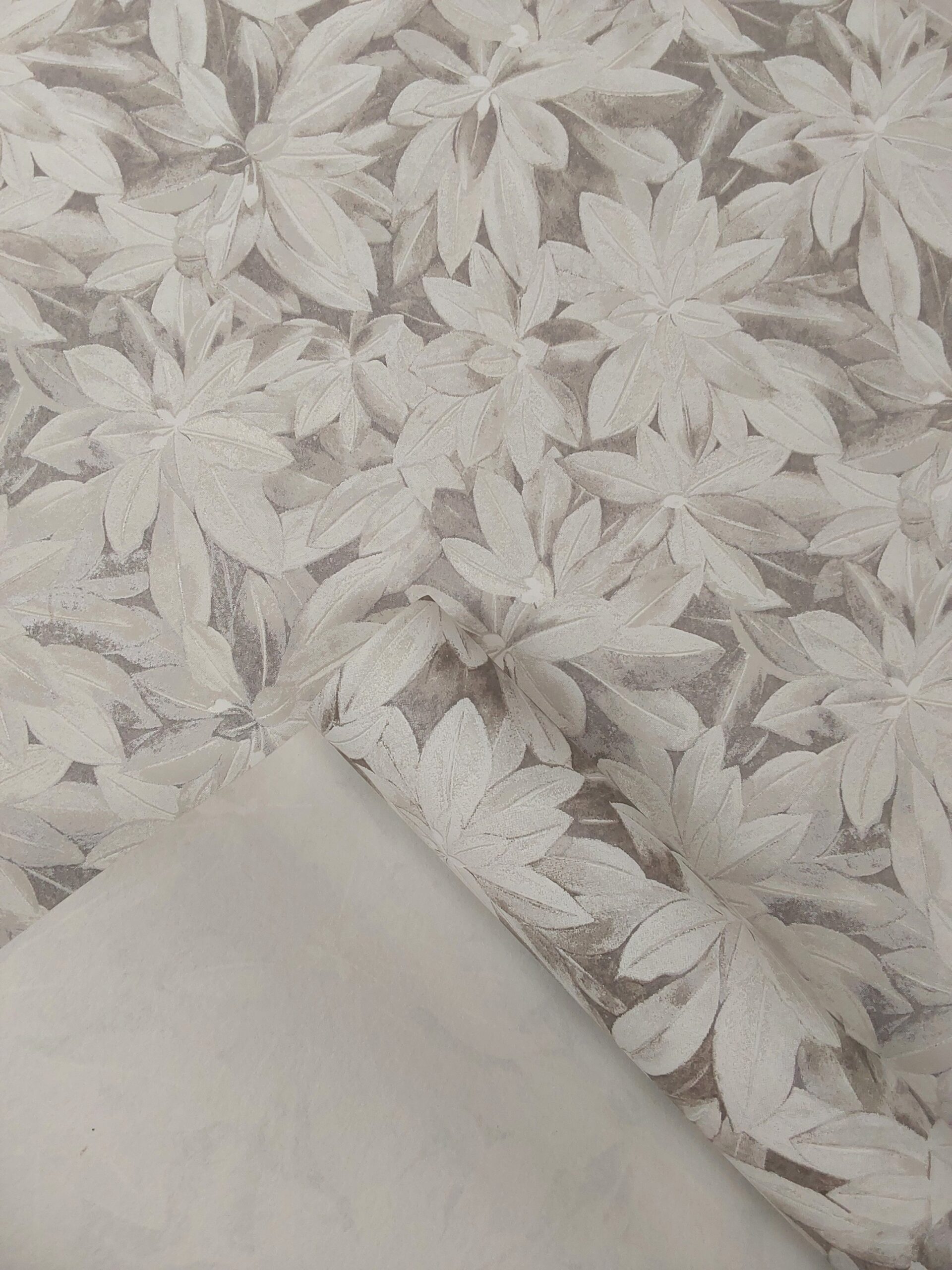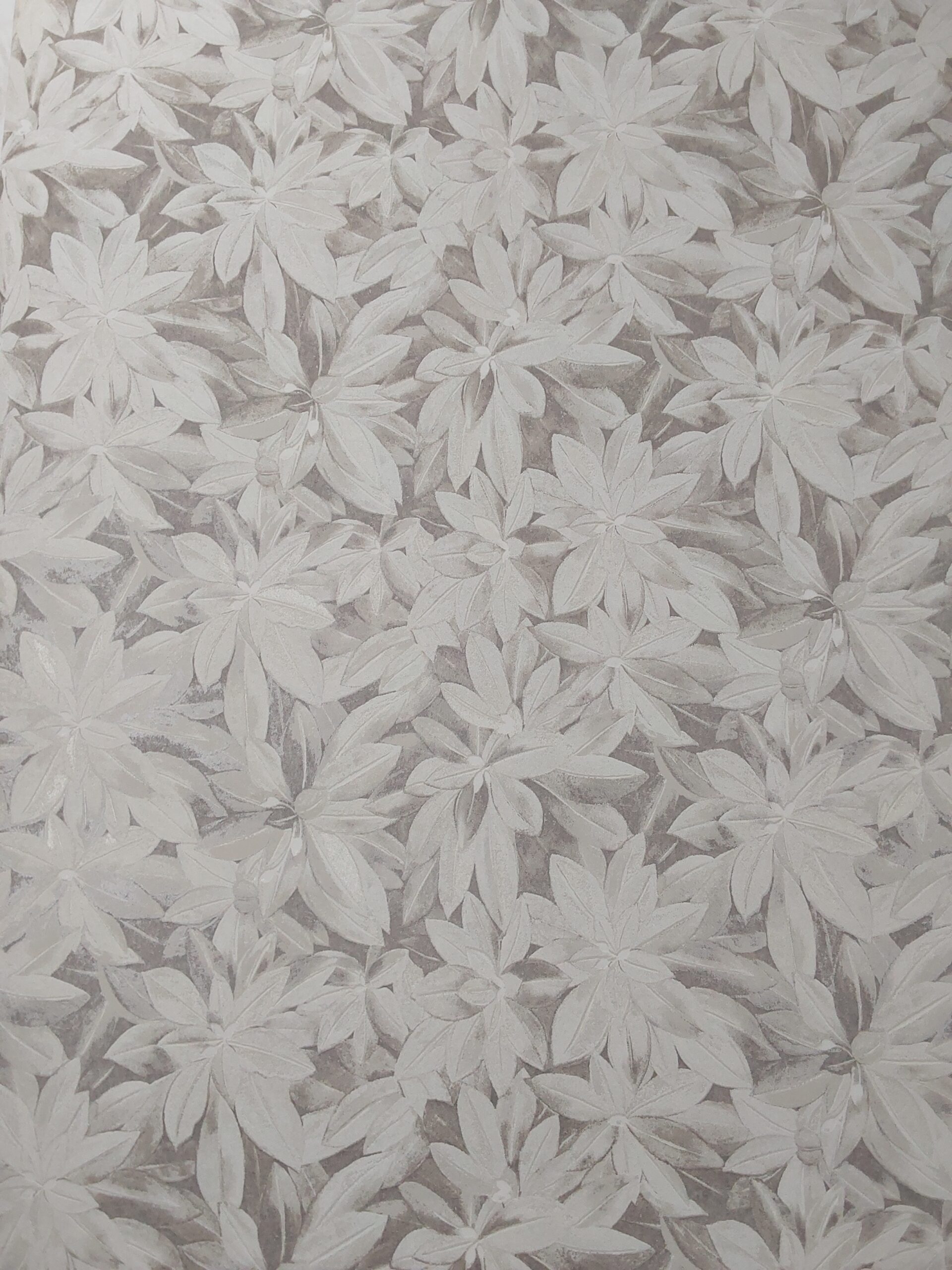 This wallpaper features a delicate floral design with overlapping leaves in soft shades of white and cream. The overall effect is subtle and elegant, providing a serene backdrop. The muted tones suggest a sense of calm and tranquility, making it suitable for various interior styles, from modern to classic. The intricate detailing of the leaves adds texture and visual interest, enhancing the aesthetic appeal of any space.