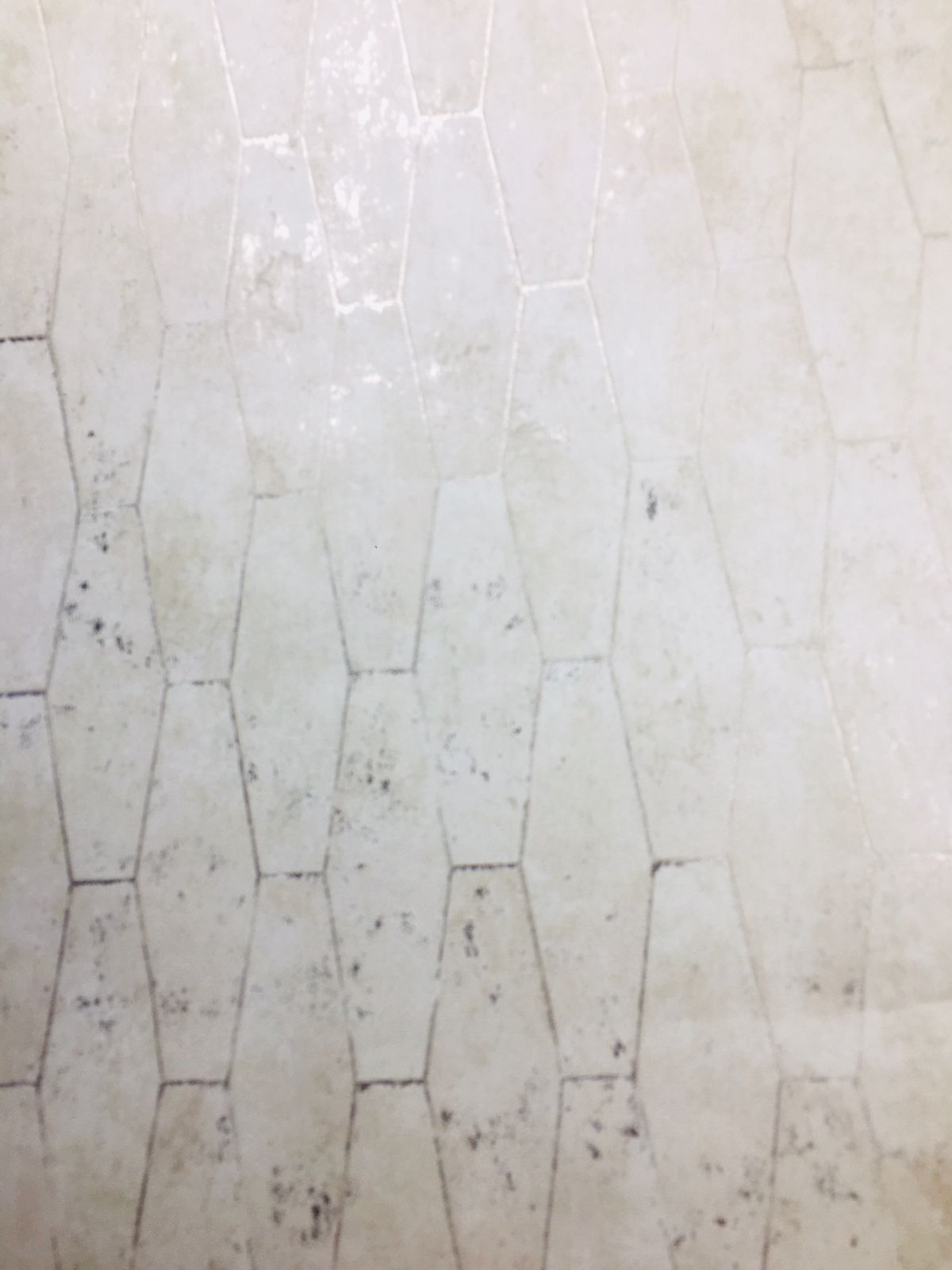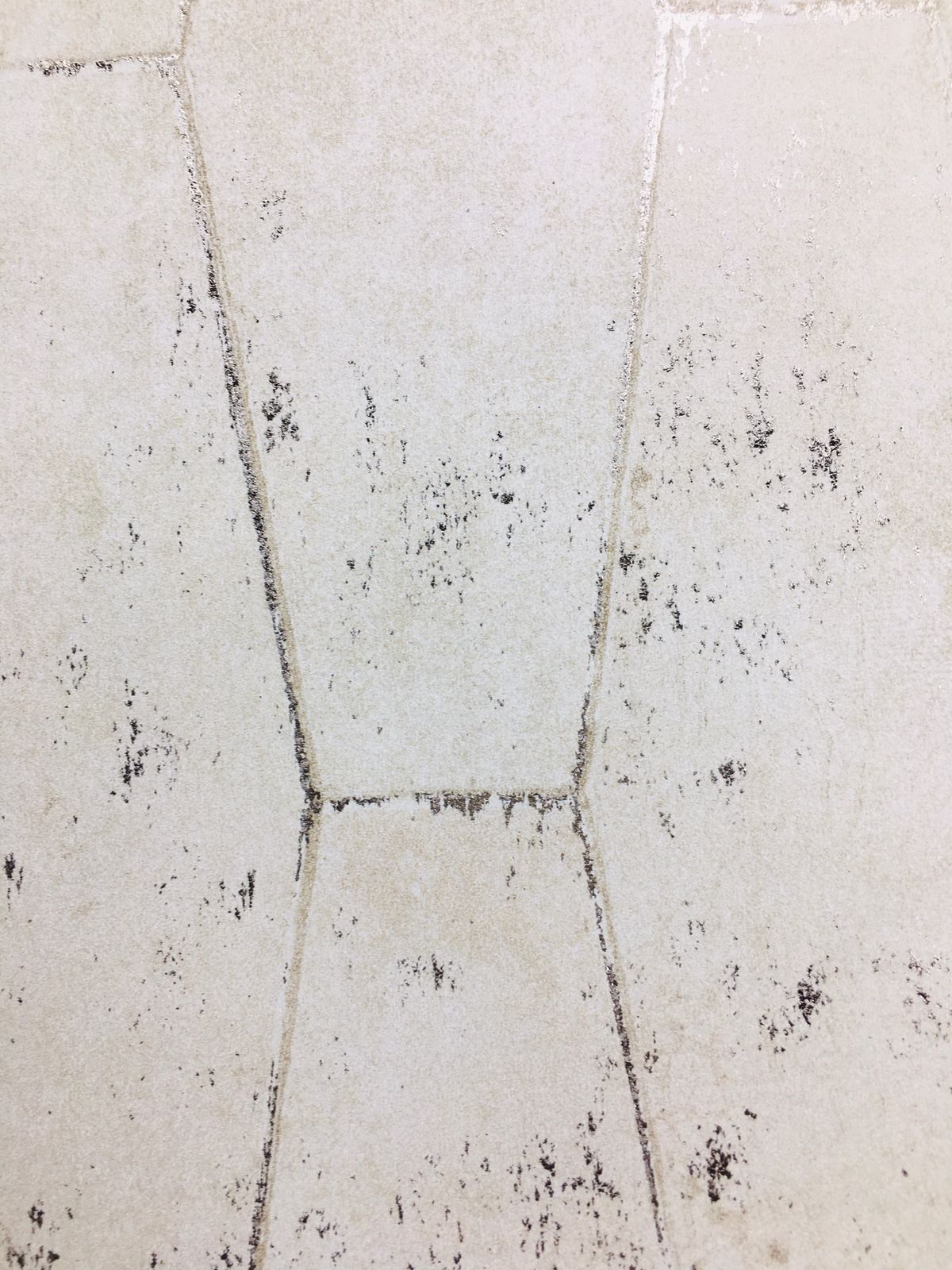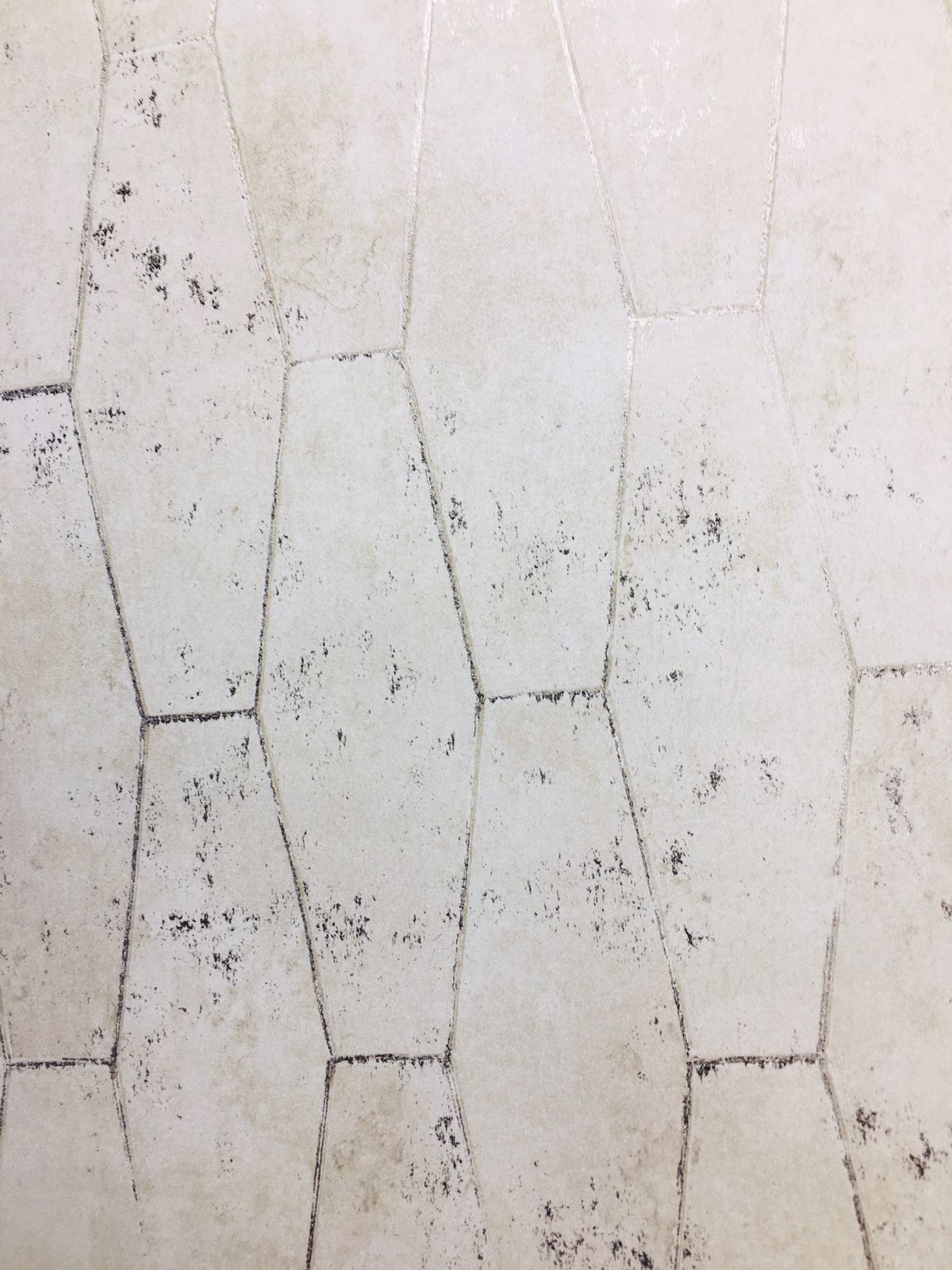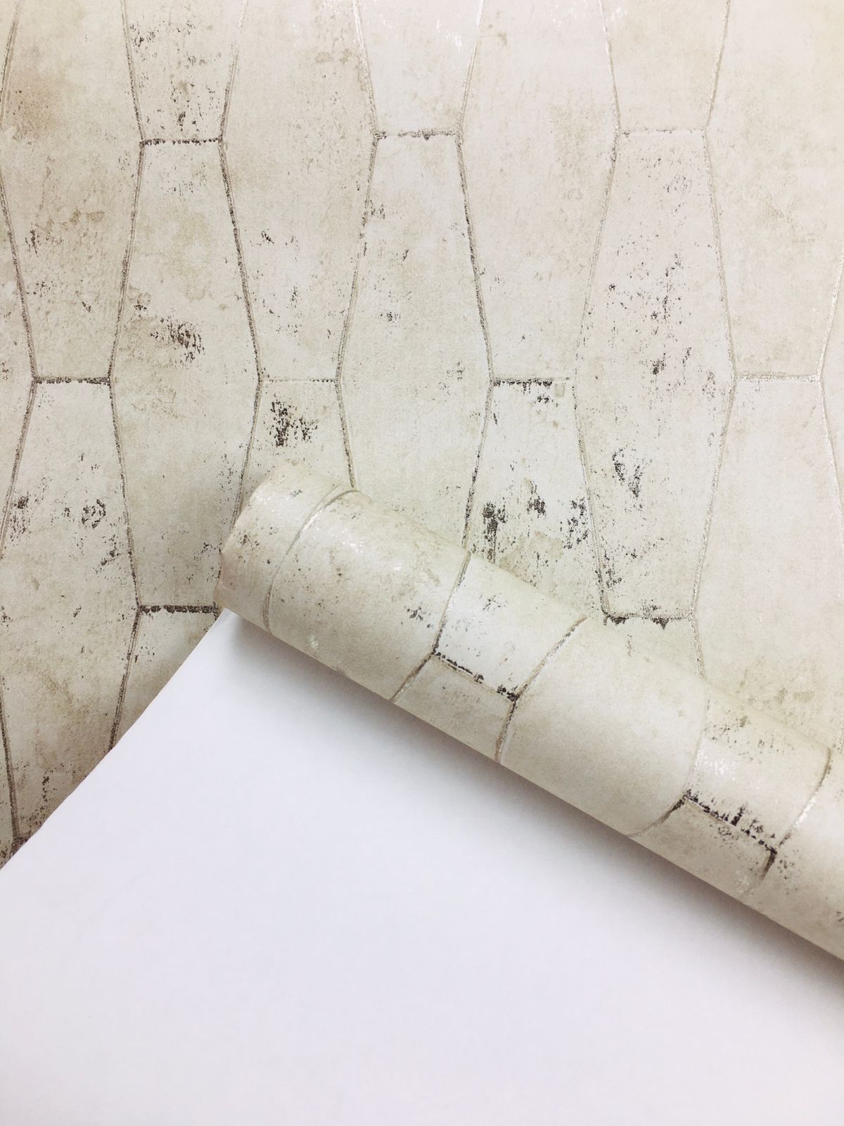 This wallpaper showcases a gentle hexagonal pattern in muted, neutral tones. The surface features subtle textural variations and a weathered finish, providing an organic, vintage feel. The light beige or off-white background is accented with soft markings and imperfections, adding character and depth. This versatile design is perfect for creating a serene and inviting atmosphere in various interior spaces, making it ideal for modern, rustic, or eclectic styles.