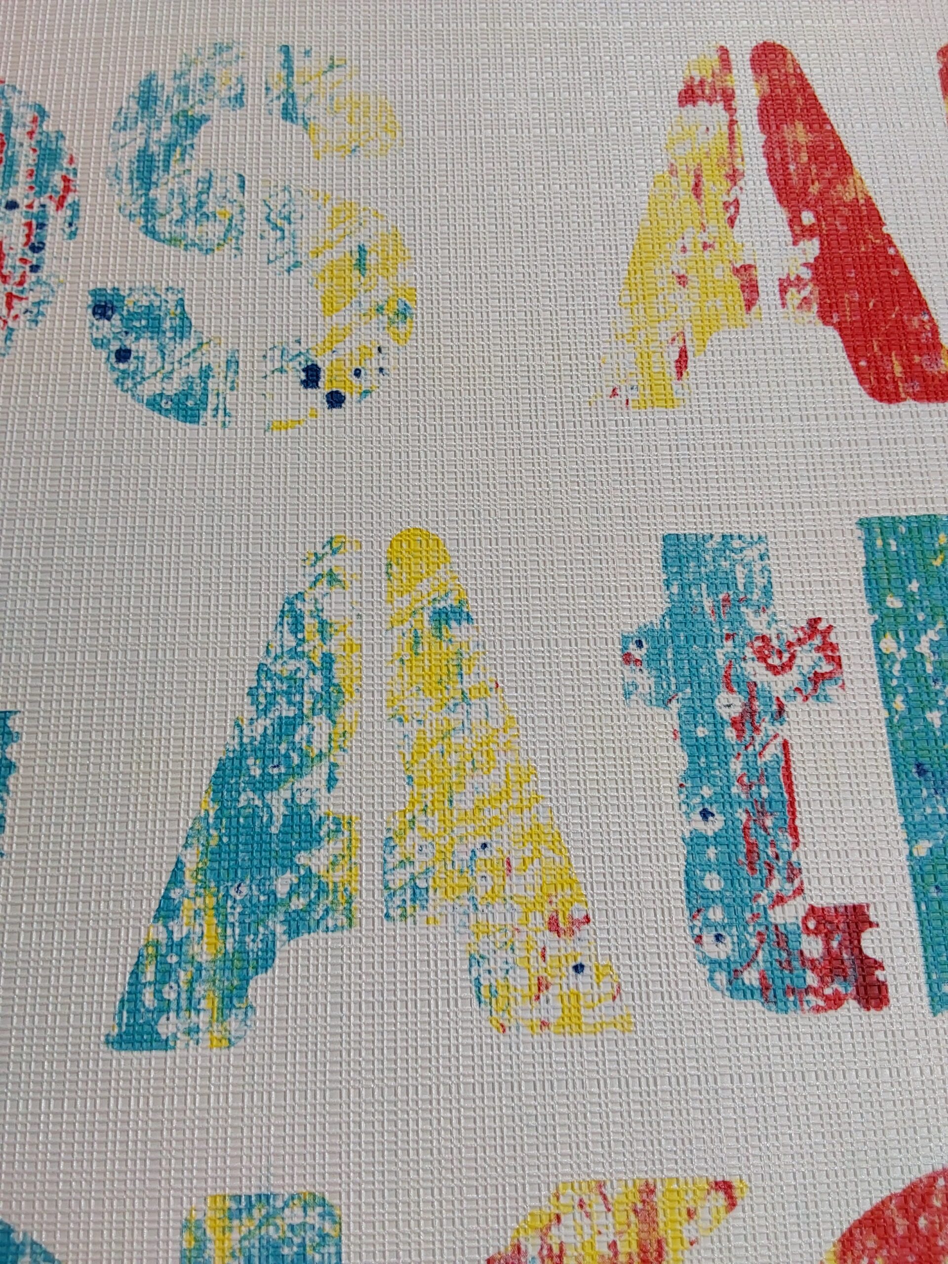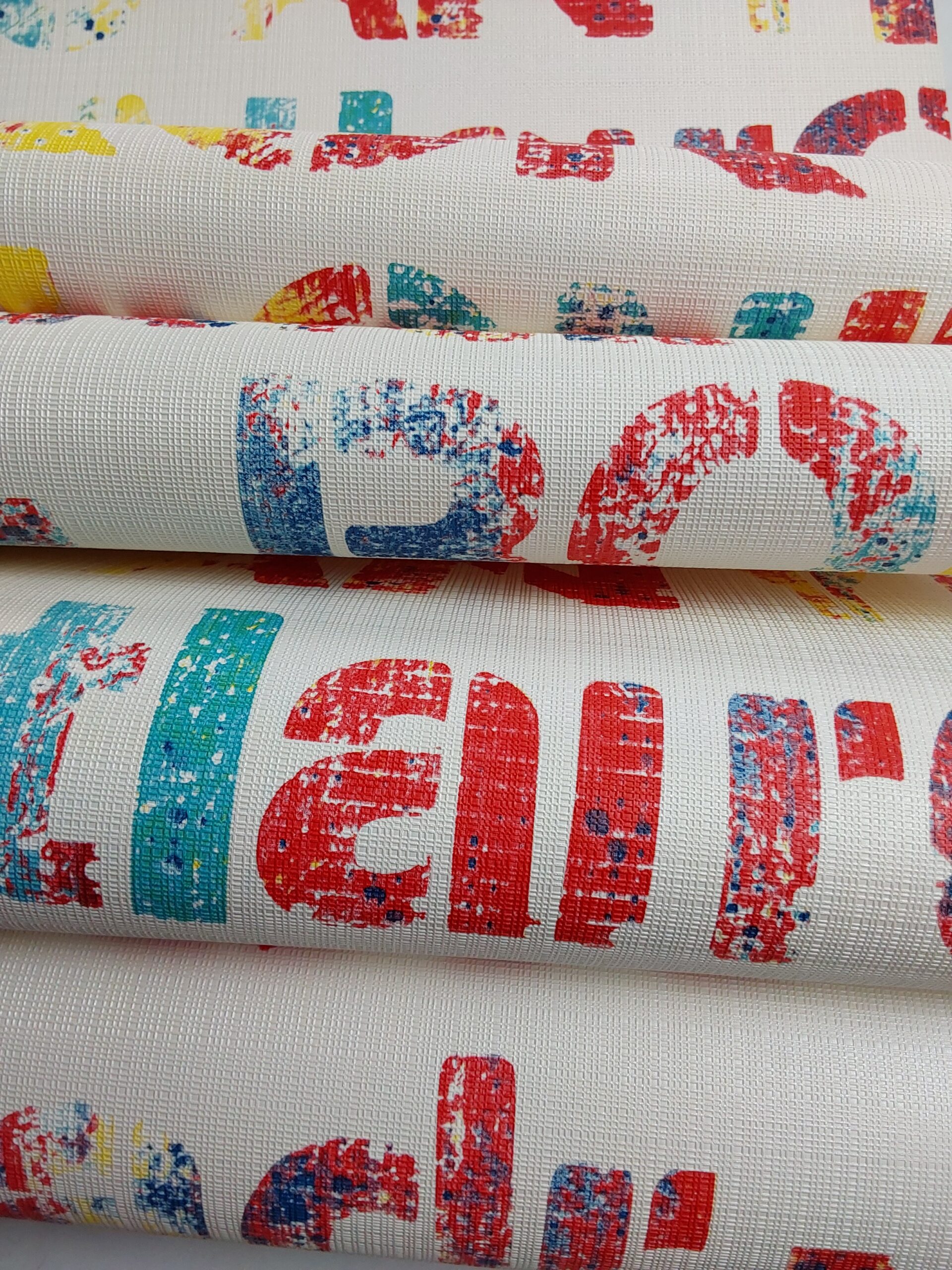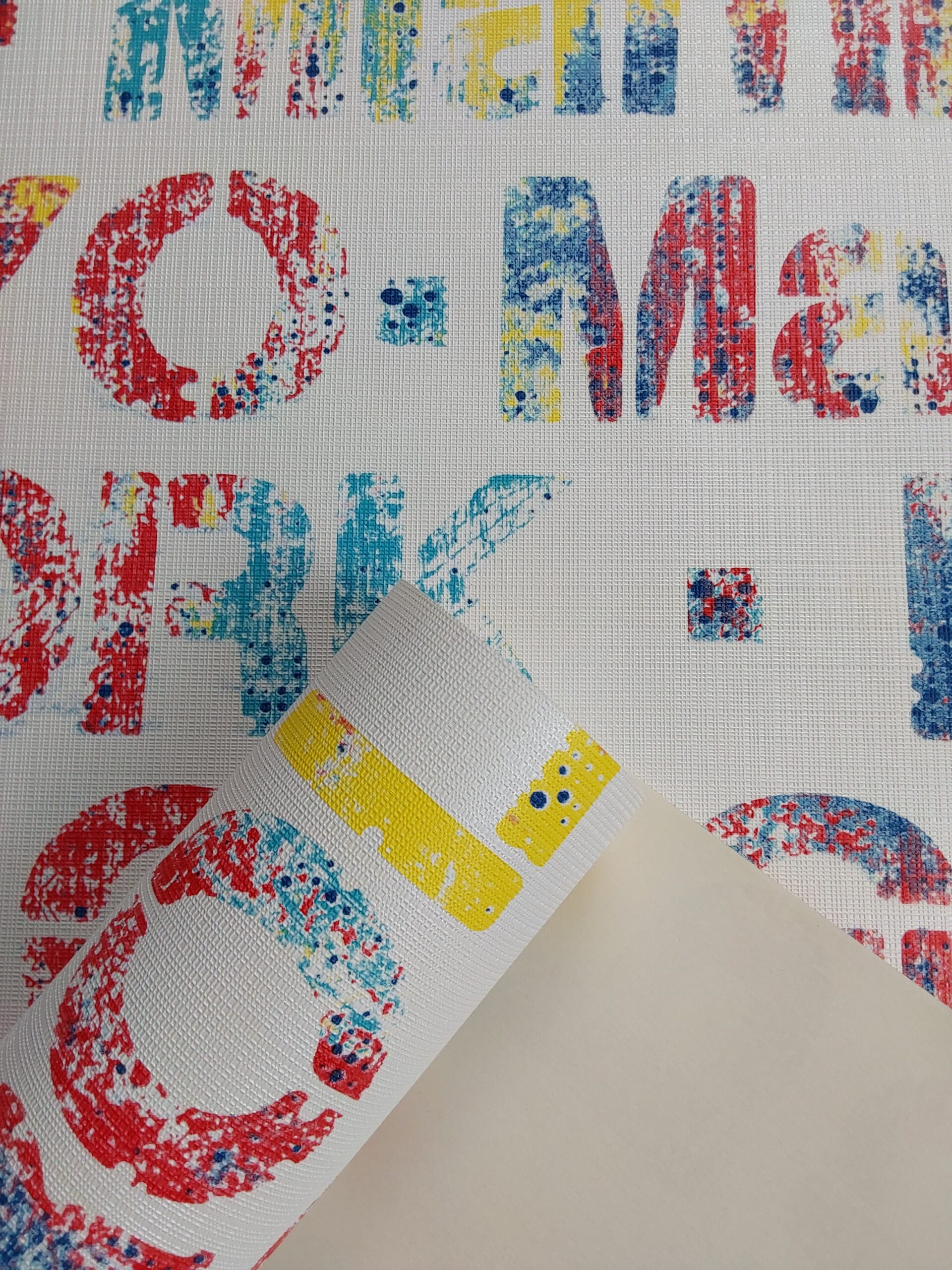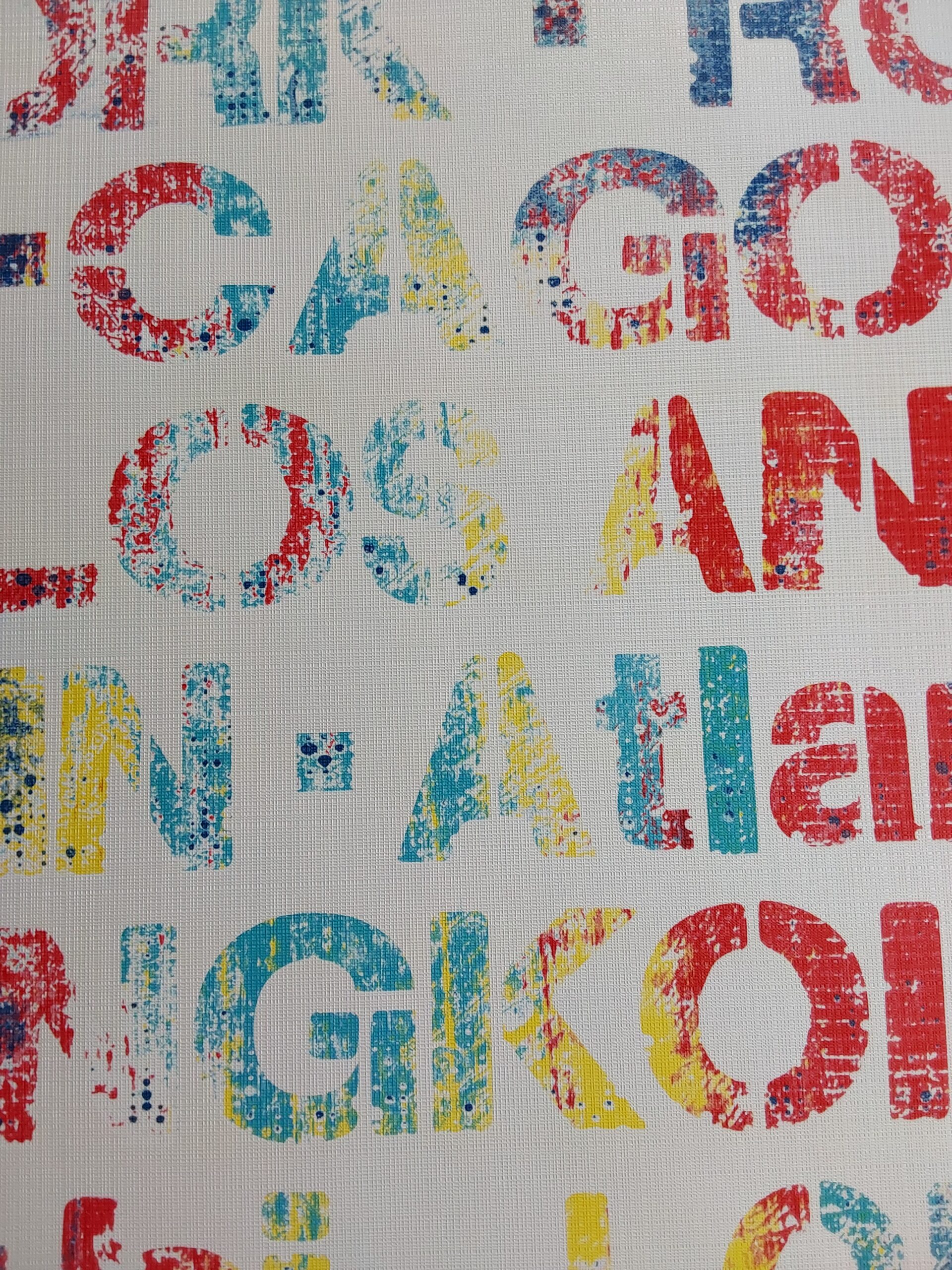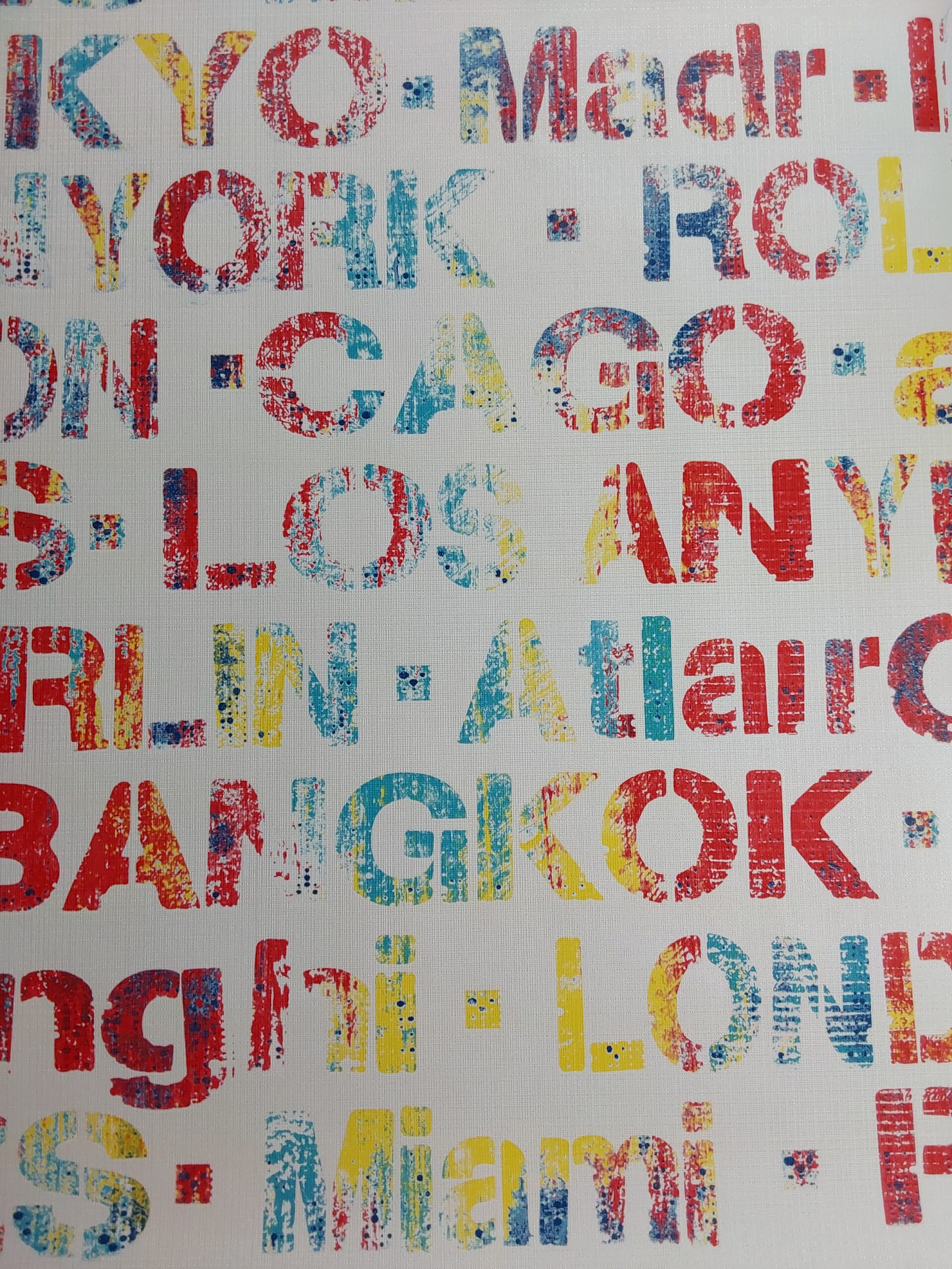 This wallpaper features a vibrant, typographic design with city names displayed in bold, colorful letters. The text includes cities like Chicago, Los Angeles, and Bangkok, rendered in a distressed, textured style that creates a playful and artistic feel. The color palette incorporates reds, blues, yellows, and other hues, adding a lively and modern touch to interior spaces. This design could serve as a great statement piece in settings like home offices, creative spaces, or adventurous living areas.