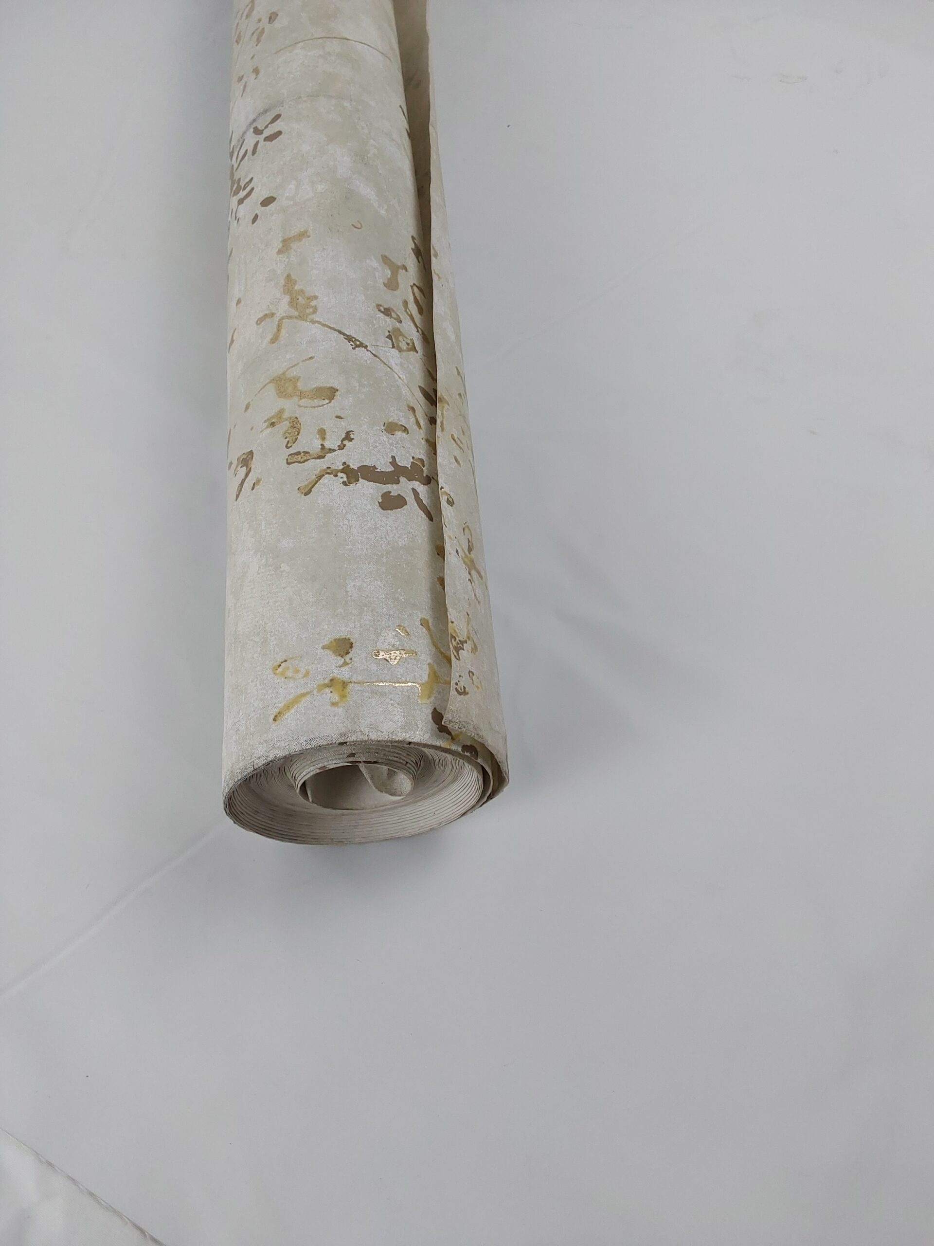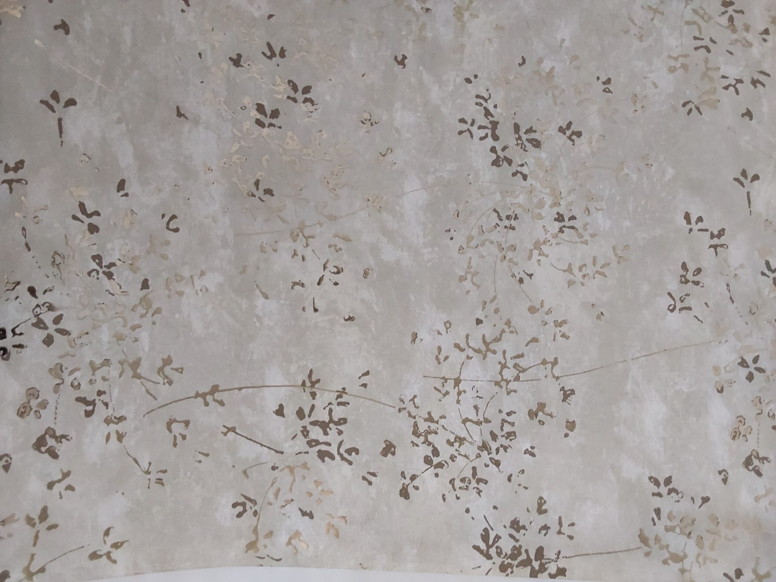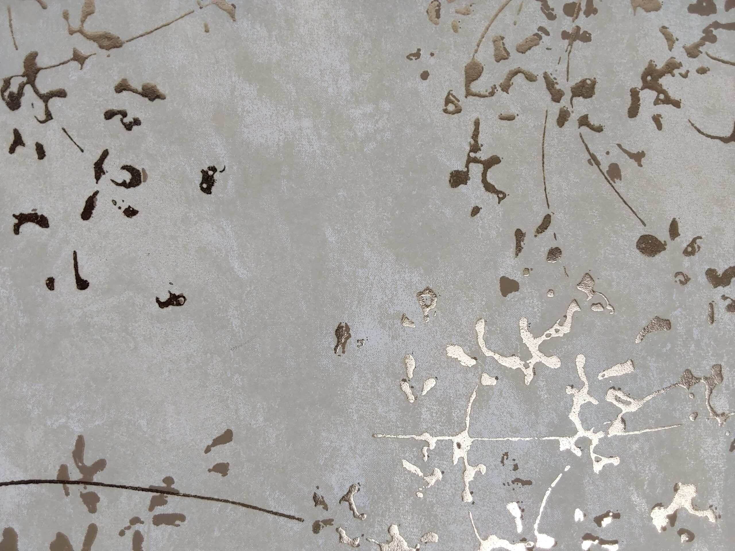 This wallpaper features a delicate design of metallic gold floral patterns against a soft, light gray background. The intertwining branches and subtle texture create a serene and elegant atmosphere, perfect for enhancing any interior space.