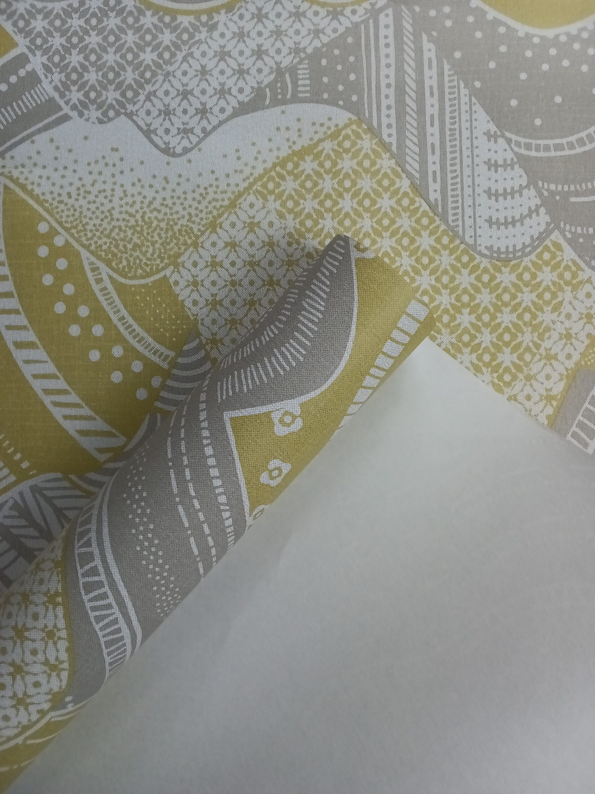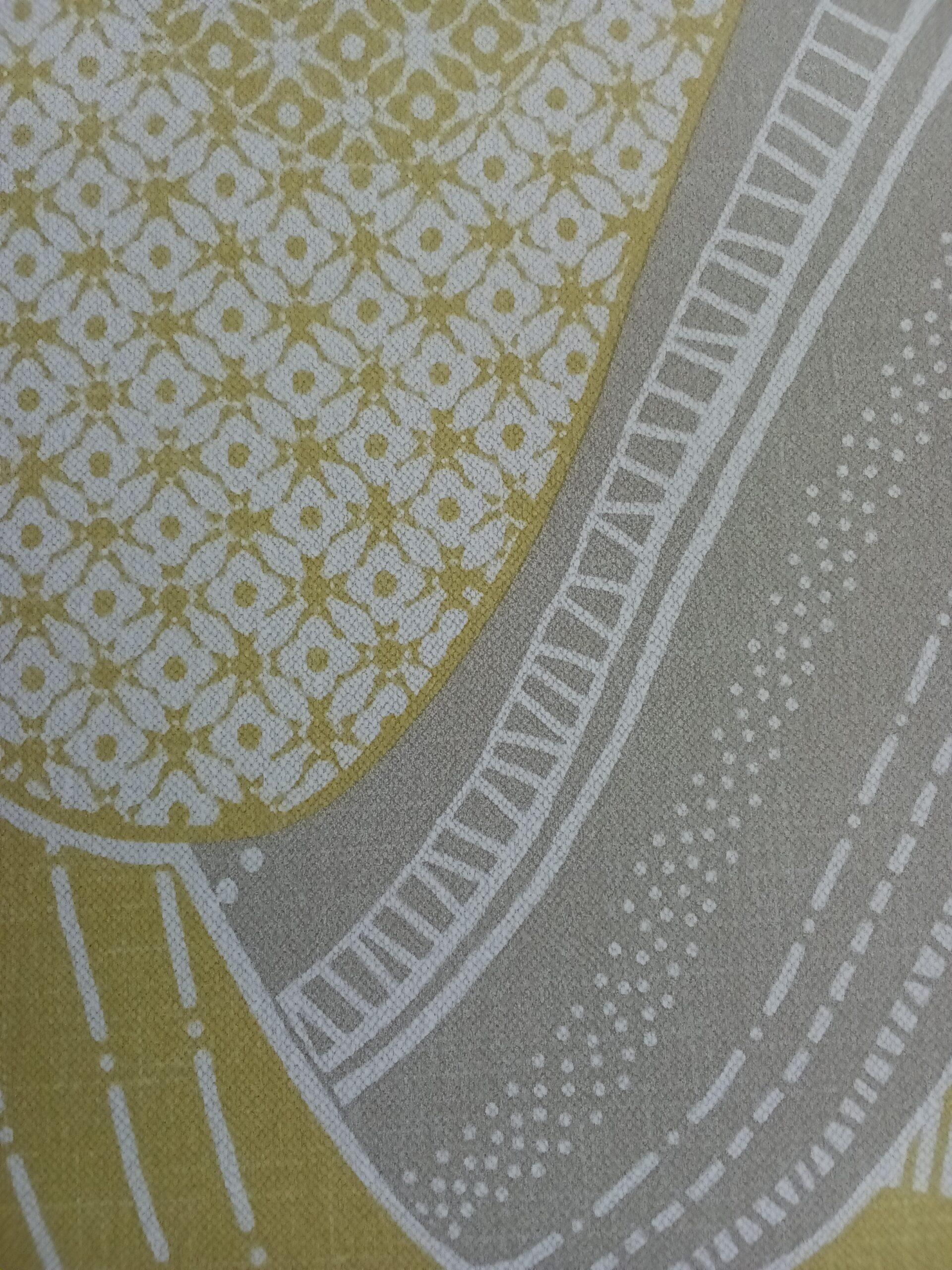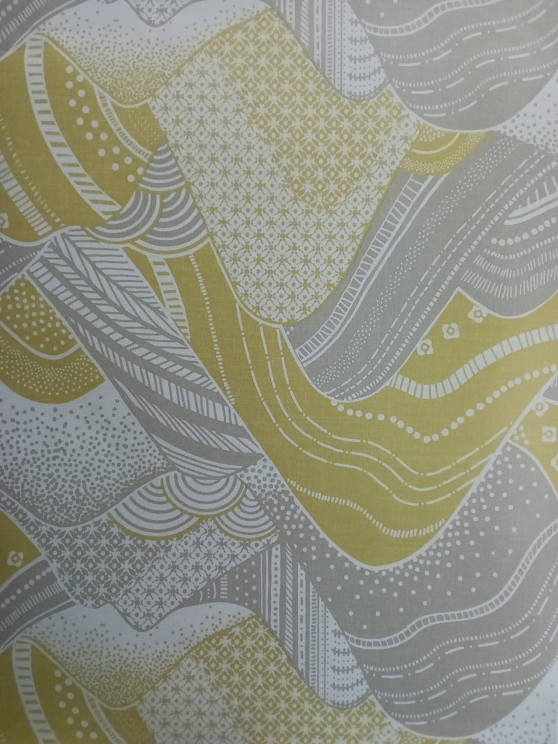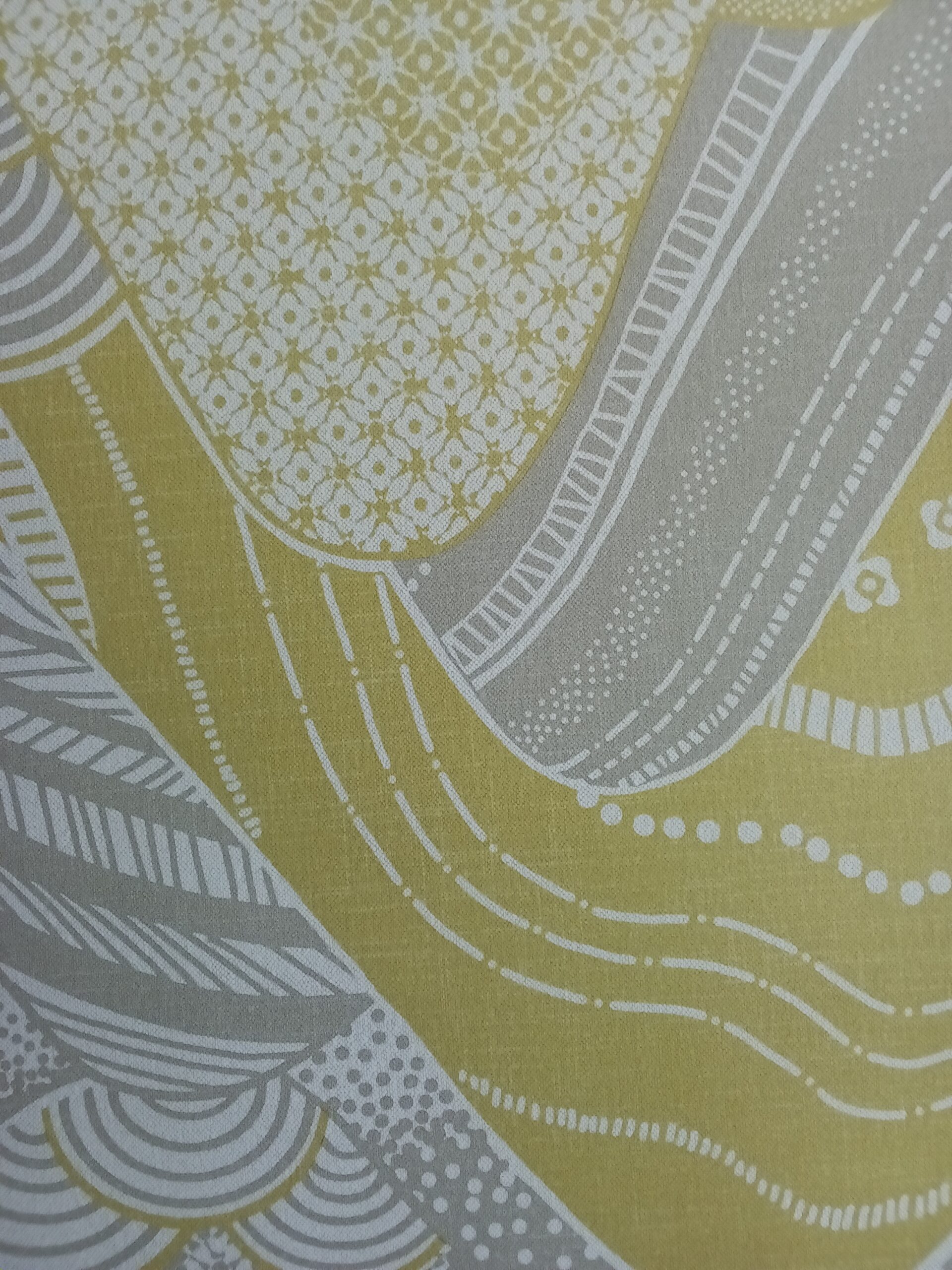 This wallpaper features an abstract design with flowing, curvy shapes in gray, yellow, and white. The pattern includes a mix of textures and intricate details, such as dots and geometric shapes, creating a playful and dynamic visual experience. The combination of colors and patterns adds a modern touch, making it suitable for a contemporary space. If you want suggestions on how to use it in your décor, just let me know!