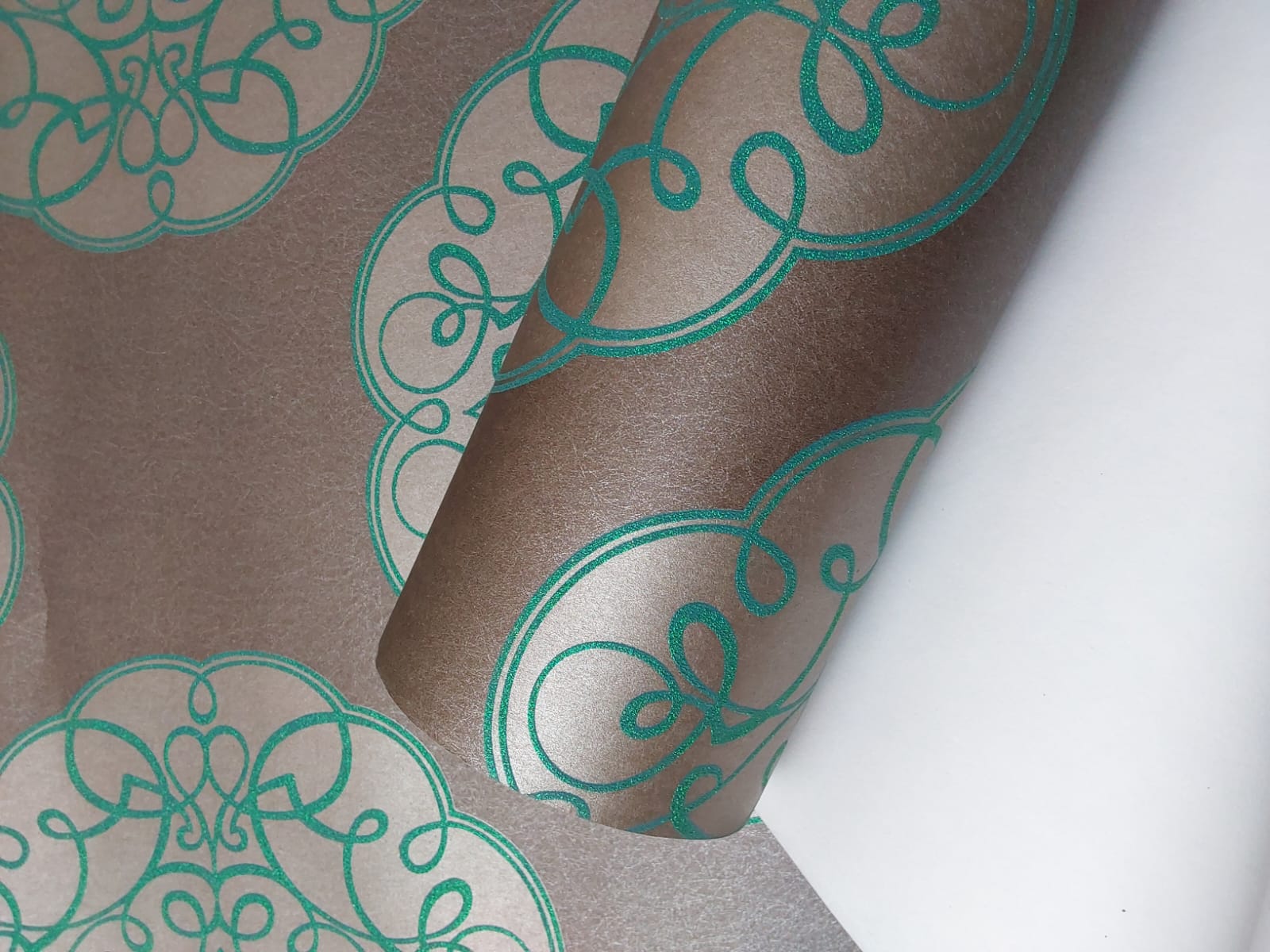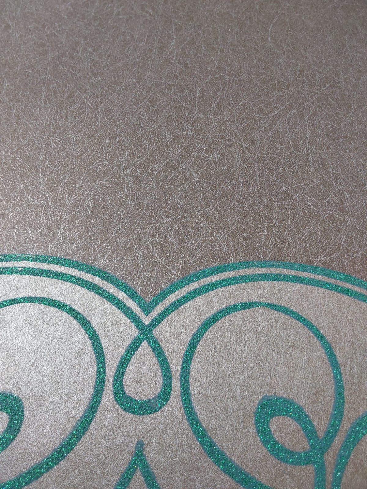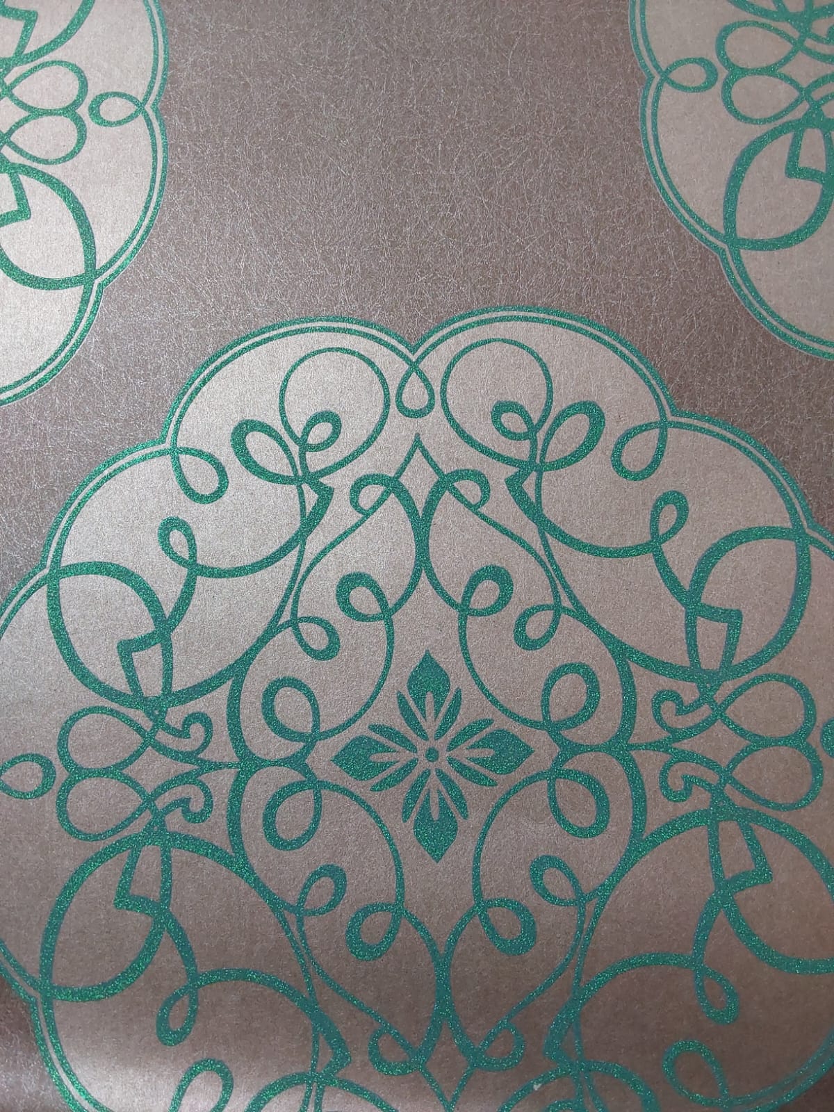 This wallpaper features a subtle, textured background in a sleek, metallic silver tone. At the bottom, there’s an elegant, symmetrical design in a vibrant, aquamarine green. The design includes flowing curves and heart-like shapes, exuding a refined and sophisticated look. The shimmer of the metallic background combined with the vivid green design adds a touch of modern luxury to any space.