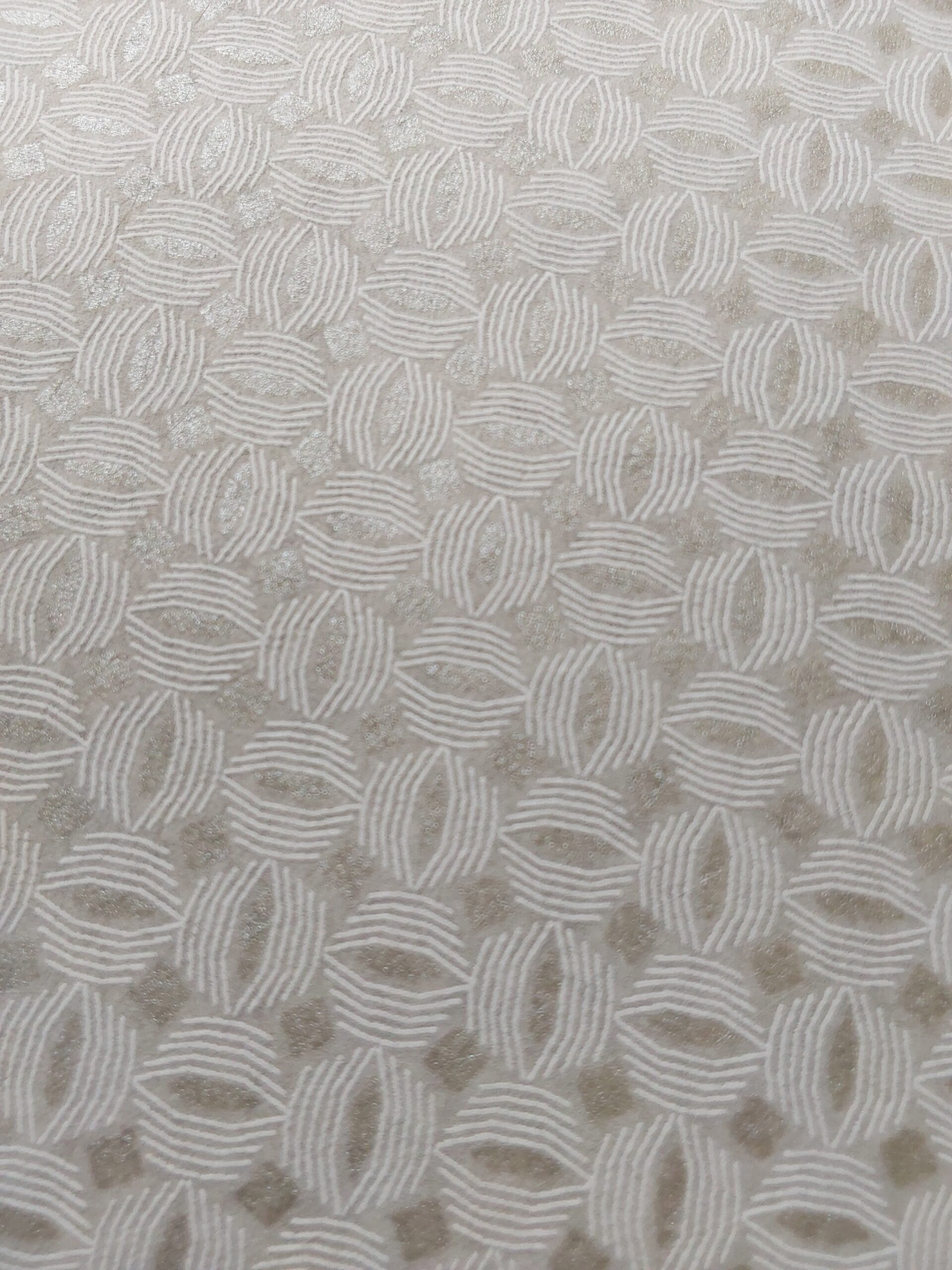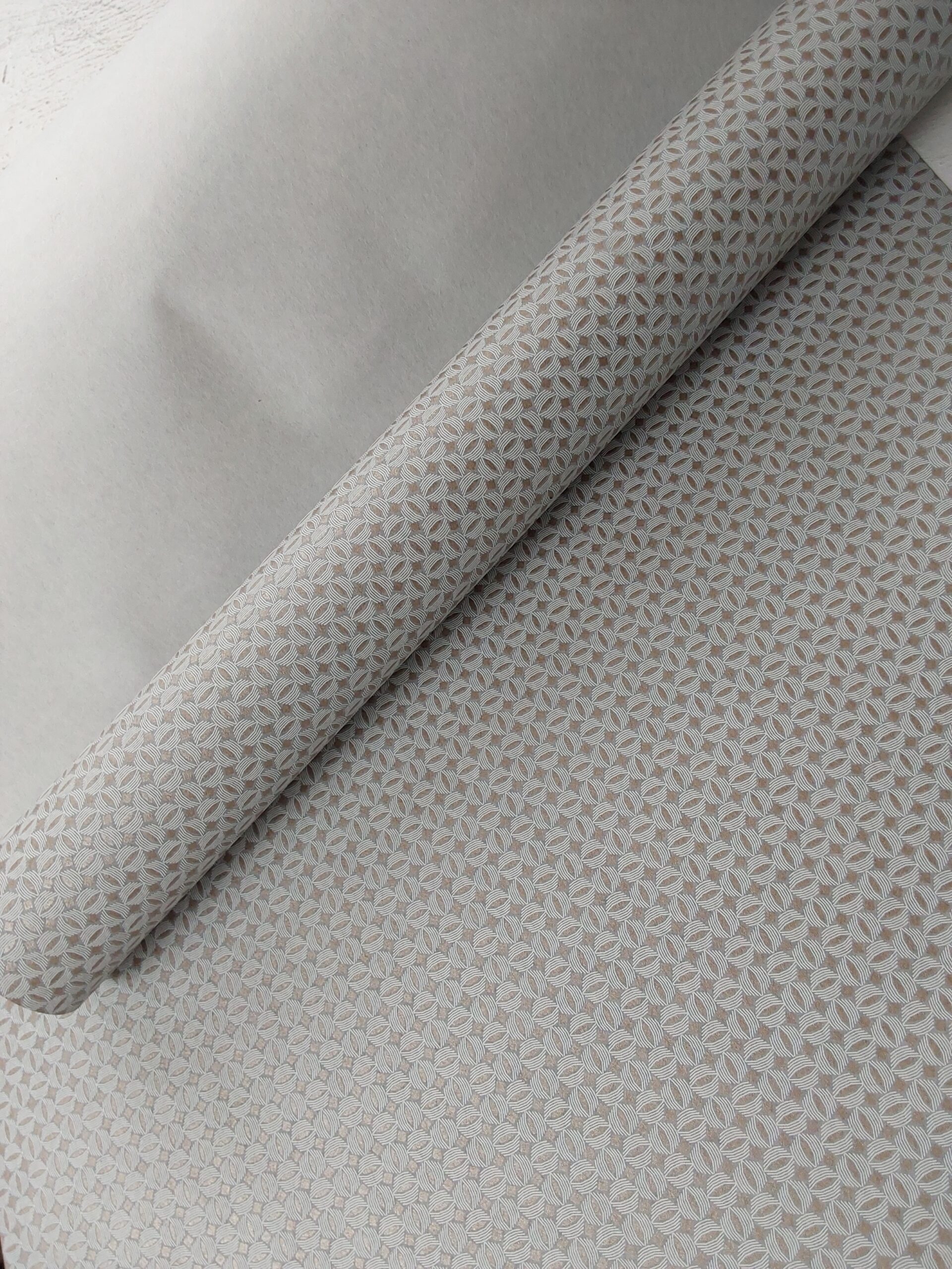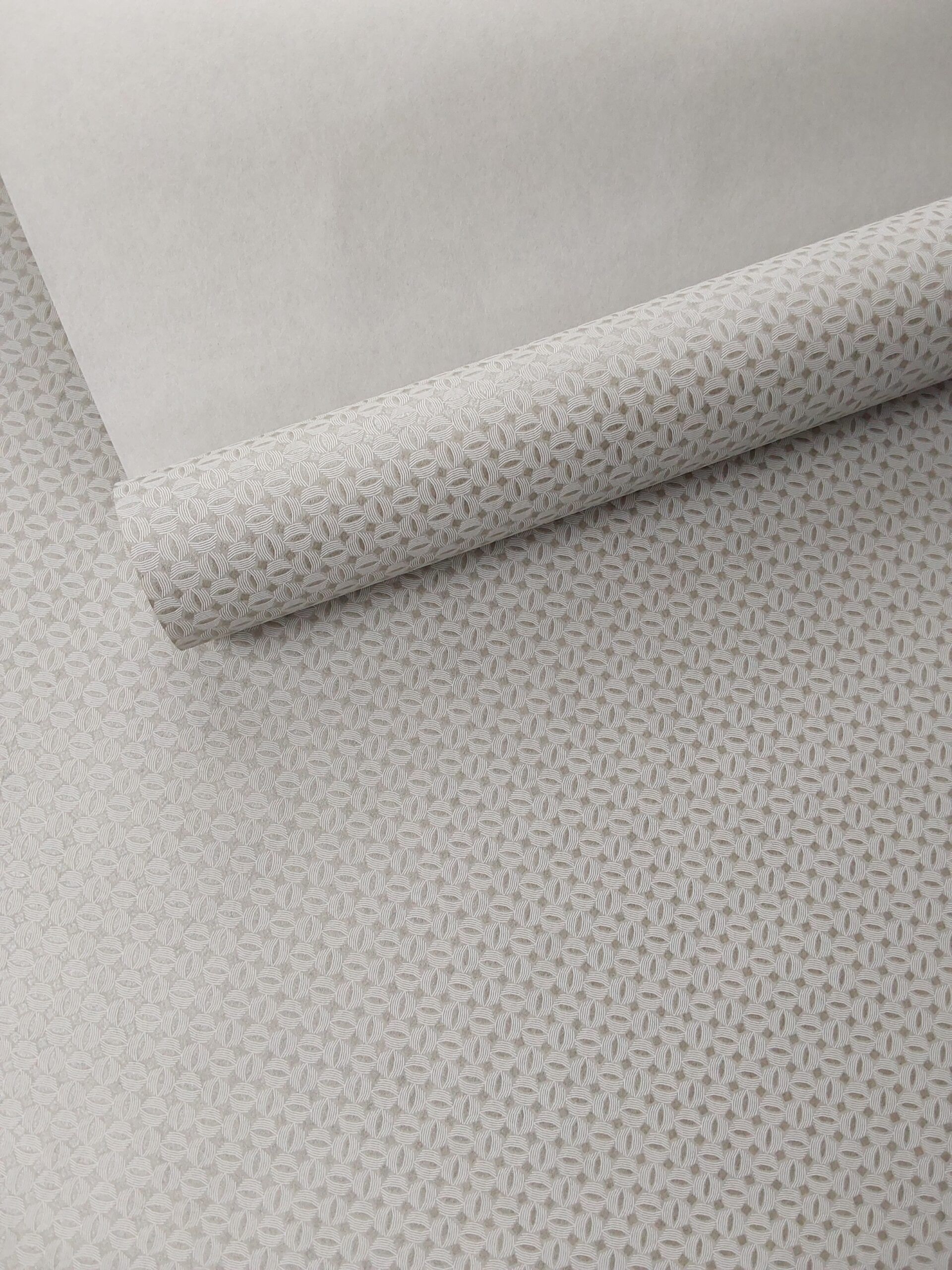 This wallpaper features a subtle, intricate pattern of interlocking shapes, creating a delicate texture. The soft, neutral color palette adds an elegant and timeless feel, making it perfect for various interior designs.