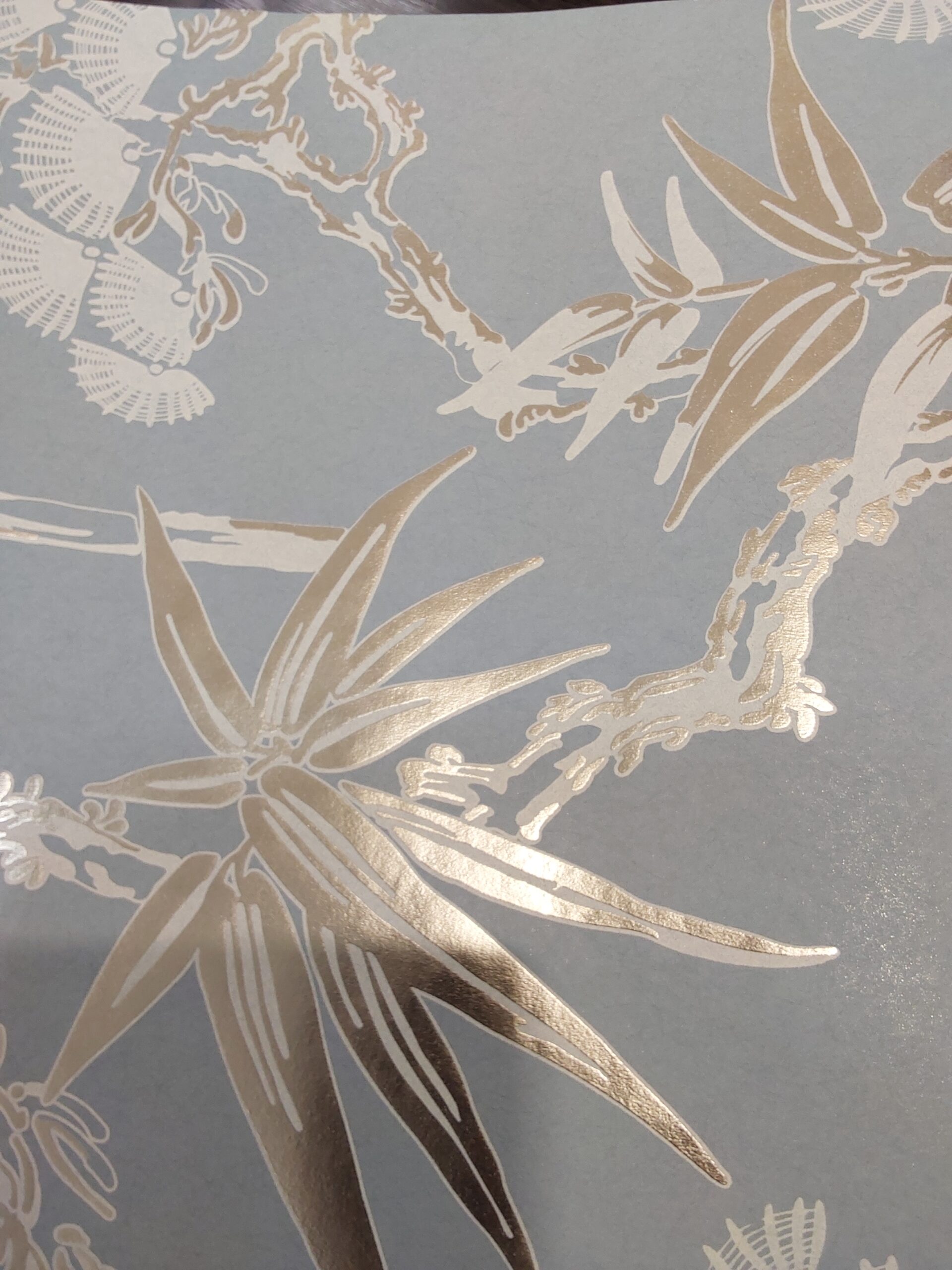 Introducing our exquisite floral wallpaper, a stunning fusion of elegance and contemporary design. This captivating wallpaper features a delicate botanical print, beautifully adorned with shimmering metallic accents that catch the light with grace. The soft blue background serves as a tranquil canvas, allowing the intricate floral designs to stand out with their refined beauty.