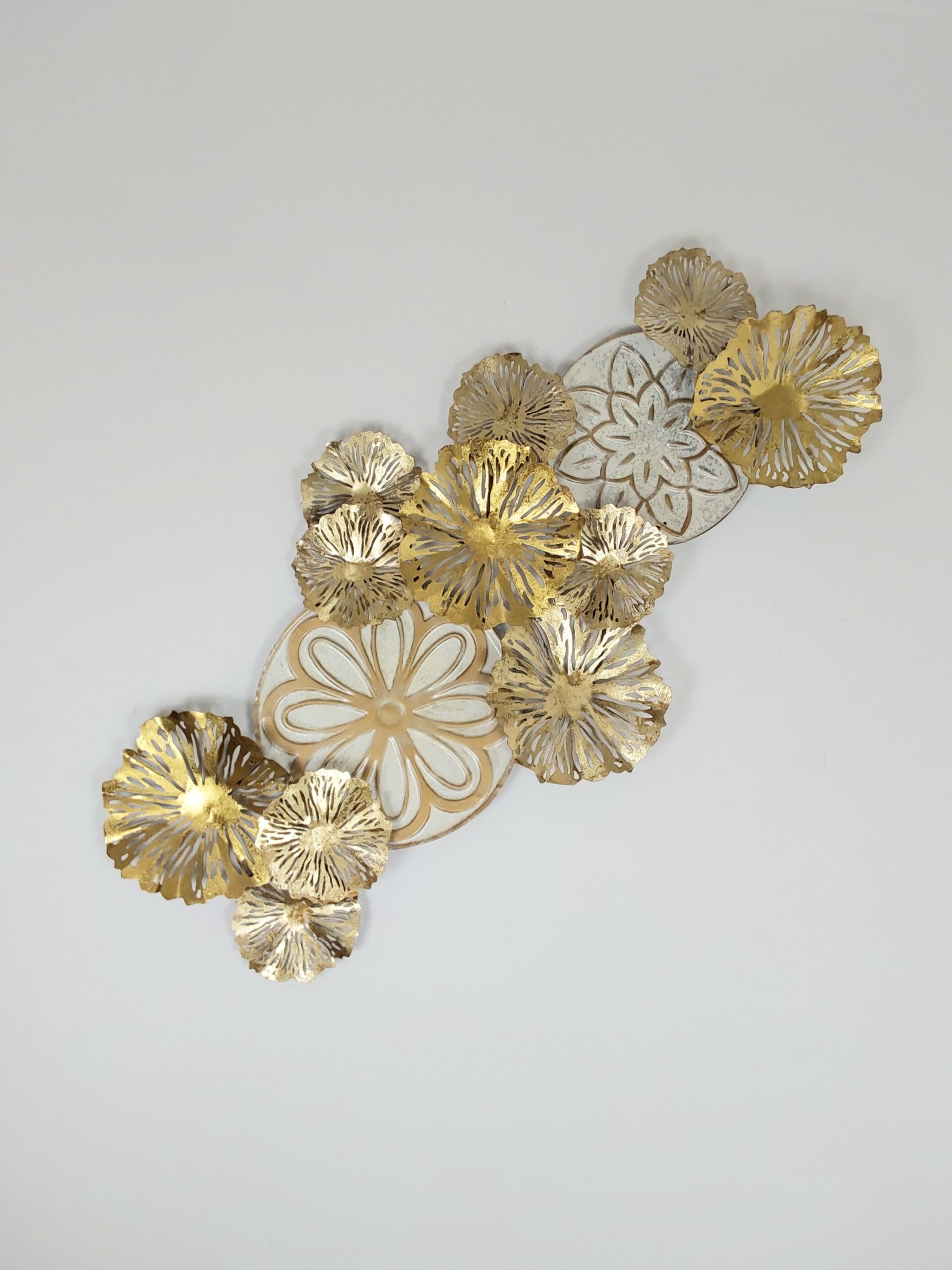 This elegant 4D wall art features a captivating arrangement of metallic floral elements interspersed with intricately patterned discs. The flowers, crafted with detailed, layered petals in gold, create a striking contrast against the neutral-toned discs with ornate designs. The combination of textures and finishes adds depth and dimension, while the flowing, vertical composition evokes a sense of natural movement. This sophisticated piece serves as a beautiful focal point, bringing a touch of botanical elegance and contemporary flair to any interior space.