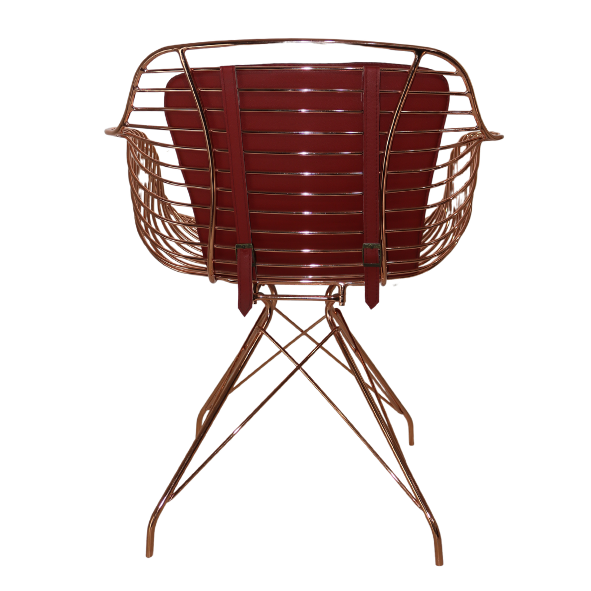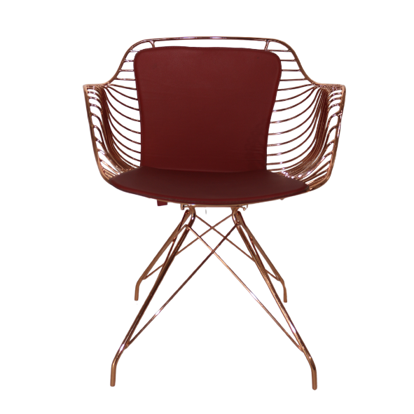 The Metal Frame Chair with Red Cushioning is a harmonious blend of industrial appeal and luxurious comfort. This chair boasts a unique metal framework, characterized by its sleek lines and graceful curves, which form a sturdy yet visually light base.