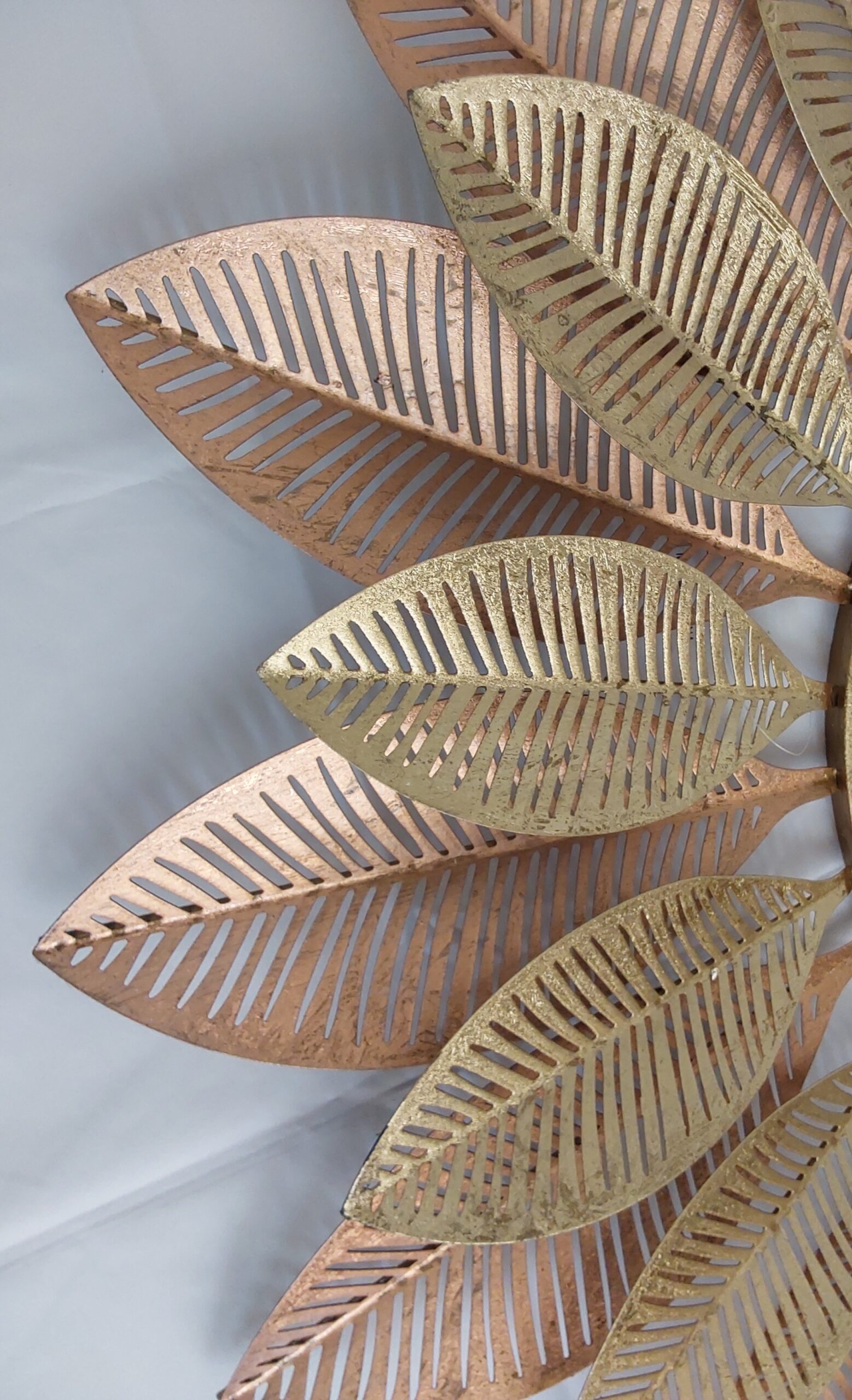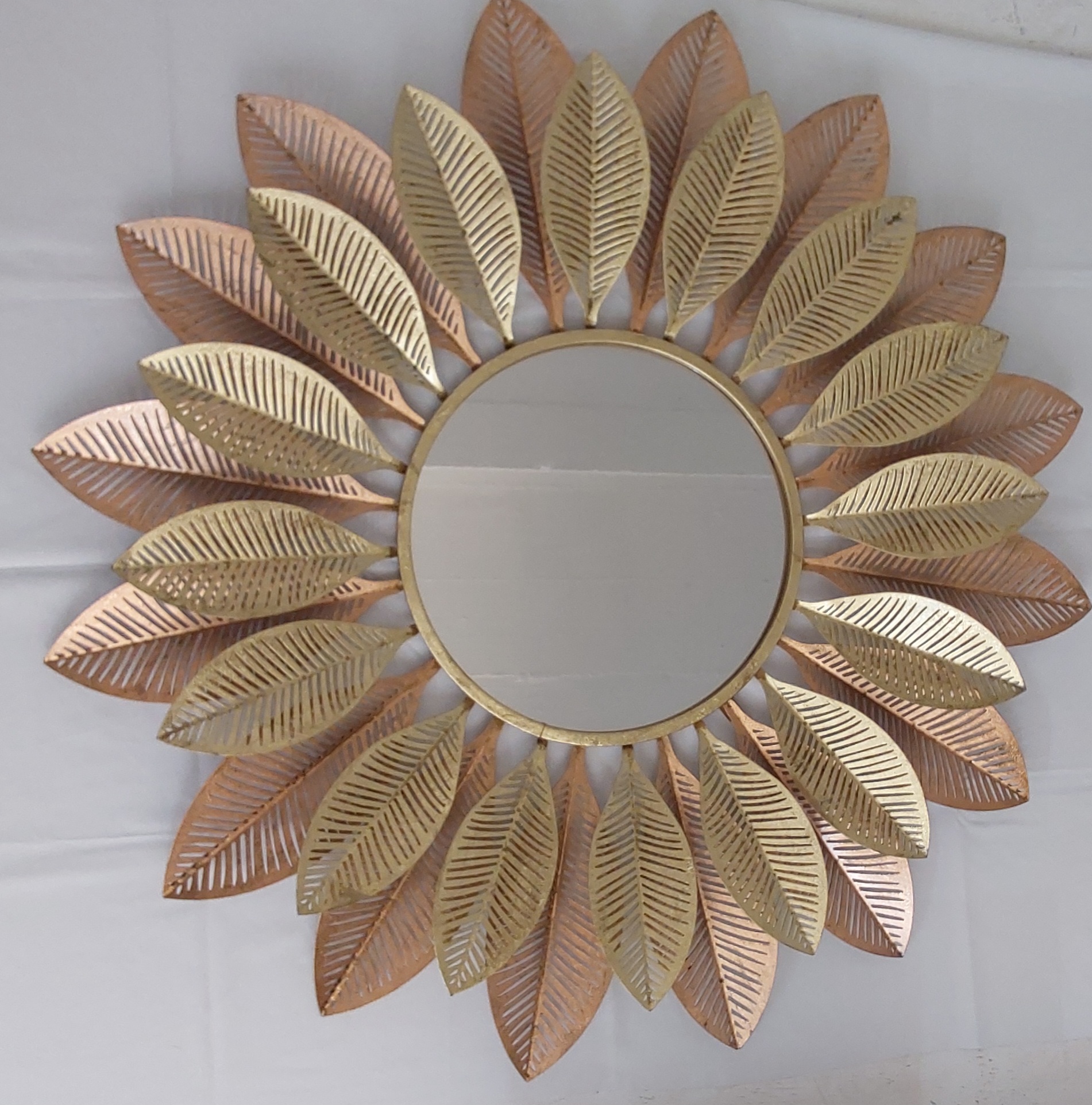 Evaluate your interior decor with this captivating sunburst leaf mirror. This striking piece blends natural elegance with contemporary design, featuring a round central mirror surrounded by meticulously crafted leaf motifs. the radiating pattern of metallic gold and bronze leaves created a dazzling sunburst effect, making it perfect statement piece for any room.