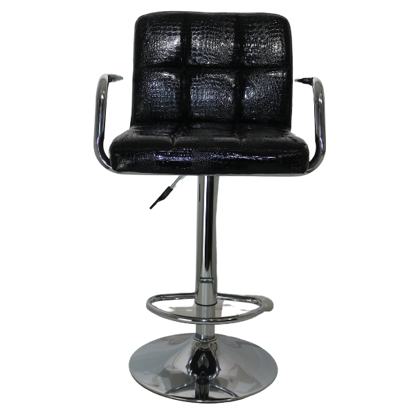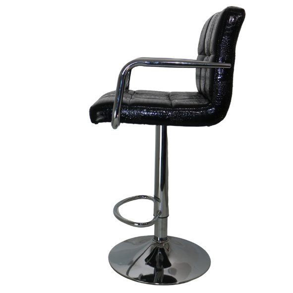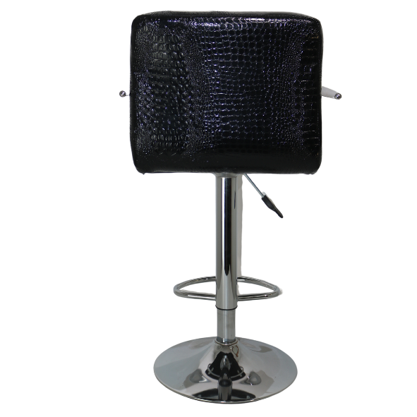 Supporting the plush seat is a durable metal base, equipped with a gas-lift mechanism for easy height adjustment and a built-in footrest for additional support. The base’s sleek design allows for a 360-degree swivel, offering convenience and flexibility in any social or dining setting.