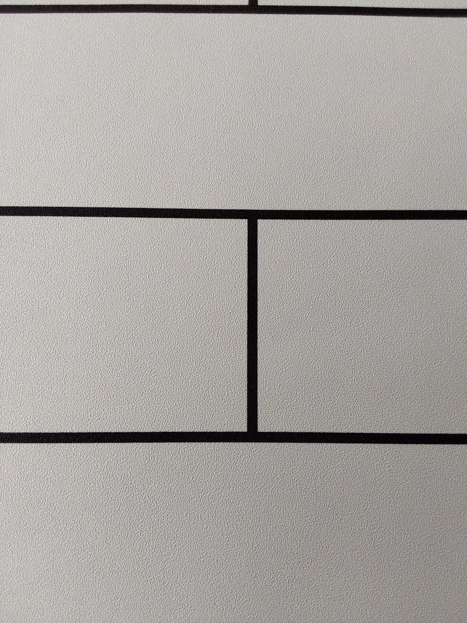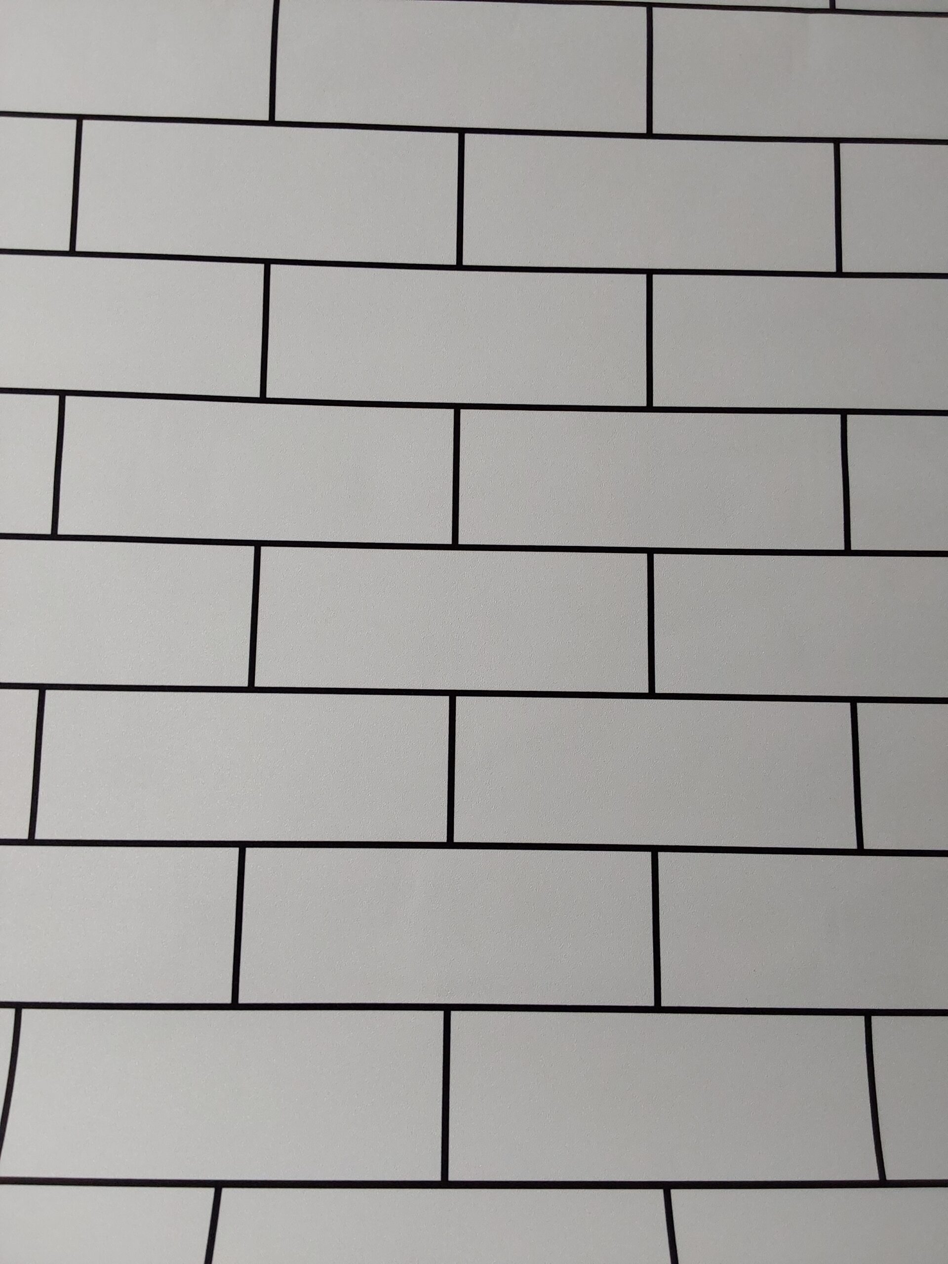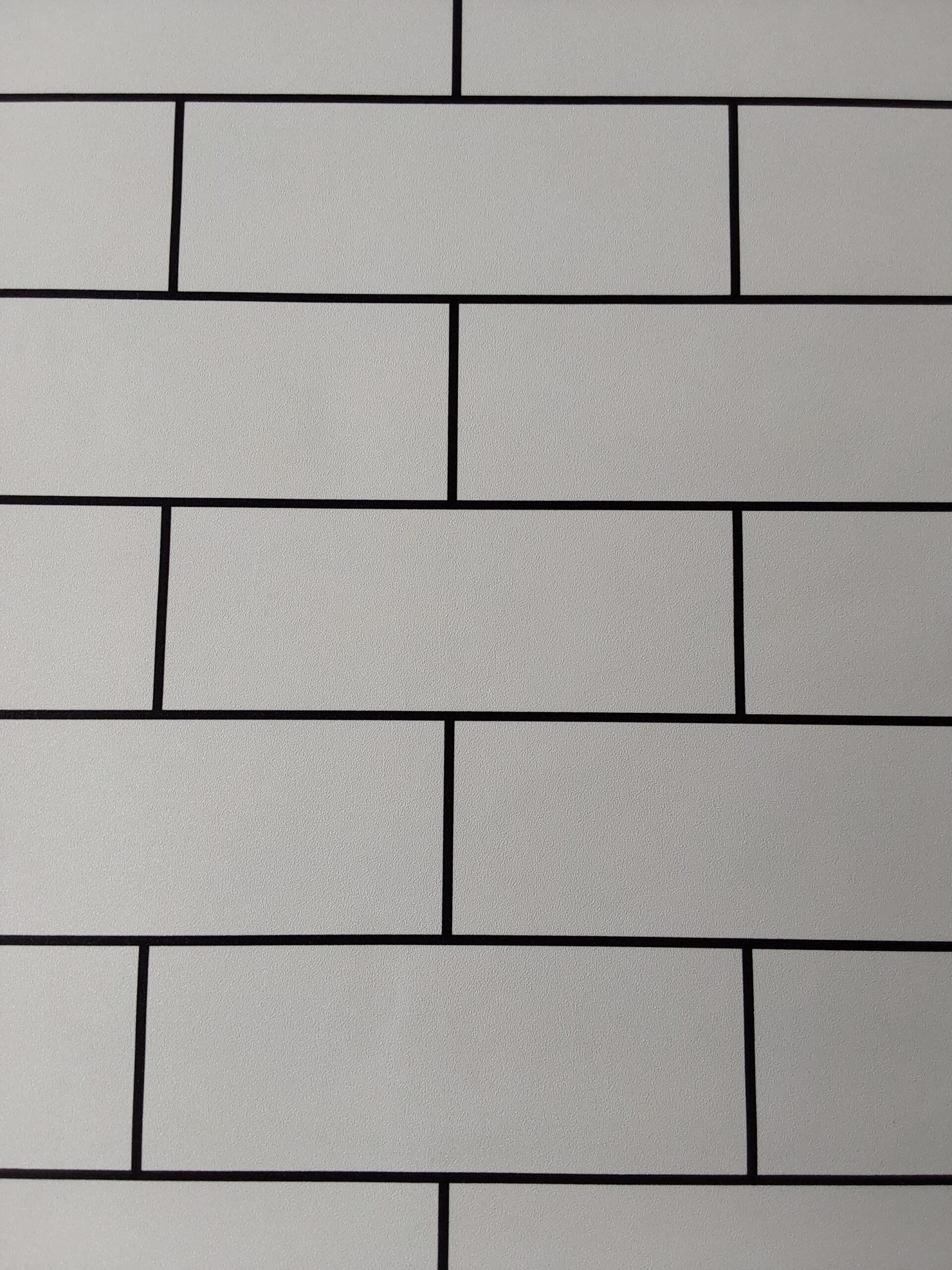 This wallpaper features a clean, minimalist design resembling a classic brick wall. The bricks are white with distinct black outlines, creating a modern and contemporary feel. The uniform pattern offers an organized look, making it suitable for various interior styles, from chic and minimalist to more traditional spaces. It can complement bright or bold colors in furnishings and decor.