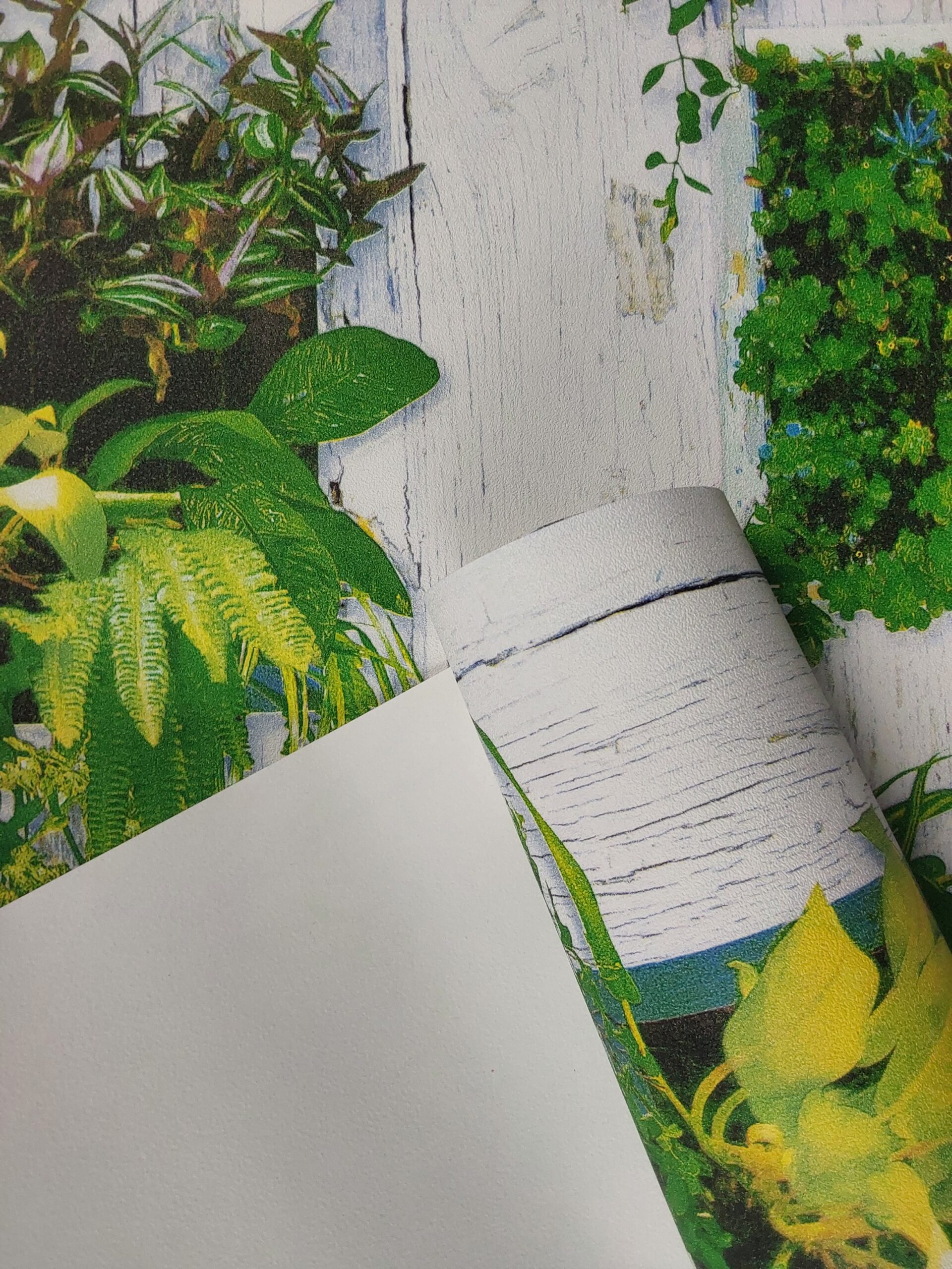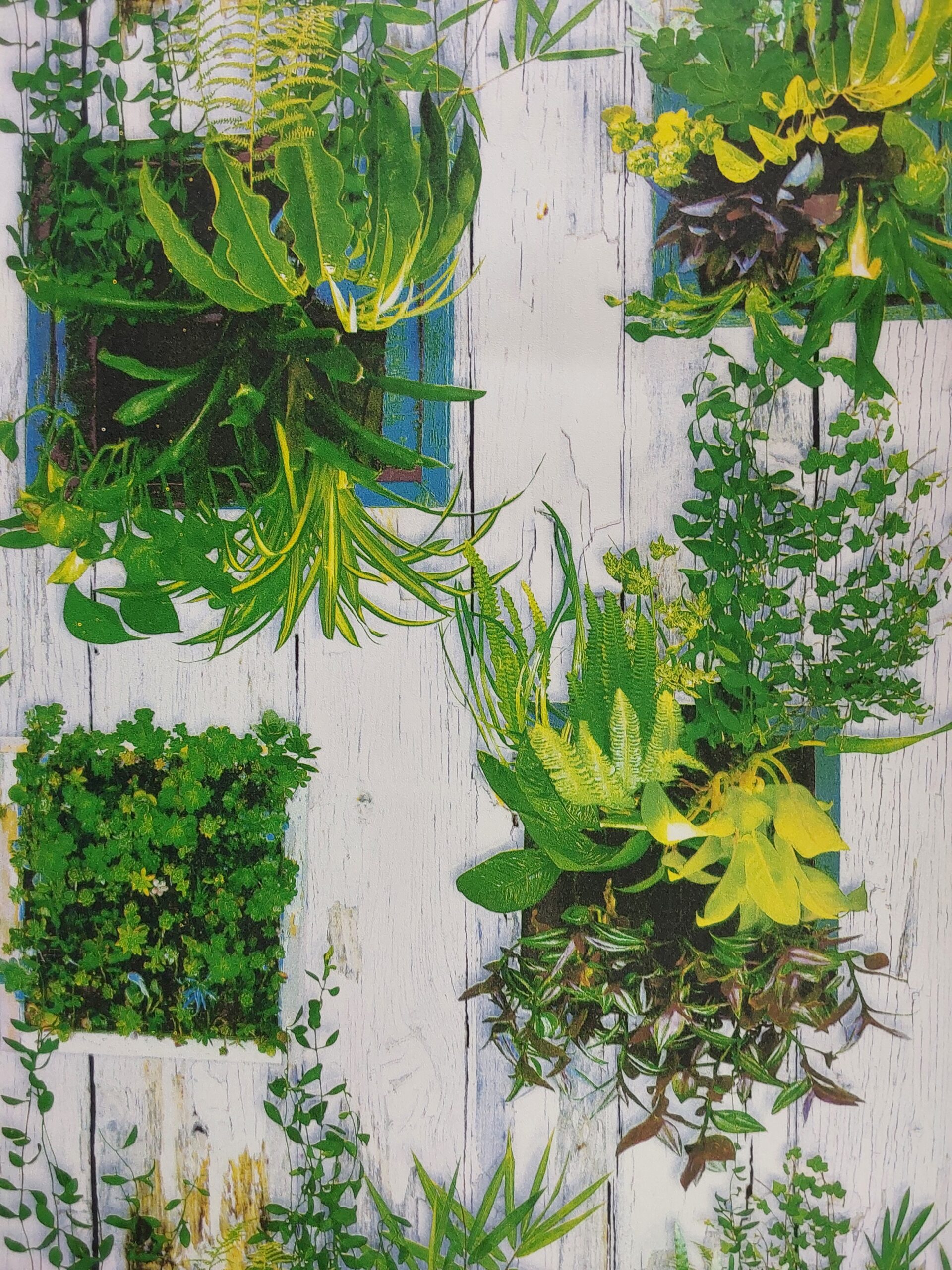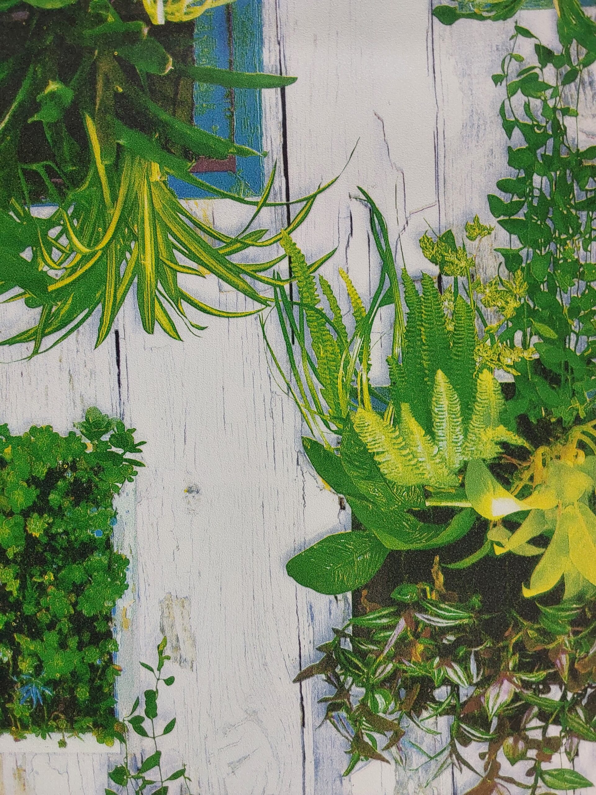 The wallpaper features a vibrant design with an array of lush green plants arranged against a textured, white wooden background. Various types of foliage, including succulents and ferns, are depicted in rectangular shapes, creating a visually appealing, garden-like effect. The green tones are complemented by hints of yellow flowers, adding pops of color and a natural aesthetic reminiscent of a thriving indoor garden. This design would likely bring a fresh and lively atmosphere to any space.