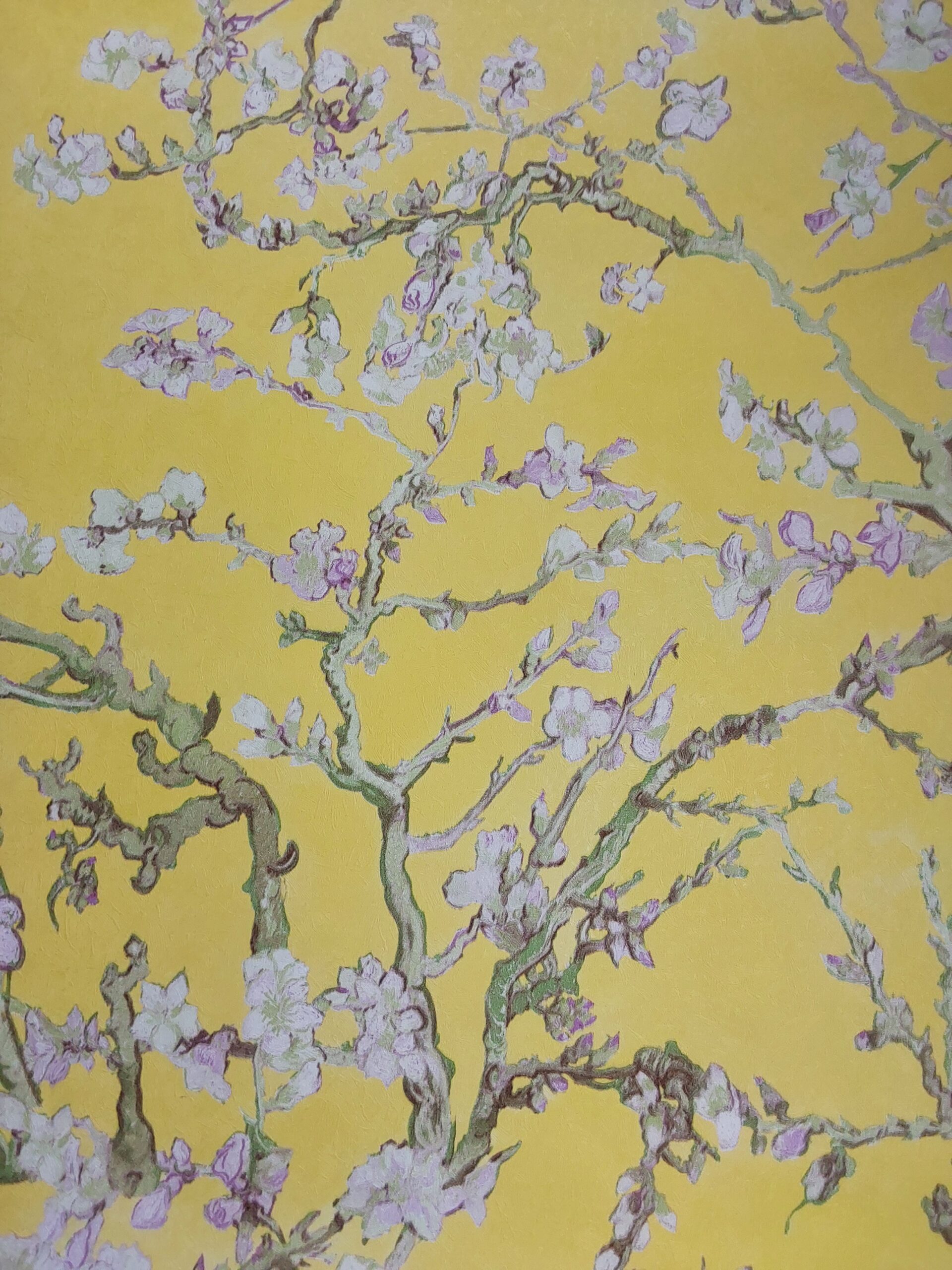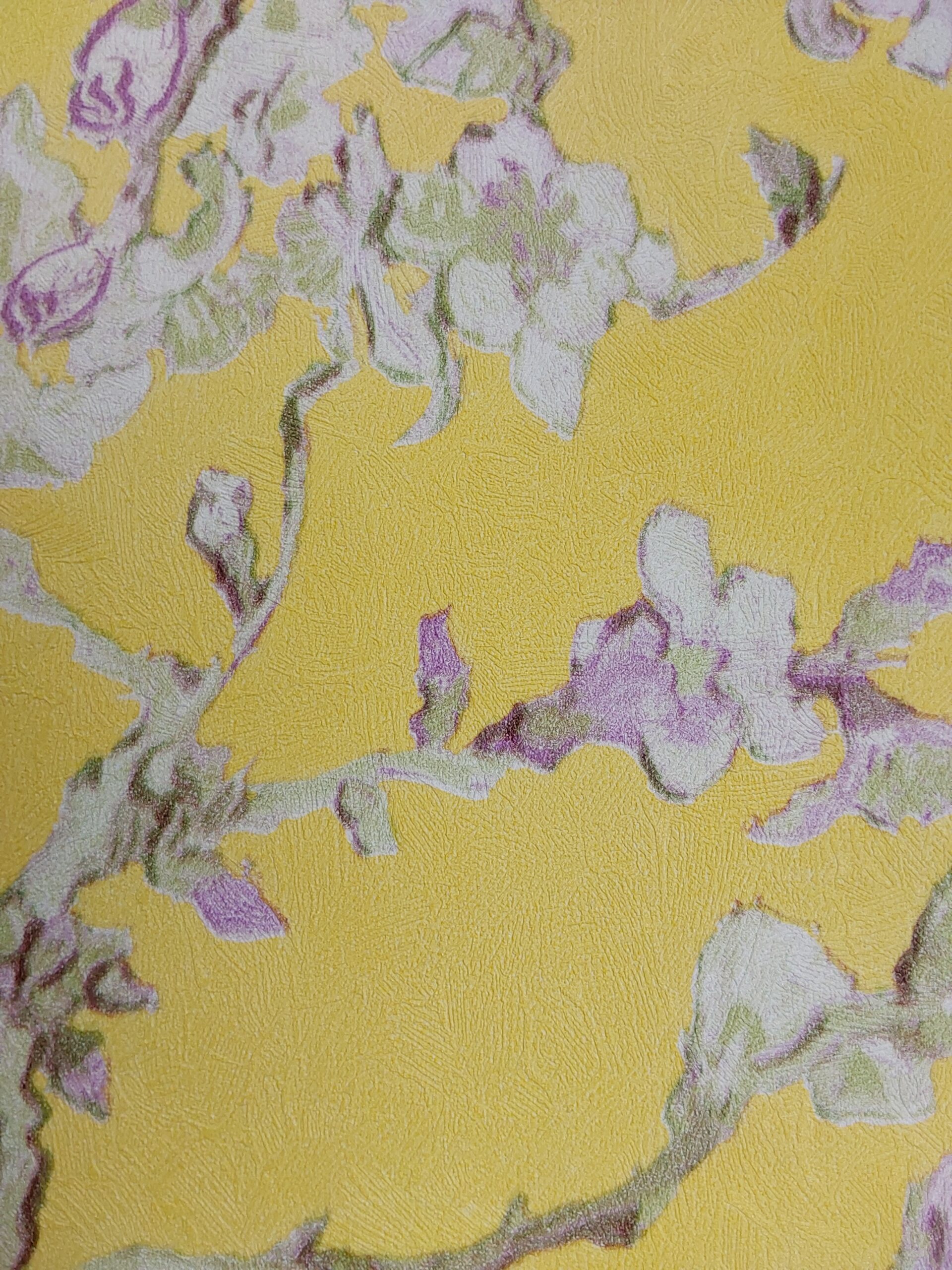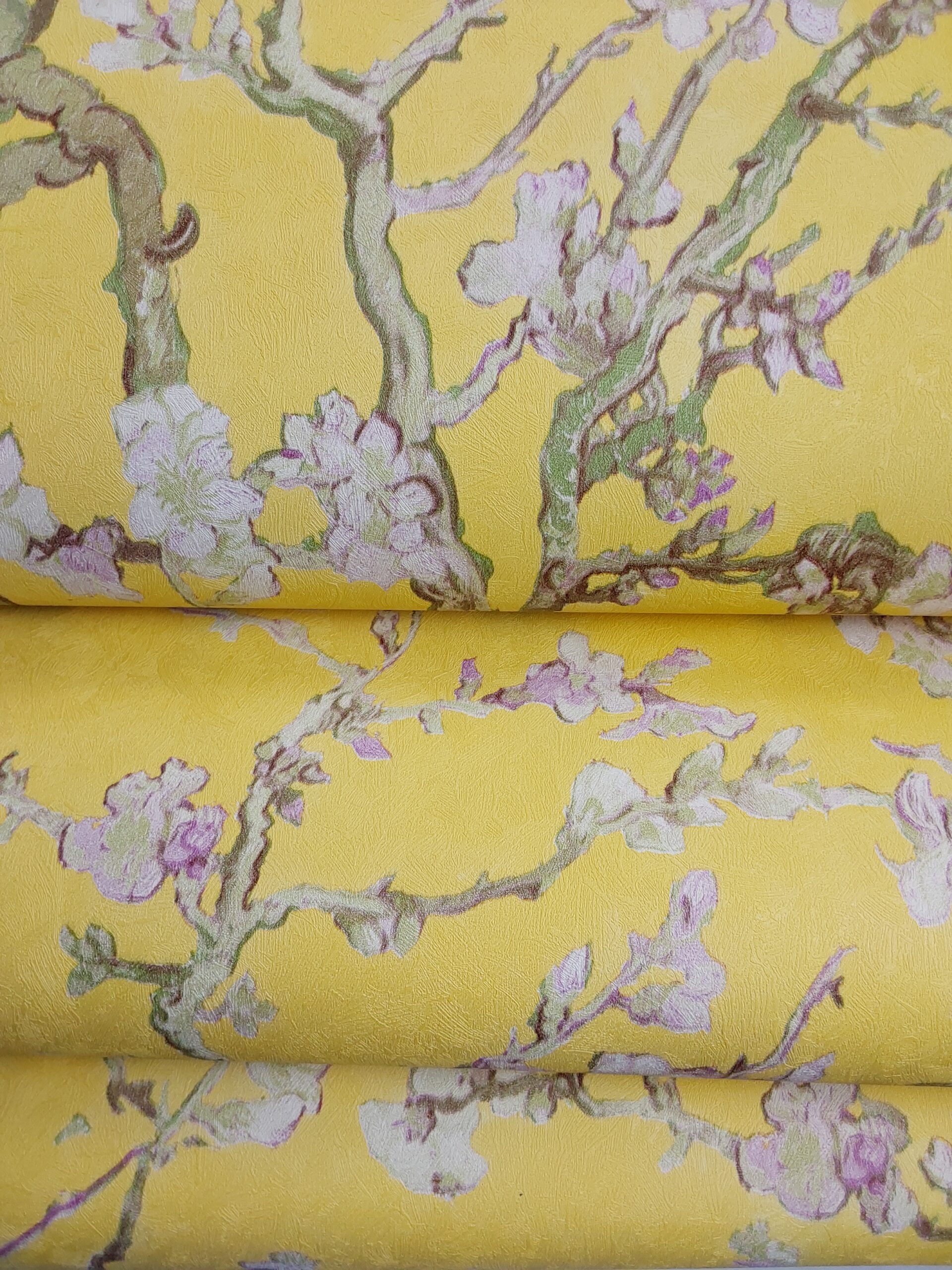 This wallpaper showcases a cheerful yellow background with soft, textured floral patterns in delicate shades of white and lavender. The flowers and branching vines create a light and airy feel, offering a fresh and vibrant touch to any space. The subtle texture adds depth, enhancing the visual interest of the design while maintaining an overall soothing aesthetic. This wallpaper would be ideal for brightening up a room or adding a touch of spring to interior decor.