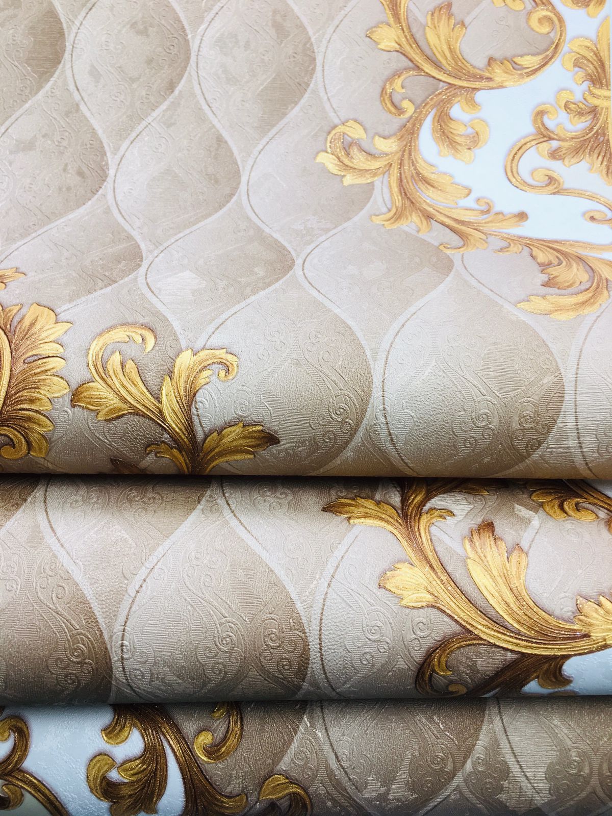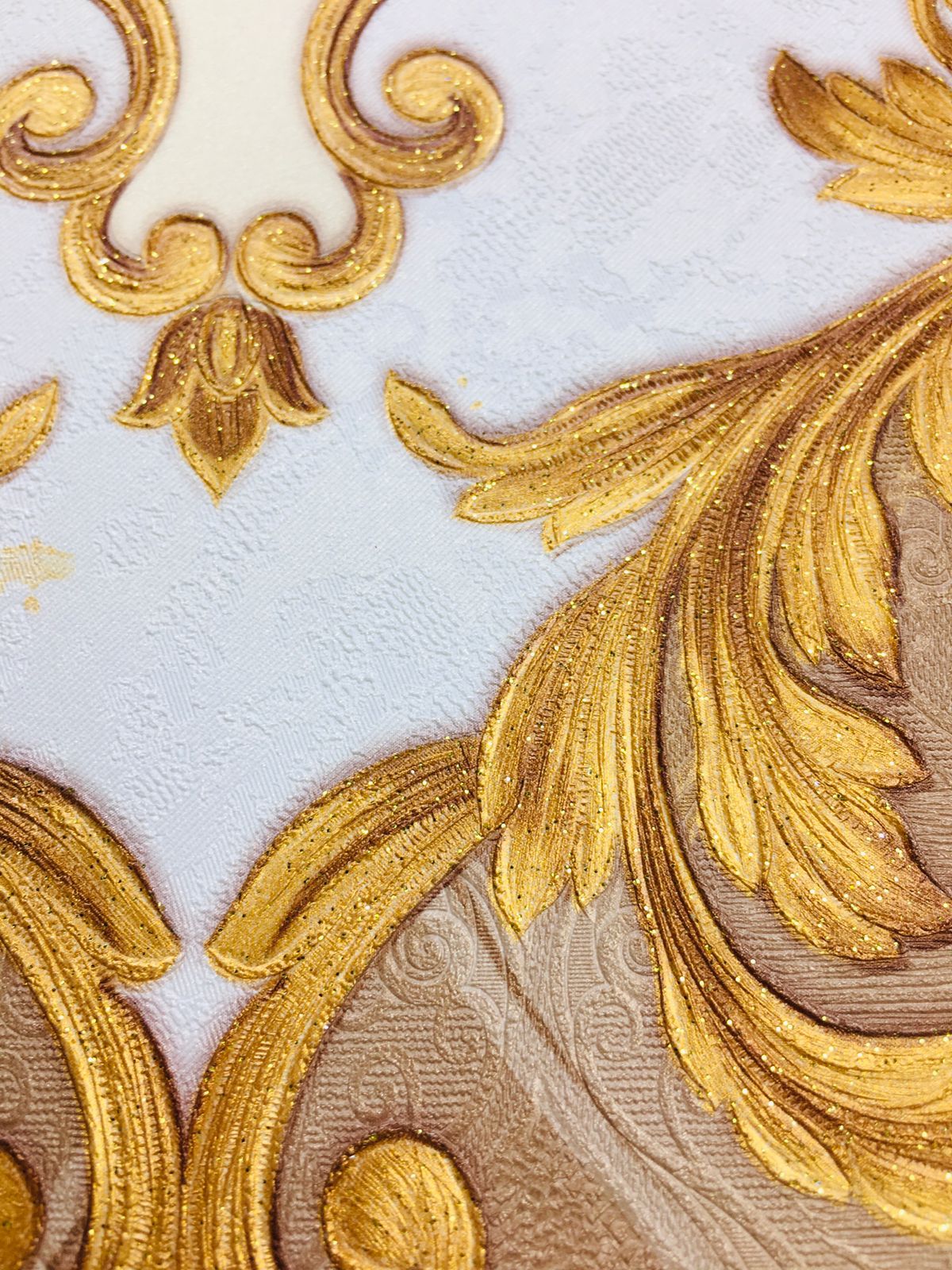 The wallpaper features a sophisticated color palette dominated by rich gold tones complemented by soft, neutral hues. The base colors, likely in shades of cream or pale beige, provide a subtle backdrop that allows the luxurious gold embellishments to shine.