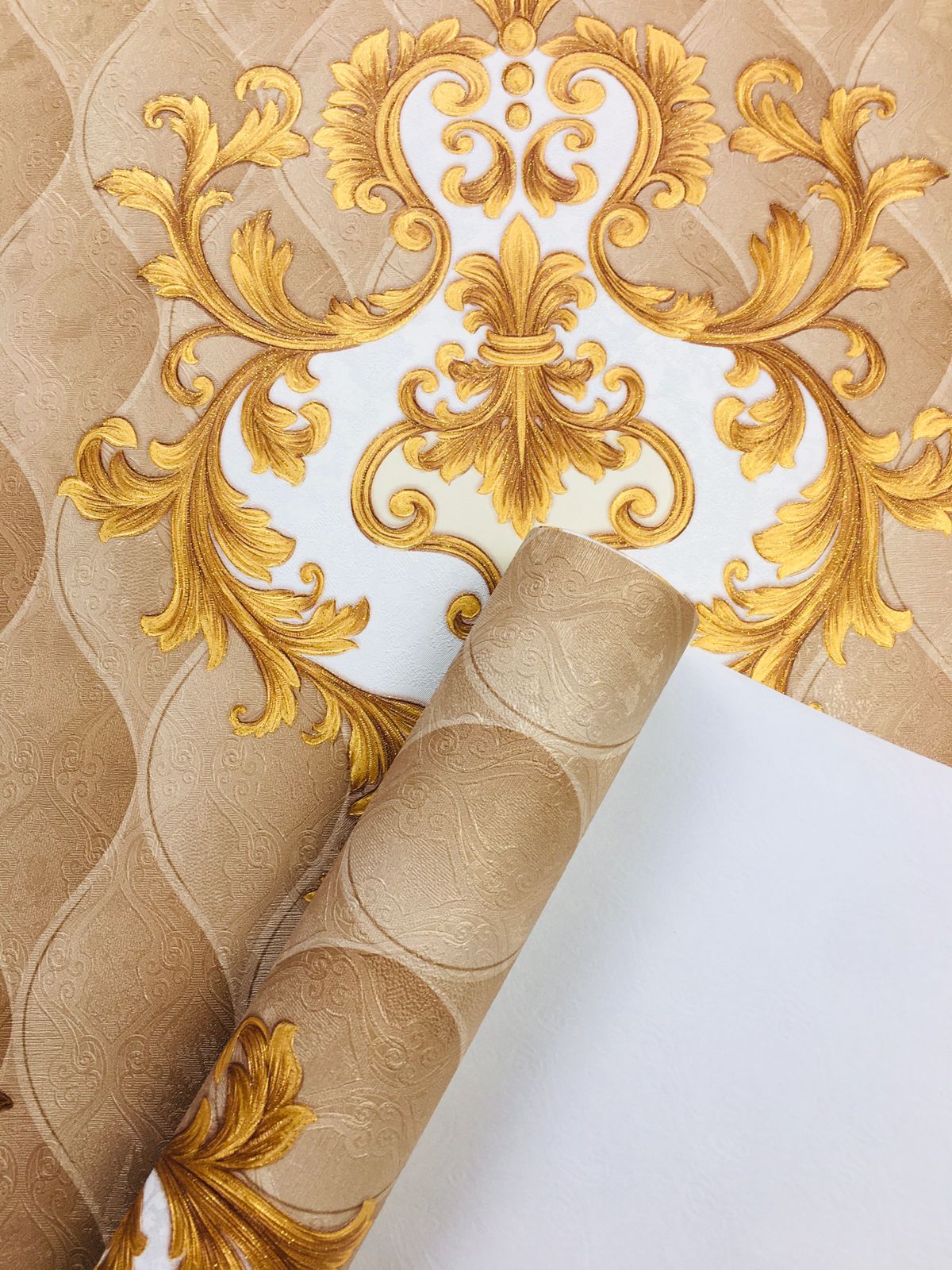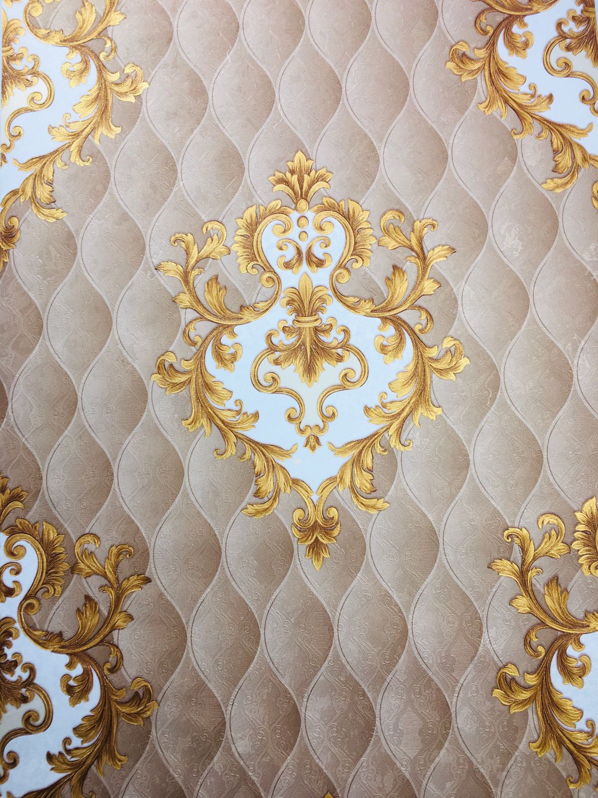 At the center of the design are ornate baroque-style motifs, rendered in a rich gold hue. These motifs are lavishly detailed, featuring swirling curves, floral elements, and luscious scrollwork that evoke a sense of grandeur. The combination of the white elements within the motifs against the gold further enhances the overall design, allowing the patterns to stand out clearly against the beige background.