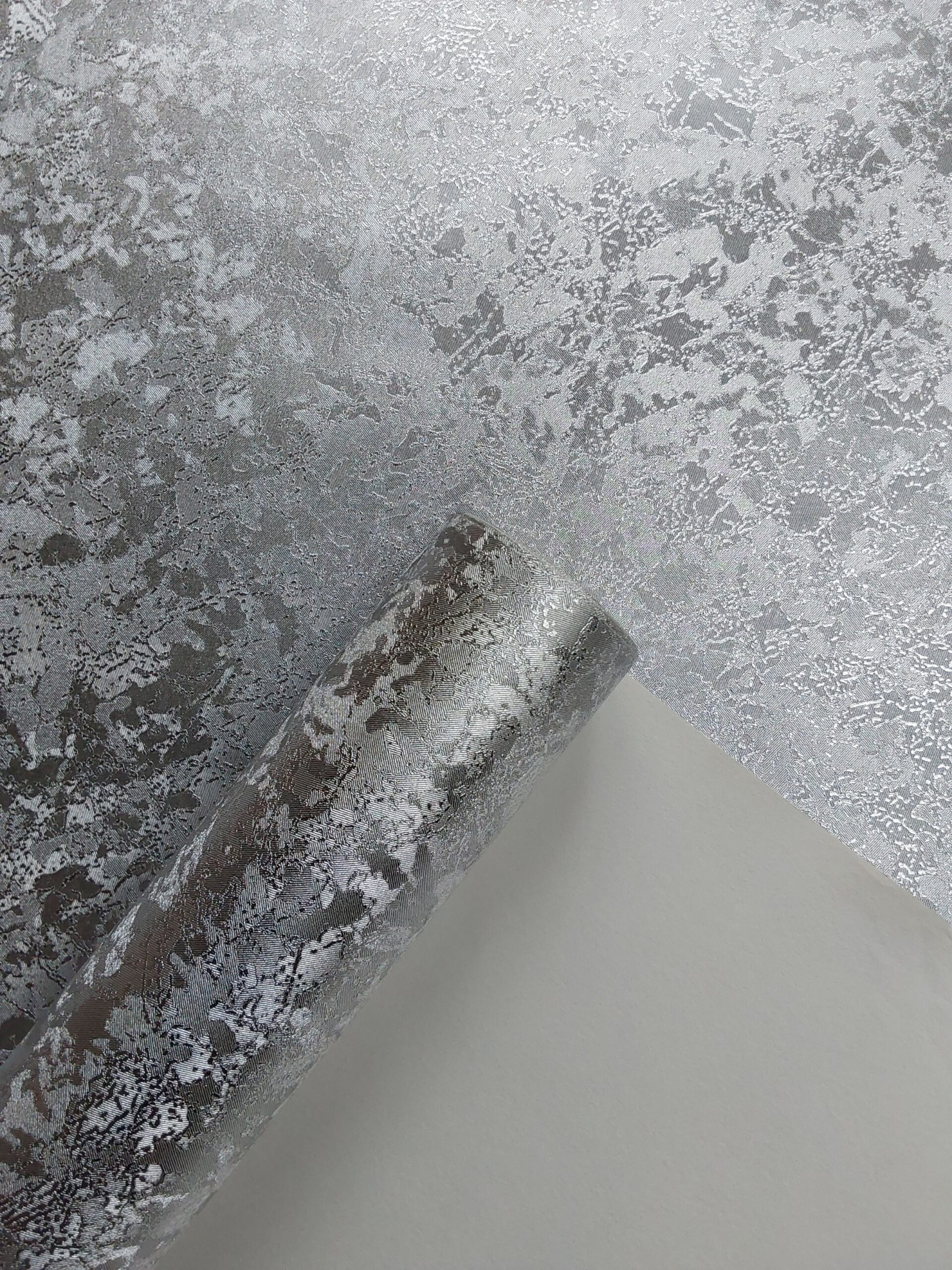 This wallpaper features a sophisticated, textured design with a subtle metallic sheen in shades of silver. The intricate floral patterns are delicately embossed, adding depth and elegance to any space. The interplay of light across its surface creates a dynamic visual effect, making it an excellent choice for modern interiors looking to achieve a luxurious and stylish atmosphere. Ideal for living rooms, bedrooms, or feature walls, this wallpaper enhances decor while maintaining a refined aesthetic.