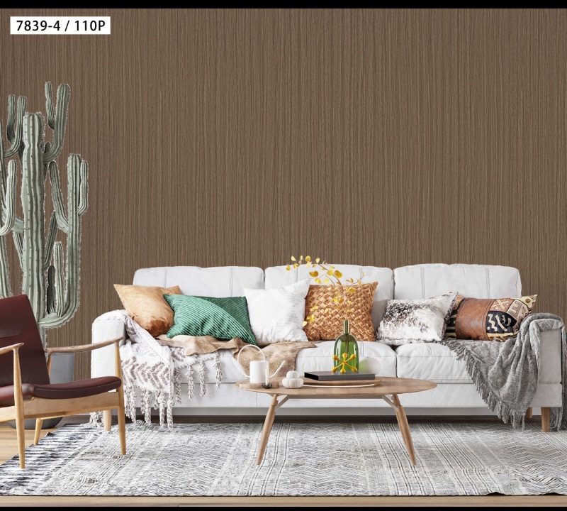 In this setting, the wallpaper serves as an ideal backdrop for a modern living space. A crisp, white sofa adorned with colorful throw pillows adds a pop of brightness against the earthy tones, creating a harmonious blend of nature and contemporary design. The choice of neutral and warm-toned textiles reinforces the inviting ambiance.