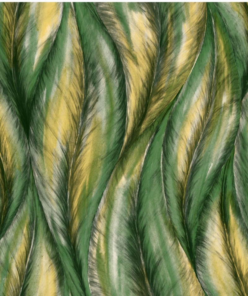 The wallpaper features a vibrant, nature-inspired design consisting primarily of elongated and flowing leaf patterns. The color palette includes rich greens, complemented by hints of yellow and soft gray or cream shades. The leaves exhibit a sense of movement and depth, created with a textured appearance that mimics the natural variations found in real foliage. This design evokes a lush, tropical feel, making it a great choice for creating a lively and refreshing atmosphere in a space. The combination of colors and patterns can add a soothing yet energizing vibe to any room.