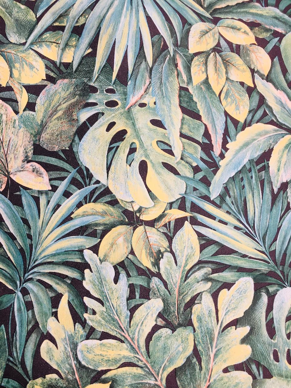 This wallpaper features a vibrant and detailed botanical design, showcasing a variety of tropical leaves. The colors predominantly include shades of green, ranging from deep emerald to lighter mint, accented by touches of yellow that bring warmth to the composition.