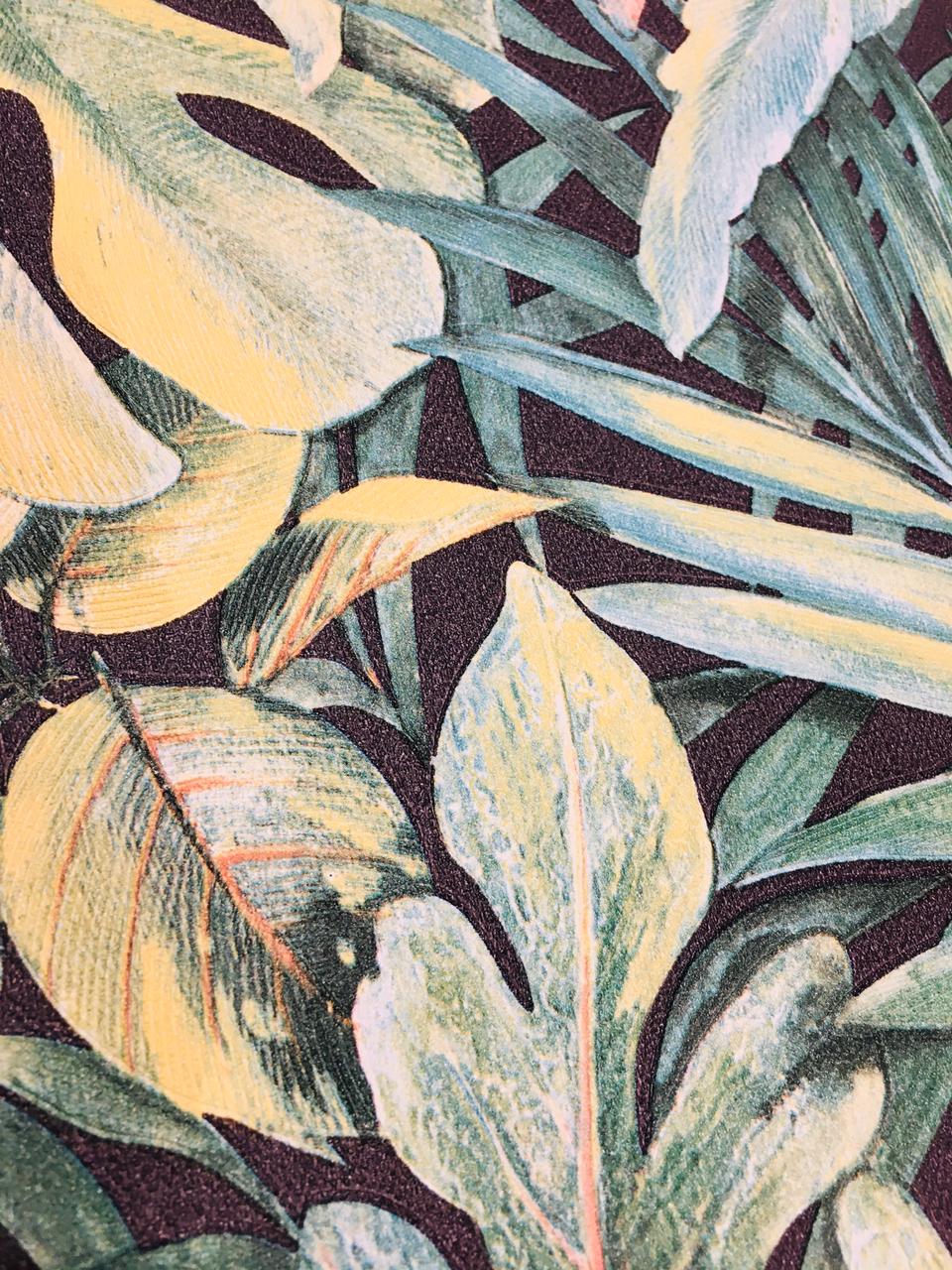 The backdrop appears to be a dark, potentially textured surface which enhances the vividness of the foliage, allowing the colors to pop and creating a striking contrast. This kind of design is often sought after for interiors looking to evoke a sense of nature and tranquility, making it a fitting choice for places such as living rooms, bedrooms, or even outdoor-themed spaces.