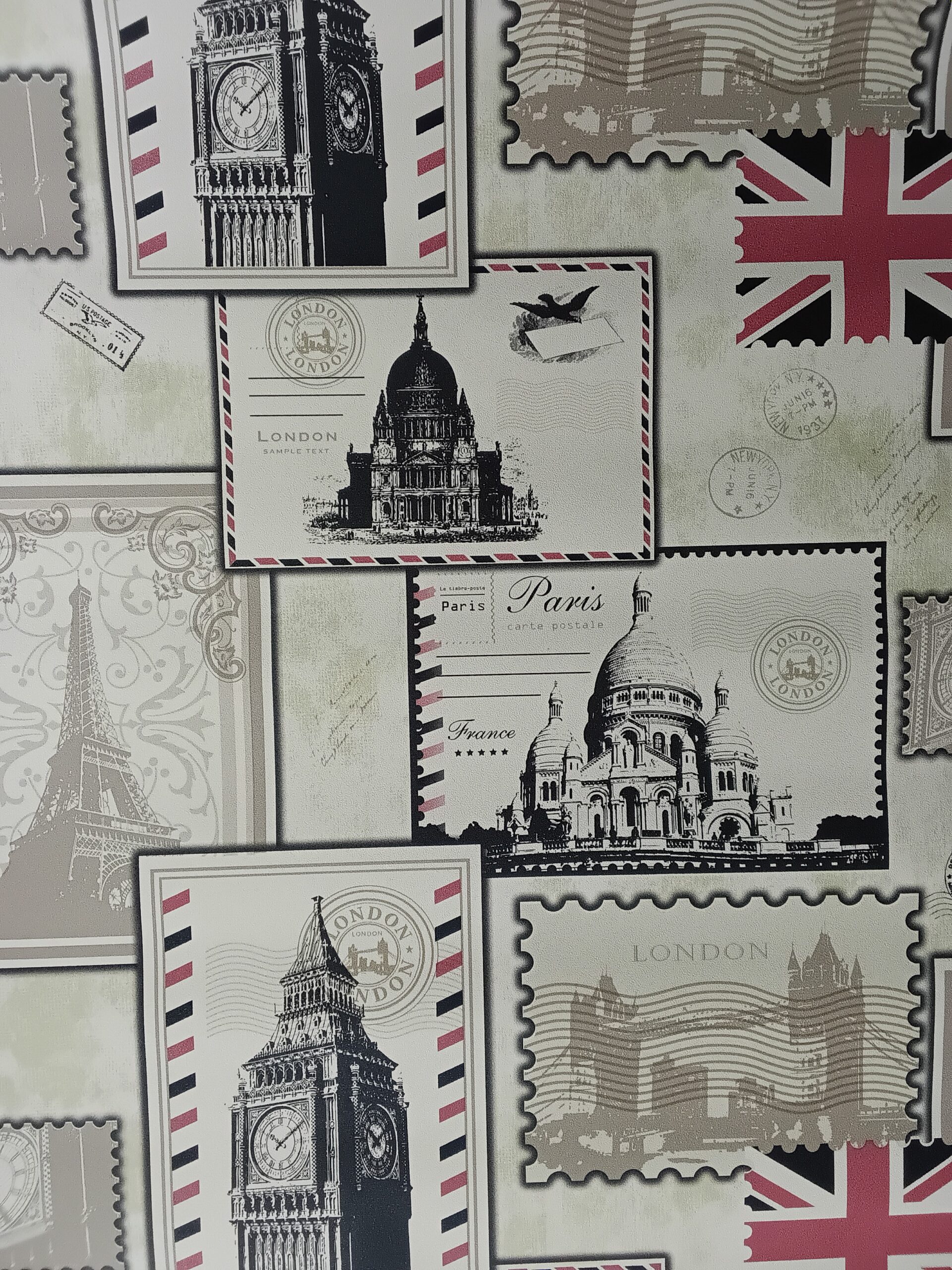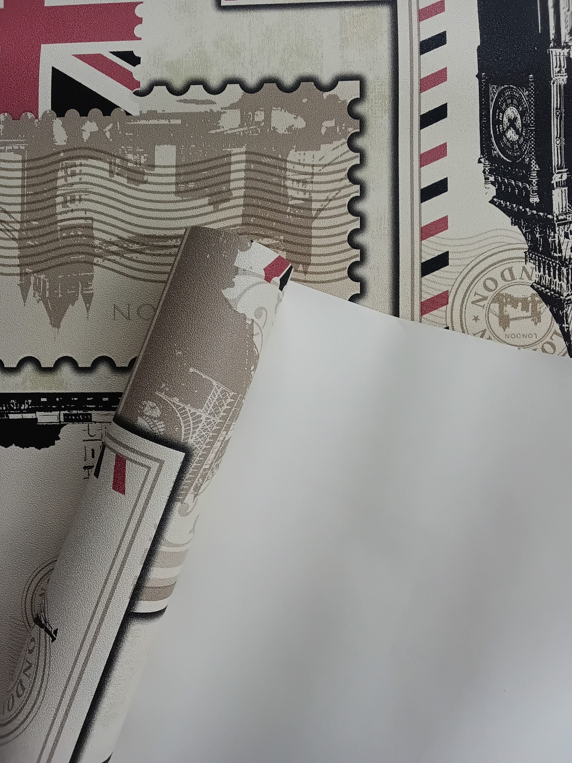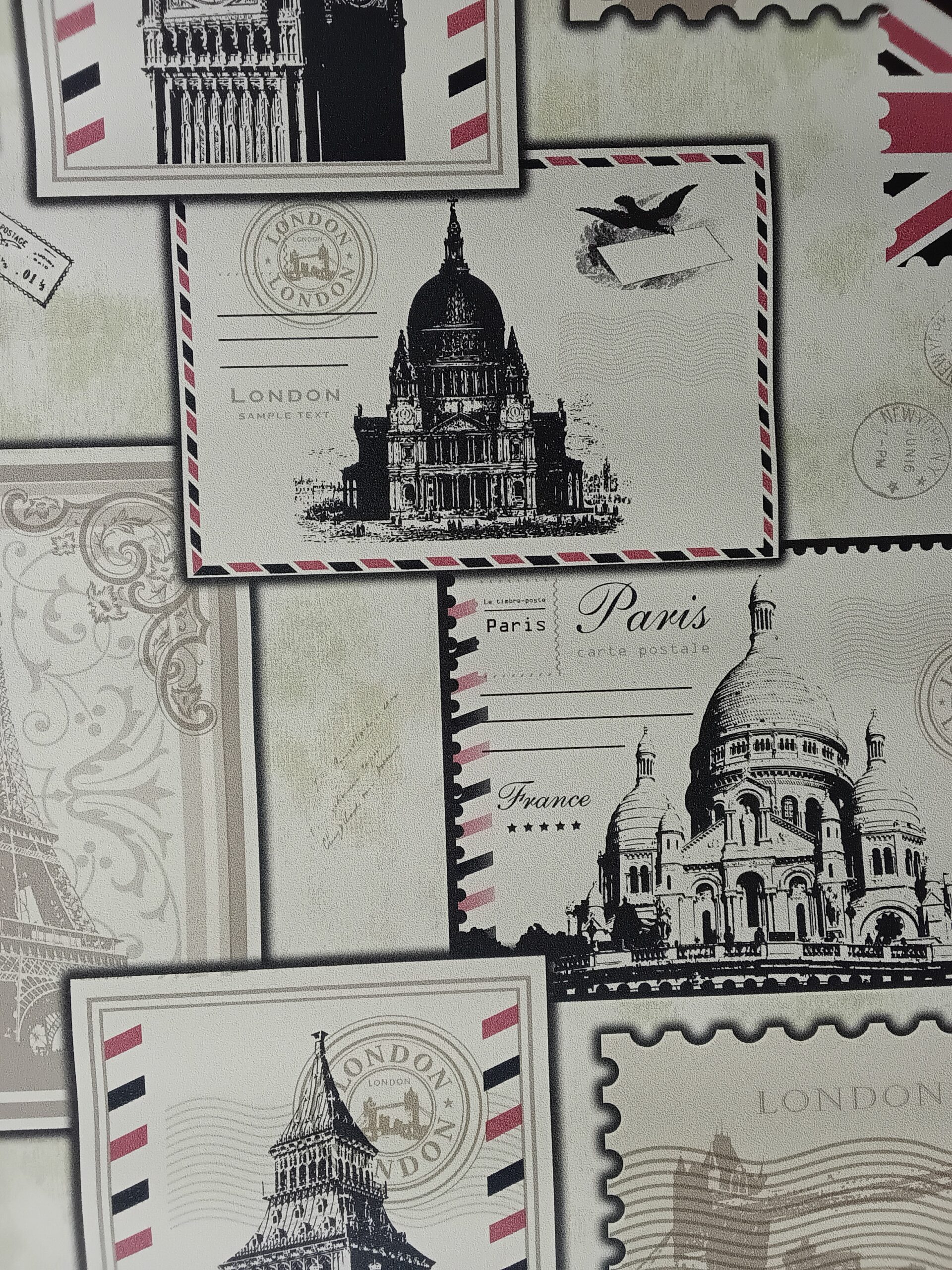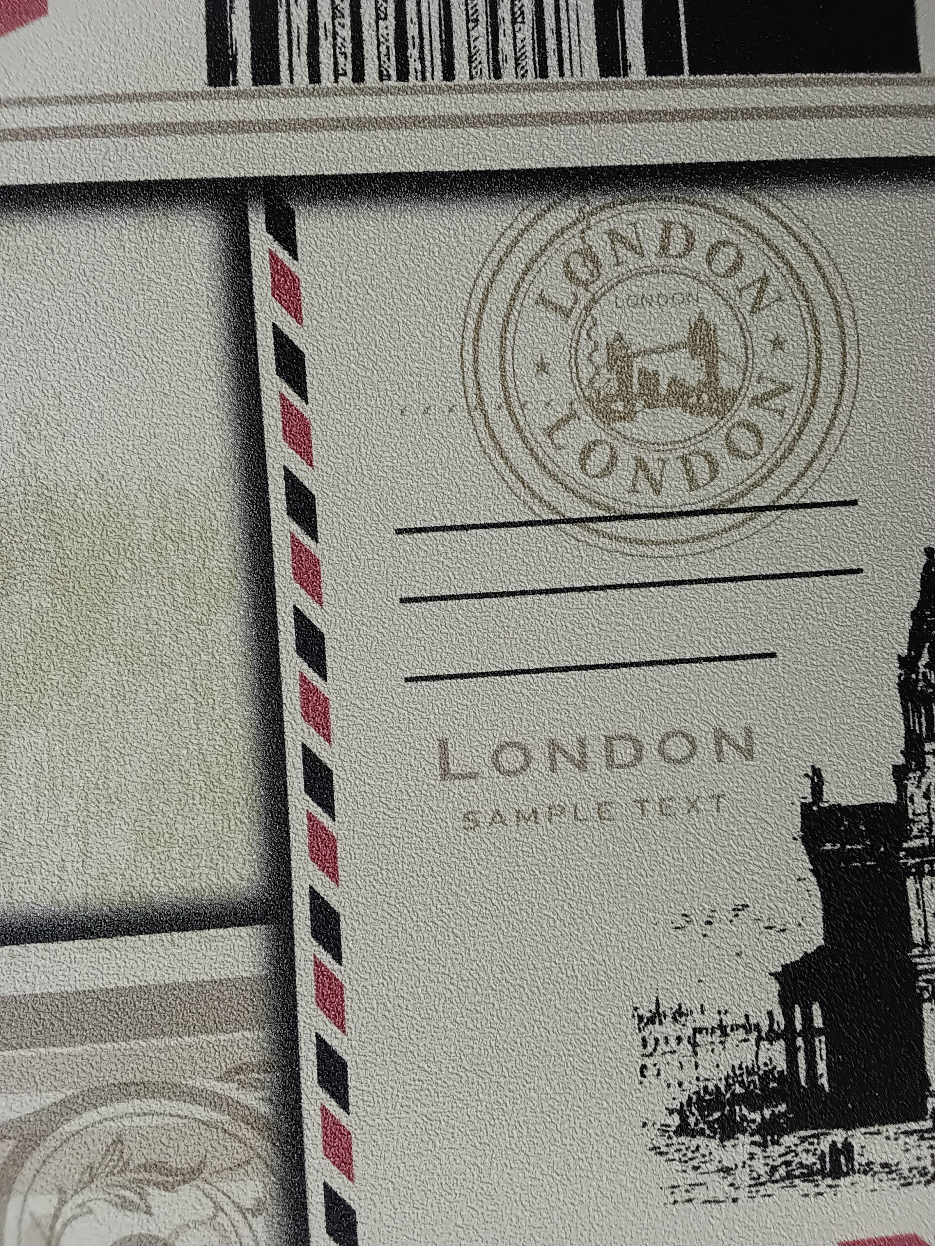 This wallpaper features a vintage postal theme, prominently displaying the word “London” along with a stamp-like design. The background incorporates soft, muted colors, adding a nostalgic feel. There are various graphic elements, such as lines and patterns reminiscent of letters or postcards, which enhance its classic look. Overall, the design evokes a sense of travel and timelessness, perfect for creating a charming and distinct atmosphere in a room.