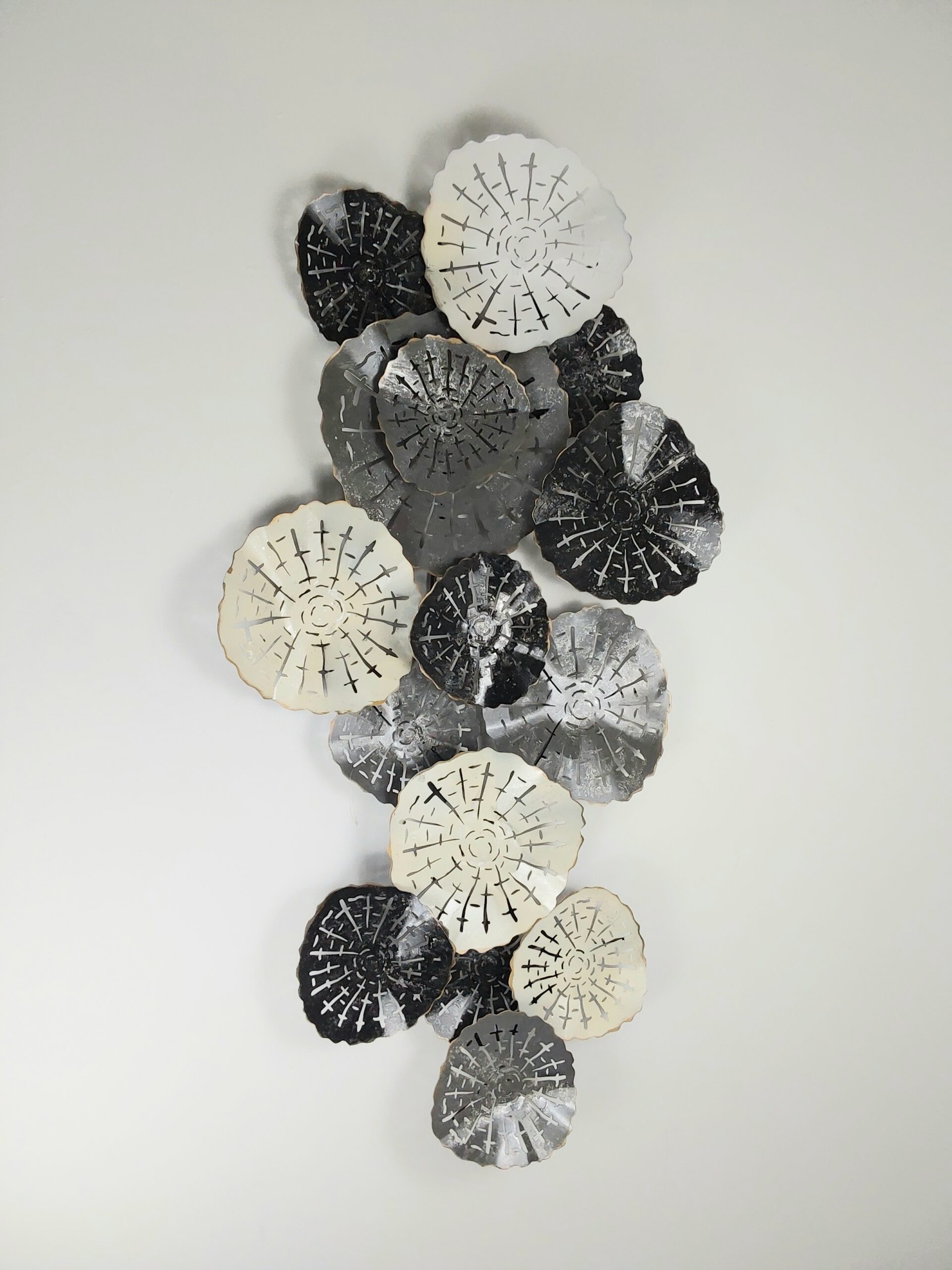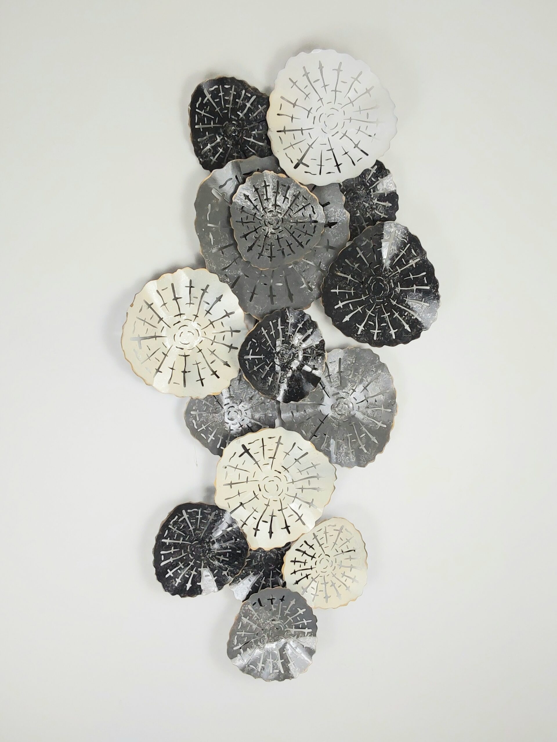 This wall art showcases a striking wall art piece comprised of a series of round, layered discs that give off the impression of abstract three rings. The disks vary in size and arranged in dynamic, overlapping design that creates a 3D effect. The color palette features a mix of black, white, silver and shades of grey, lending modern and monochromatic aesthetic to the piece.