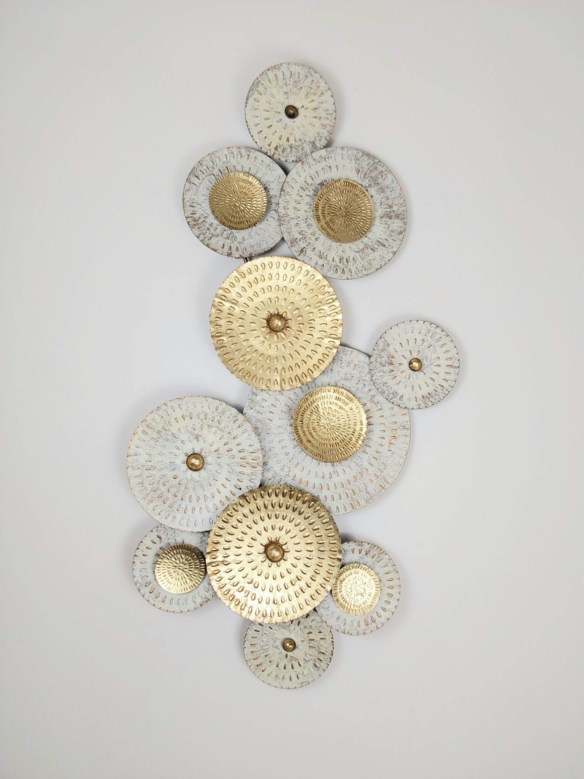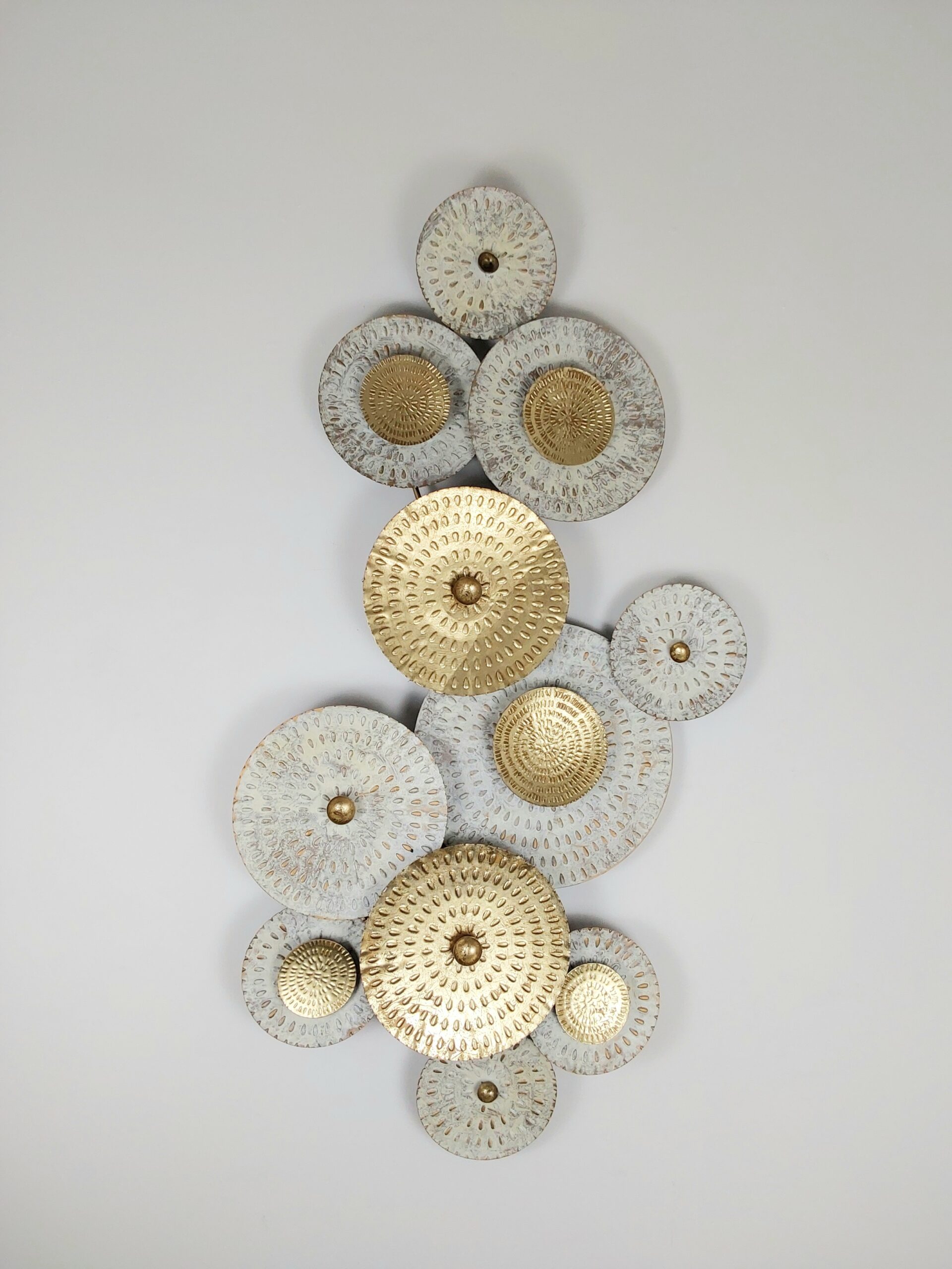 This decorative wall art piece features an array of circular metallic elements of varying sizes. Each circle has textured, patterned surfaces with a combination of gold and silvery-white finish. The intricate detailing on the circles adds a sense of depth and sophisticated.