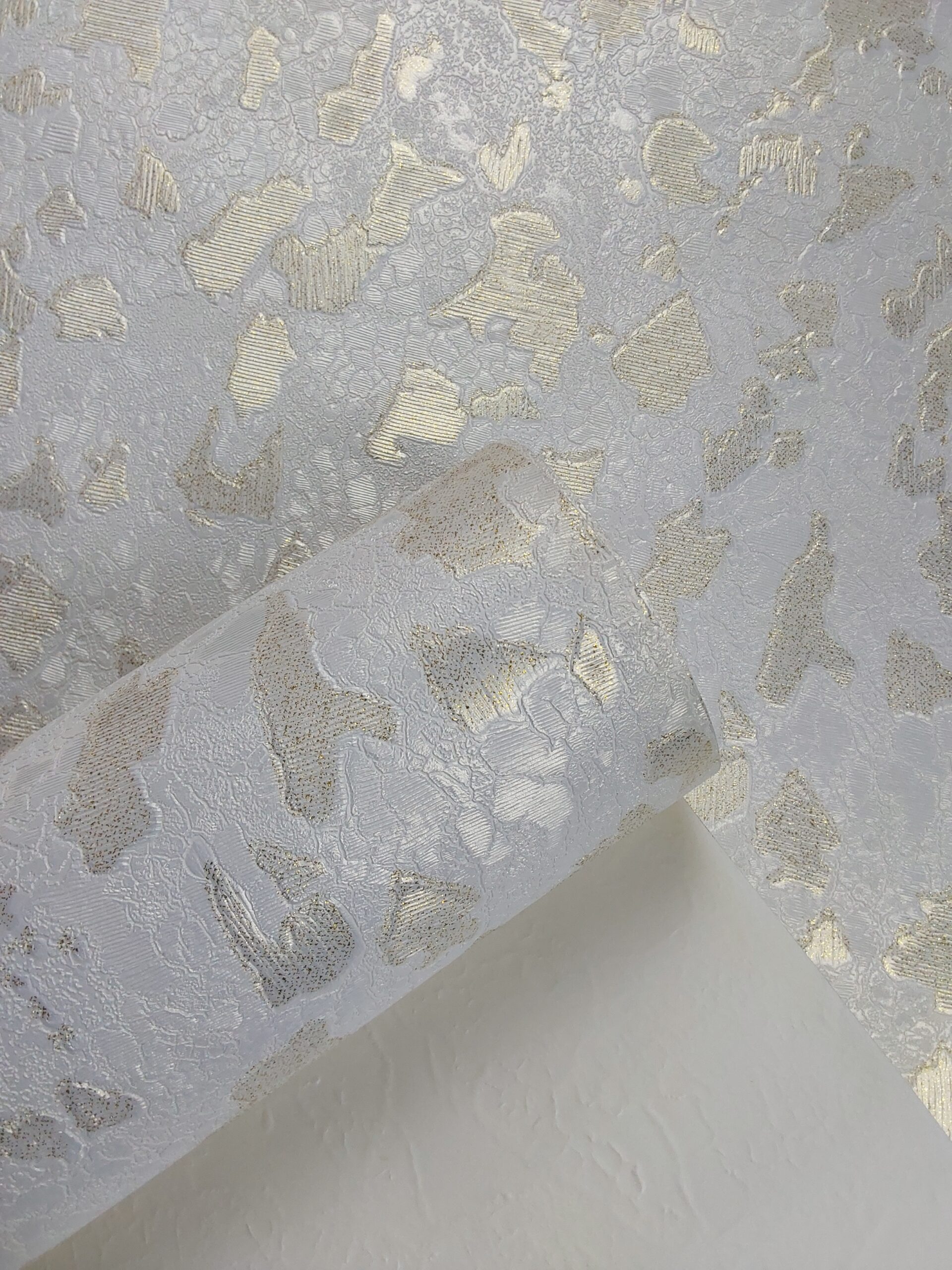 This wallpaper boasts a rich, textured design with a warm beige background. The surface features a combination of embossed and raised patterns that create depth and visual interest. Subtle gold and light cream accents are woven throughout, enhancing the luxurious feel of the design. The organic shapes and layered textures give it a refined yet contemporary appearance, making it a perfect addition to elegant spaces such as living rooms, dining areas, or bedrooms.