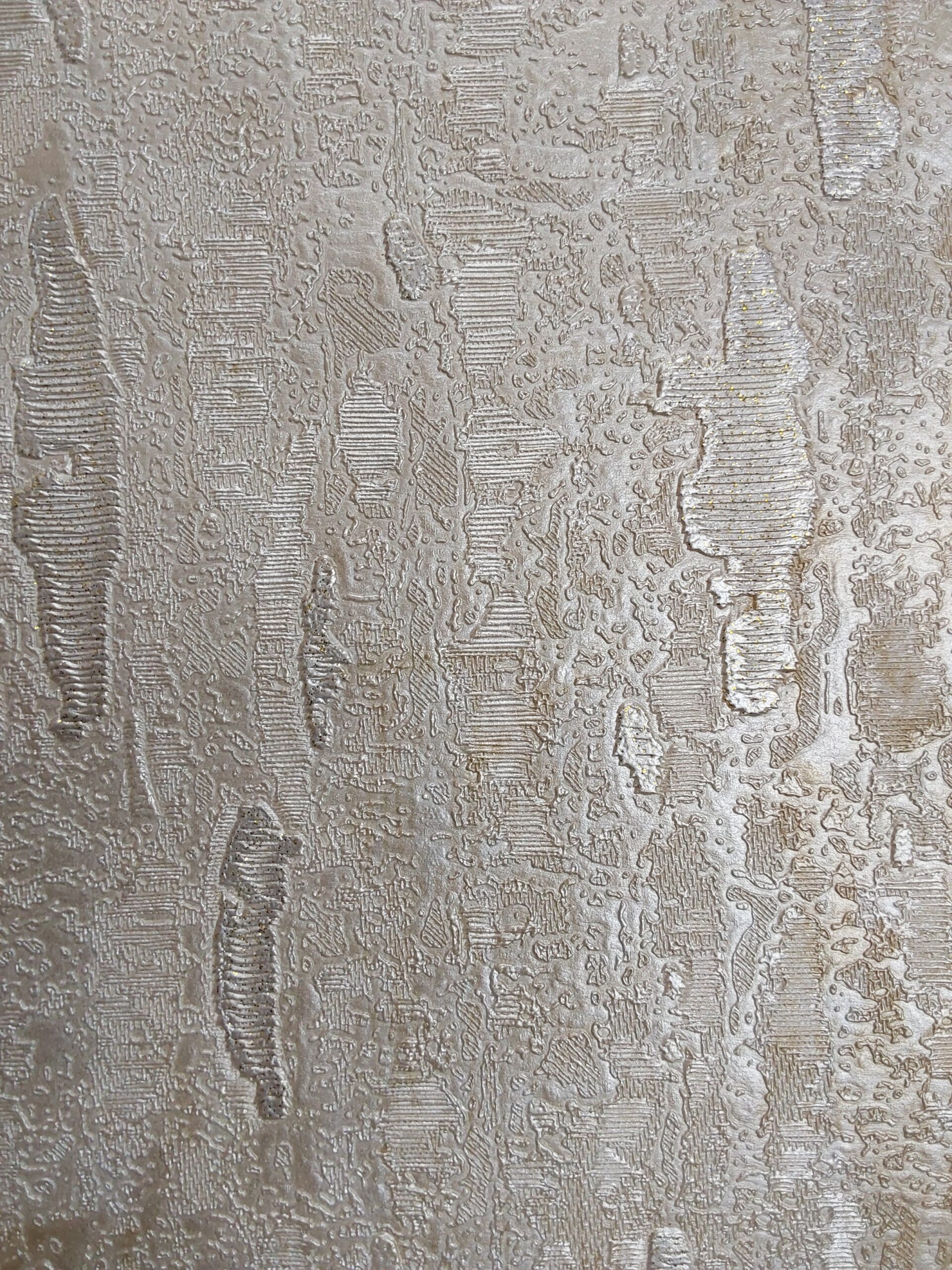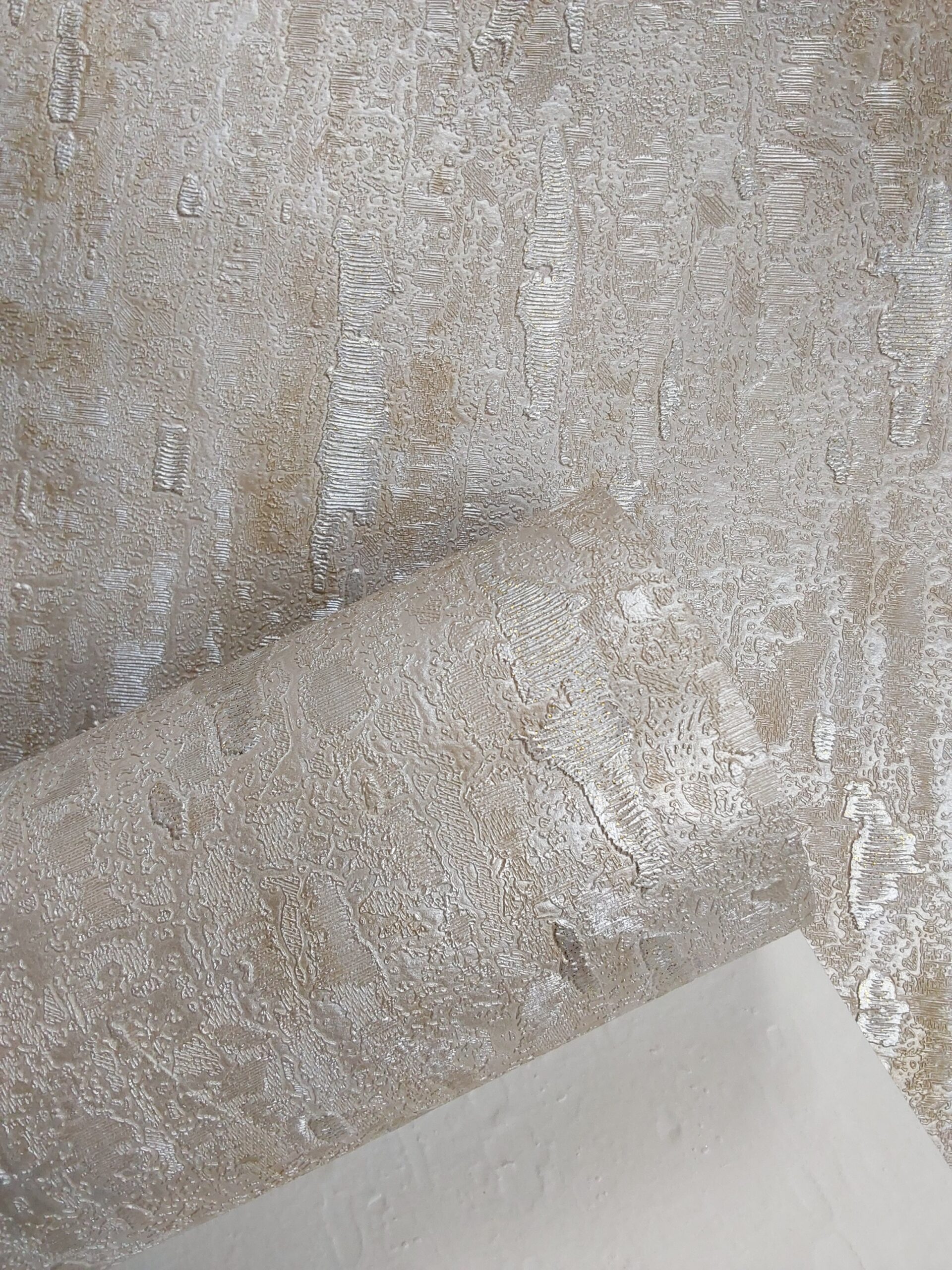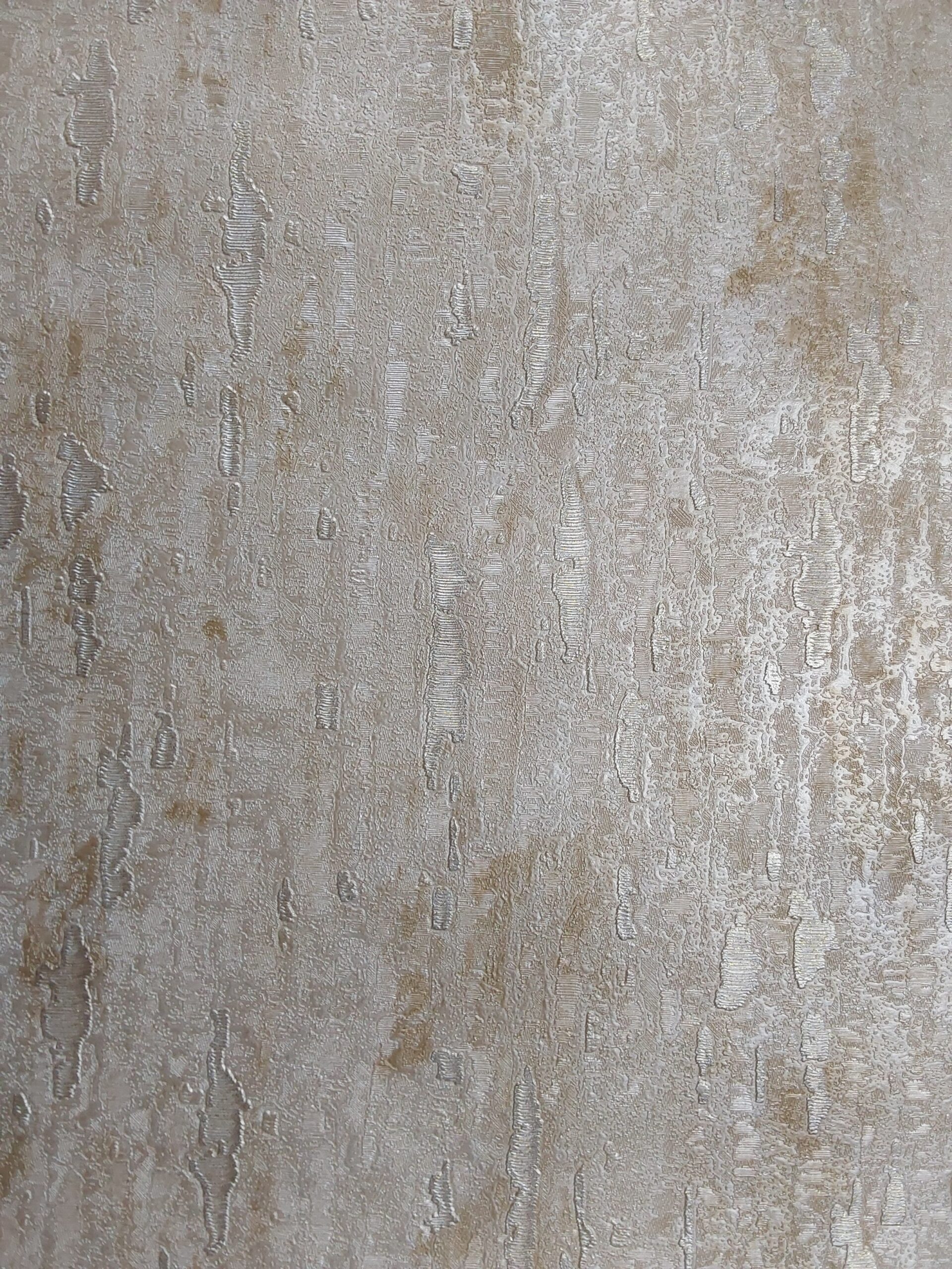 This wallpaper features a textured design with a sophisticated, subtle color palette. The predominant tones are warm beige and light gold, creating an elegant and inviting atmosphere. The surface has a raised, bark-like texture that adds depth and dimension, enhancing the visual interest.
