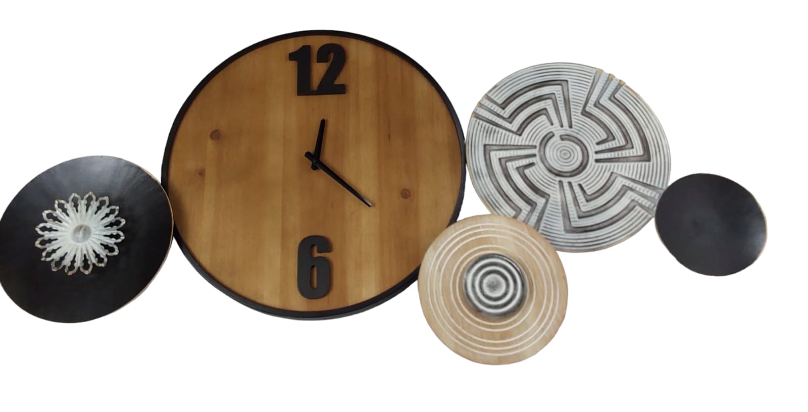Contemporary wall clock with artistic artistic accents Color: Warm wood,Black, white and neutral Accent